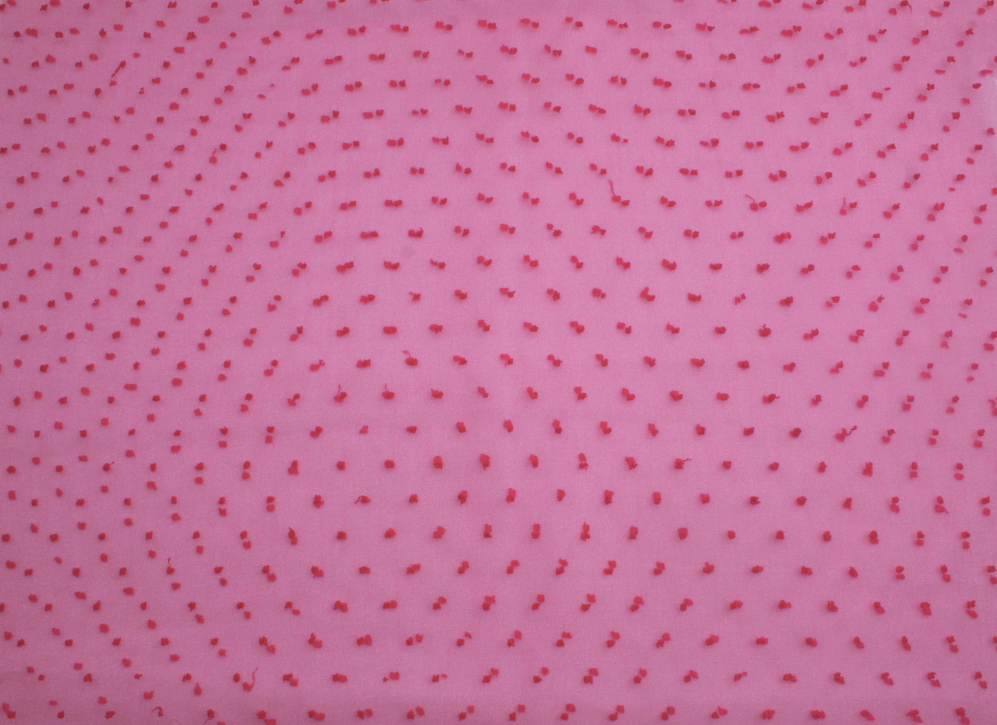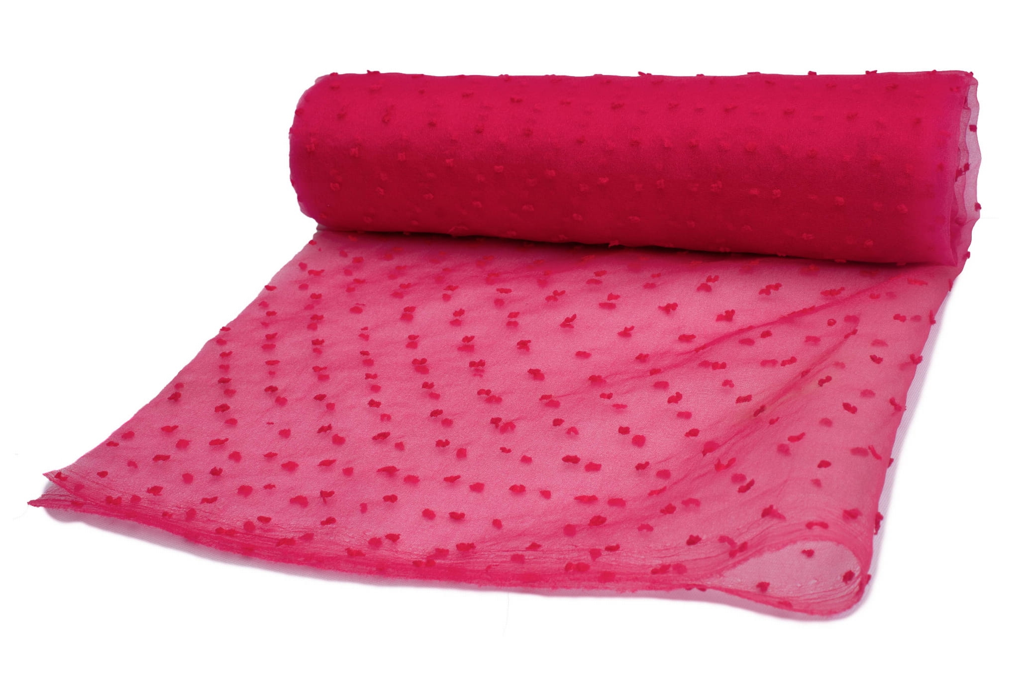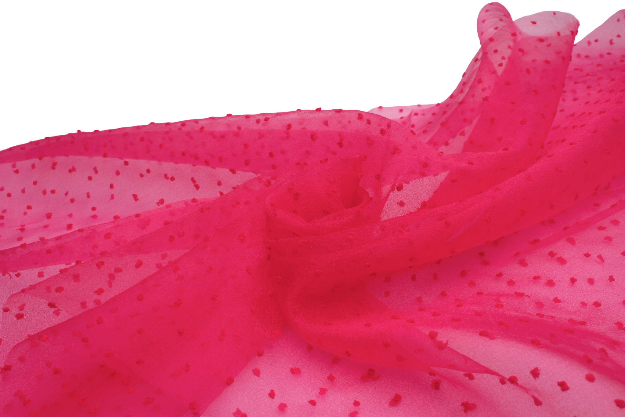 Organza wurde traditionell aus Seidengarn hergestellt. Derzeit werden für seine Herstellung Baumwolle und synthetische Fasern wie Polyester oder Nylon verwendet. Sein Name stammt von der Stadt Urgench in Turkmenistan. Es ist sehr zart, dünn und transparent. Ein charakteristisches Merkmal von Organza ist eine leicht steife und glänzende Textur, die sich beliebig formen und in die gewünschten Formen arrangieren lässt, was es zu einem perfekten Dekorationselement macht. Eine leicht gekreppte Struktur und aufgestickte Punkte unterbrechen die recht versteinerte Form des klassischen Organzas. Der veränderte Organza wirkt luftig, leicht und modern.