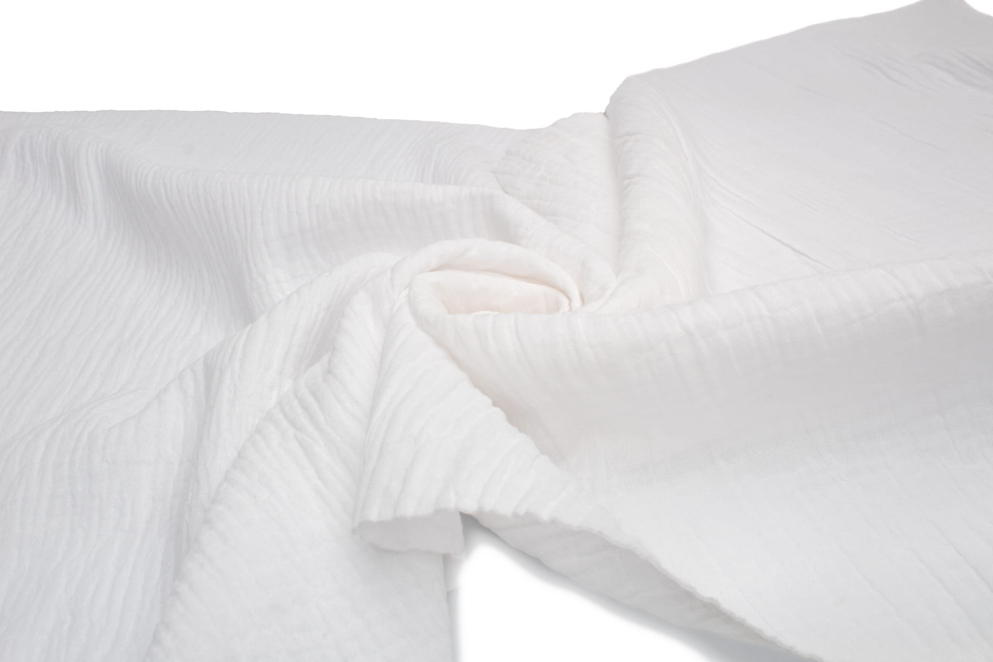 Musselin zeichnet sich durch außergewöhnliche Subtilität aus. Ursprünglich wurde es aus natürlichen Ressourcen hergestellt: Seide, Baumwolle, Leinen oder Wolle. Derzeit können Sie sich mit einer anderen Zusammensetzung treffen, aber die wünschenswerteste ist 100% Baumwolle. Wir können 3 Arten von Musselin unterscheiden: Single, Double und Triple Gaze, wobei die Namen die Anzahl der im Material vorhandenen Schichten angeben. Die einzelnen Lagen sind mit einer lockeren Leinenbindung gewebt und erzeugen durch ihre Verbindung eine charakteristische Faltenbildung des Stoffes. Double Gauze Baumwoll-Musselin ist dünn, leicht und sehr luftig. Dank zweier Materialschichten ist es blickdicht. Dieser Stoff ist sicher für die Haut: Seine natürliche Zusammensetzung verursacht keine Allergien, während die weichen Fasern keine Reizungen verursachen. Das Material sorgt für eine sehr gute Luftzirkulation und lässt die Haut an heißen Tagen atmen. Es ist hygroskopisch, was bedeutet, dass es viel Wasser aufnehmen kann, während es dank seiner lockeren Webart recht schnell trocknet. Die oben genannten Funktionen ermöglichen die breite Verwendung von Musselin.