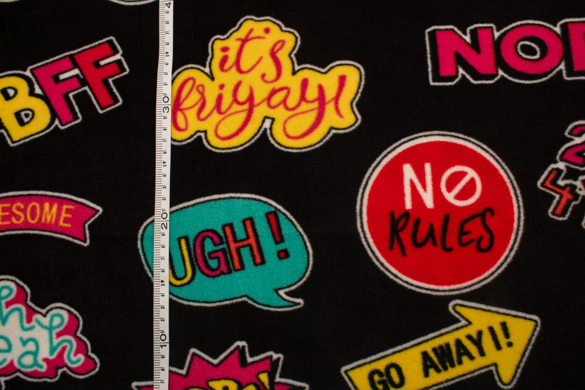 Fleecestoff besteht aus Polyester-Kunstfasern. Künstliche Fasern verleihen dem Stoff hydrophobe Eigenschaften sowie eine hohe Knitterfestigkeit und hohe Elastizität. Durch diese Eigenschaften trocknet das Vlies sehr schnell und muss nicht gebügelt werden. Der wichtigste Vorteil von Fleece ist jedoch der hervorragende Kälteschutz. Dieses bedruckte Fleece wurde mit der DTY-Technologie hergestellt, sodass wir Ihnen ein hochwertigeres Material anbieten können. DTY-Fleece hat eine glattere und weichere Textur als klassisches Fleece. Es pillt nicht, ist sehr widerstandsfähig und langlebig. Der Stoff erstreckt sich über die Breite. Das Vlies ist mit einem langlebigen, jugendlichen Aufdruck mit Aufschriften und Aufklebern verziert. Der Druck erfolgt auf beiden Seiten, allerdings ist zwischen der linken und rechten Stoffseite ein deutlich sichtbarer Unterschied zu erkennen. Erhältlich in 3 Farbversionen.