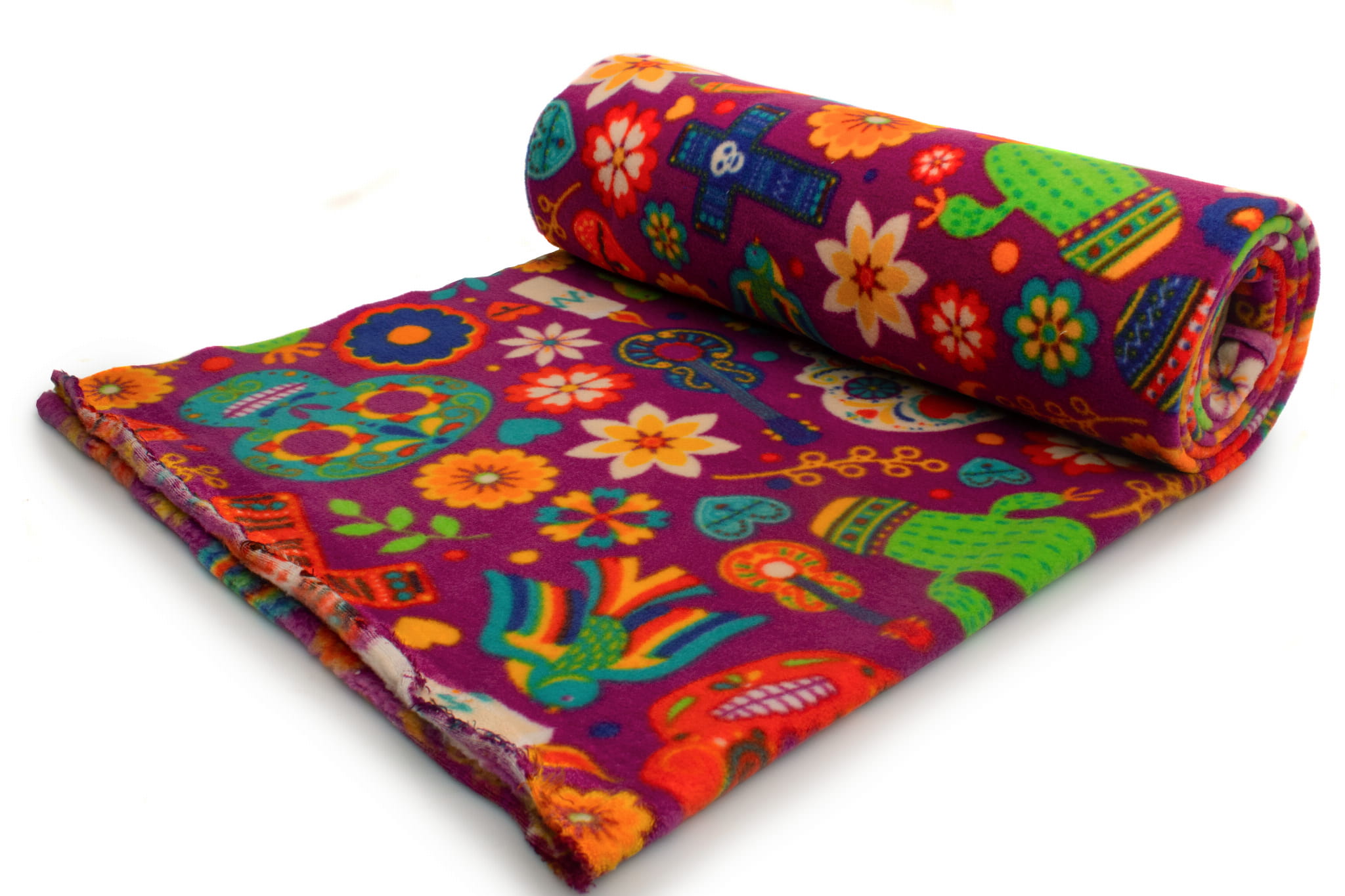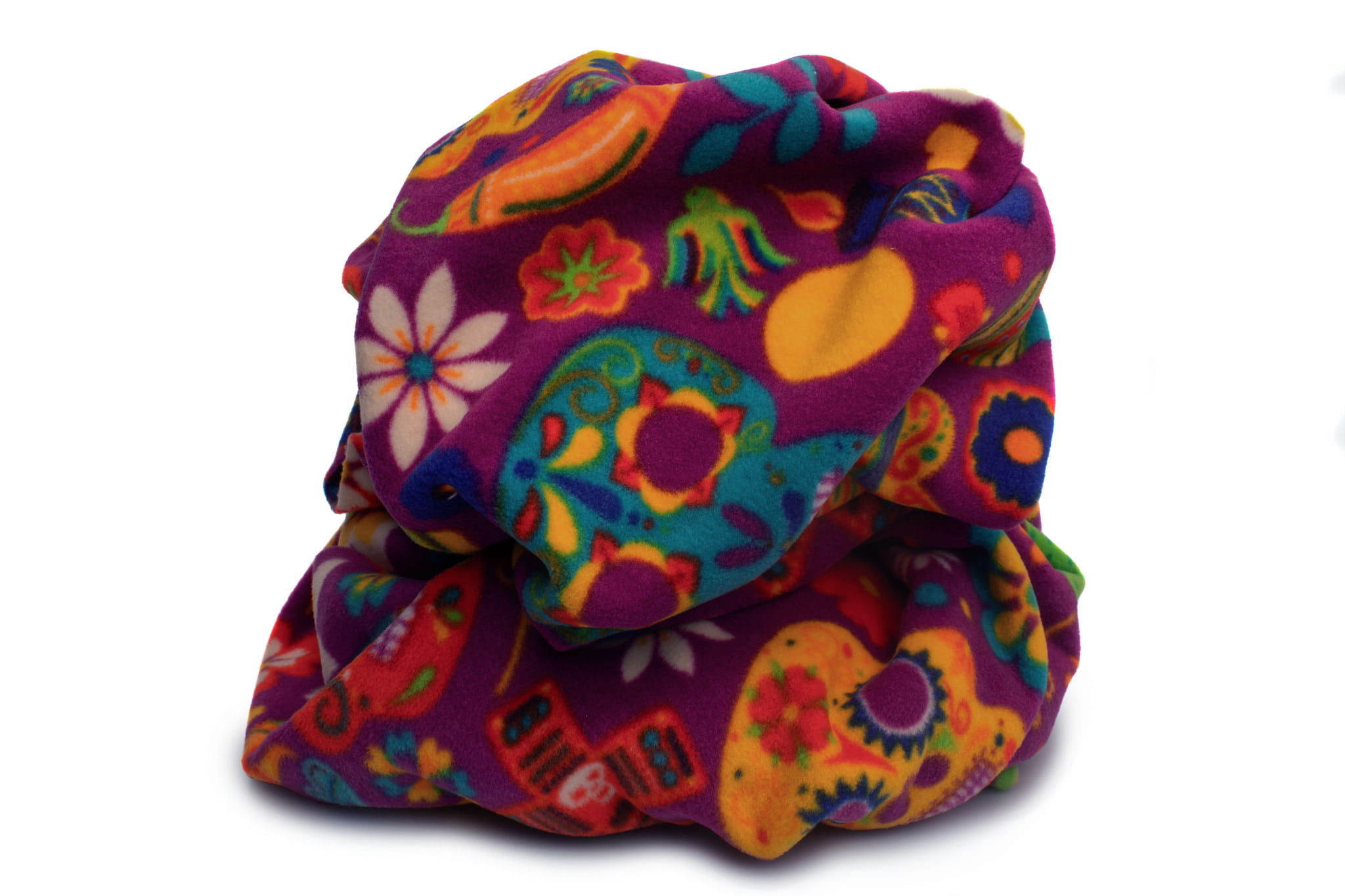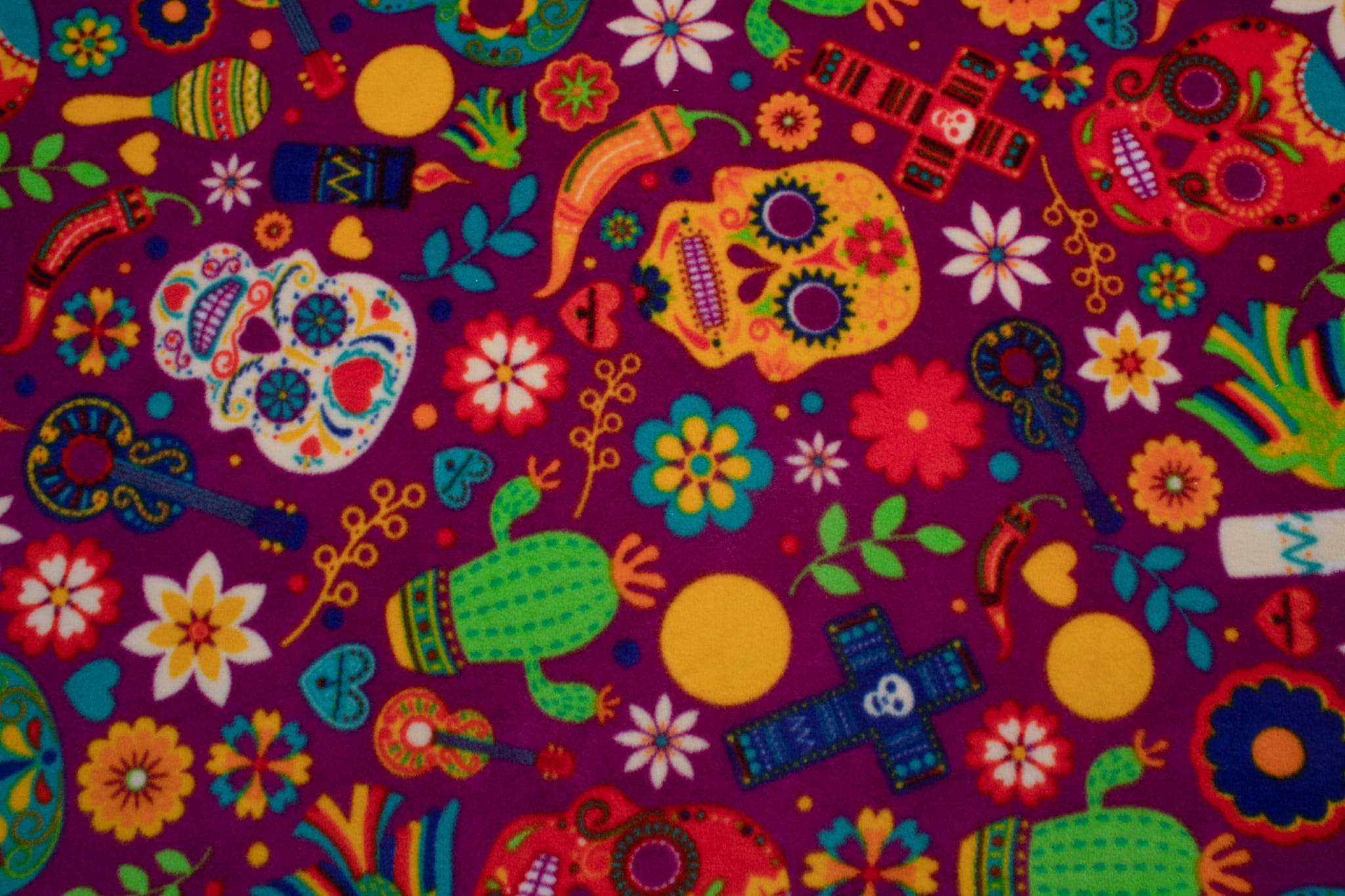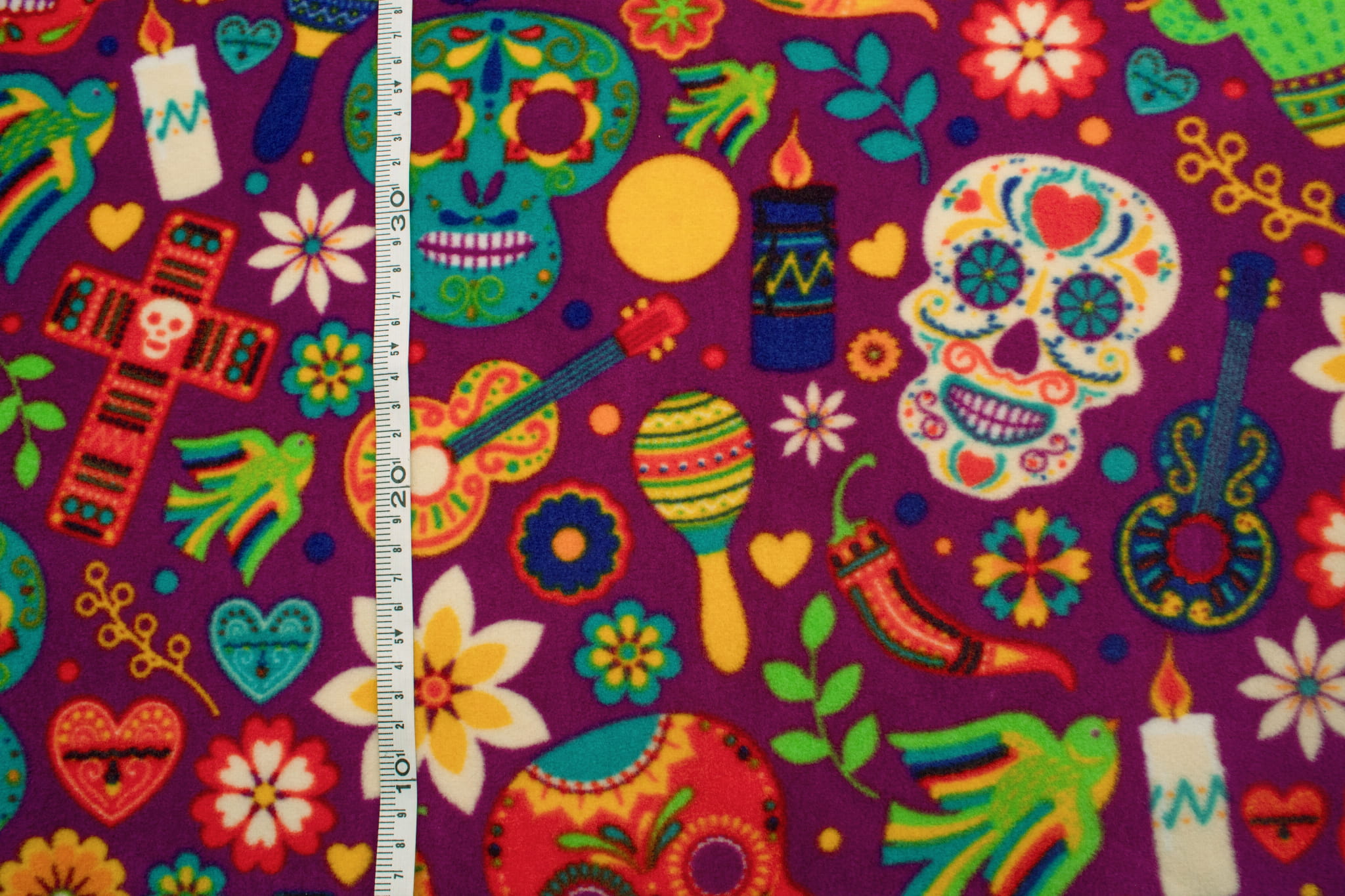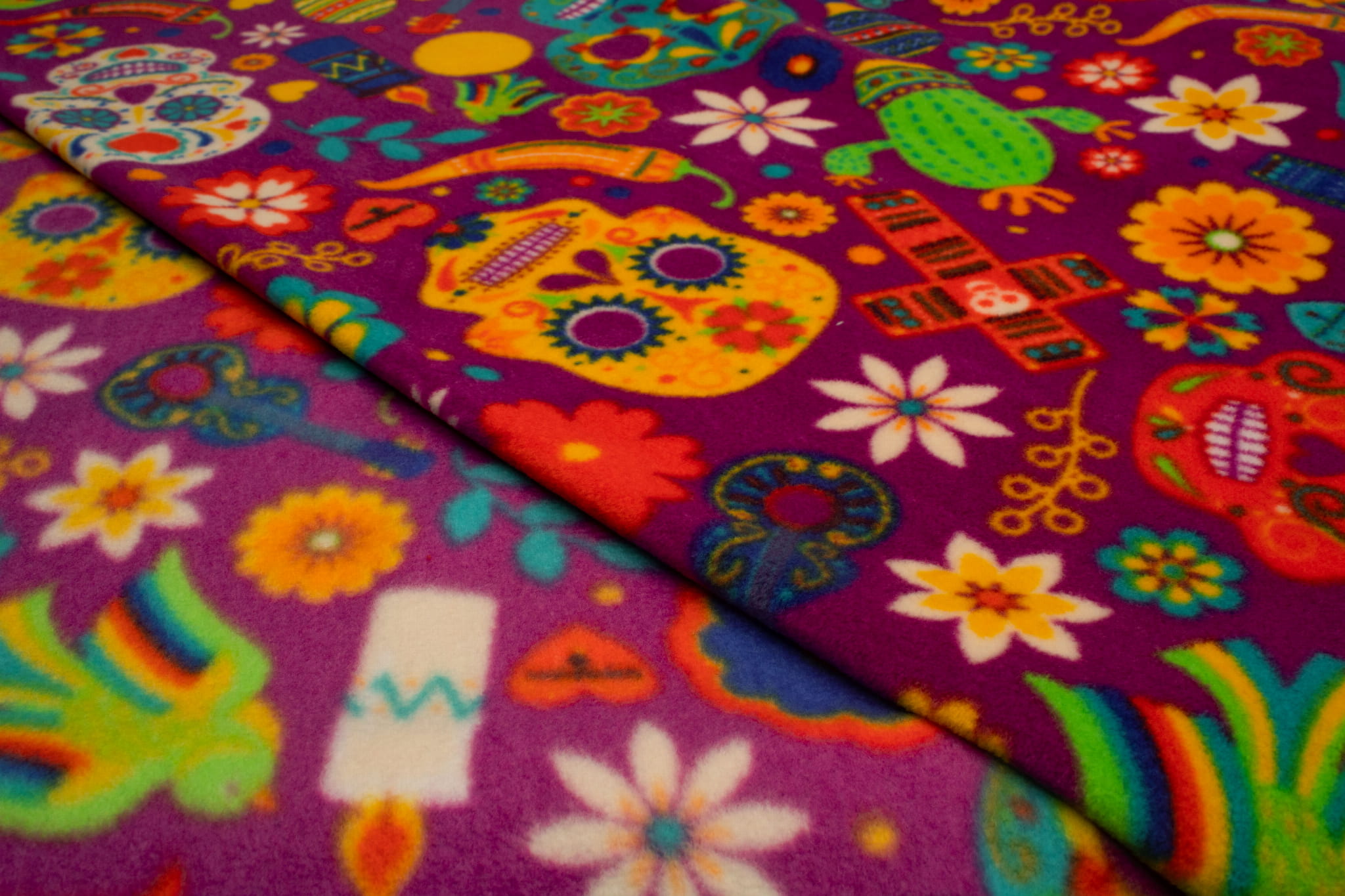 Fleecestoff besteht aus Polyester-Kunstfasern. Künstliche Fasern verleihen dem Stoff hydrophobe Eigenschaften sowie eine hohe Knitterfestigkeit und hohe Elastizität. Durch diese Eigenschaften trocknet das Vlies sehr schnell und muss nicht gebügelt werden. Der wichtigste Vorteil von Fleece ist jedoch der hervorragende Kälteschutz. Dieses bedruckte Fleece wurde mit der DTY-Technologie hergestellt, sodass wir Ihnen ein hochwertigeres Material anbieten können. DTY-Fleece hat eine glattere und weichere Textur als klassisches Fleece. Es pillt nicht, ist sehr widerstandsfähig und langlebig. Der Stoff erstreckt sich über die Breite. Das Vlies ist mit einem permanenten Aufdruck mit dem Dia de Muertos-Motiv verziert, das an den mexikanischen Tag der Toten erinnert. Es ist voller Symbole, sehr farbenfroh. Der Druck erfolgt auf beiden Seiten, allerdings ist zwischen der linken und rechten Stoffseite ein deutlich sichtbarer Unterschied zu erkennen. Erhältlich in 3 Farbversionen.