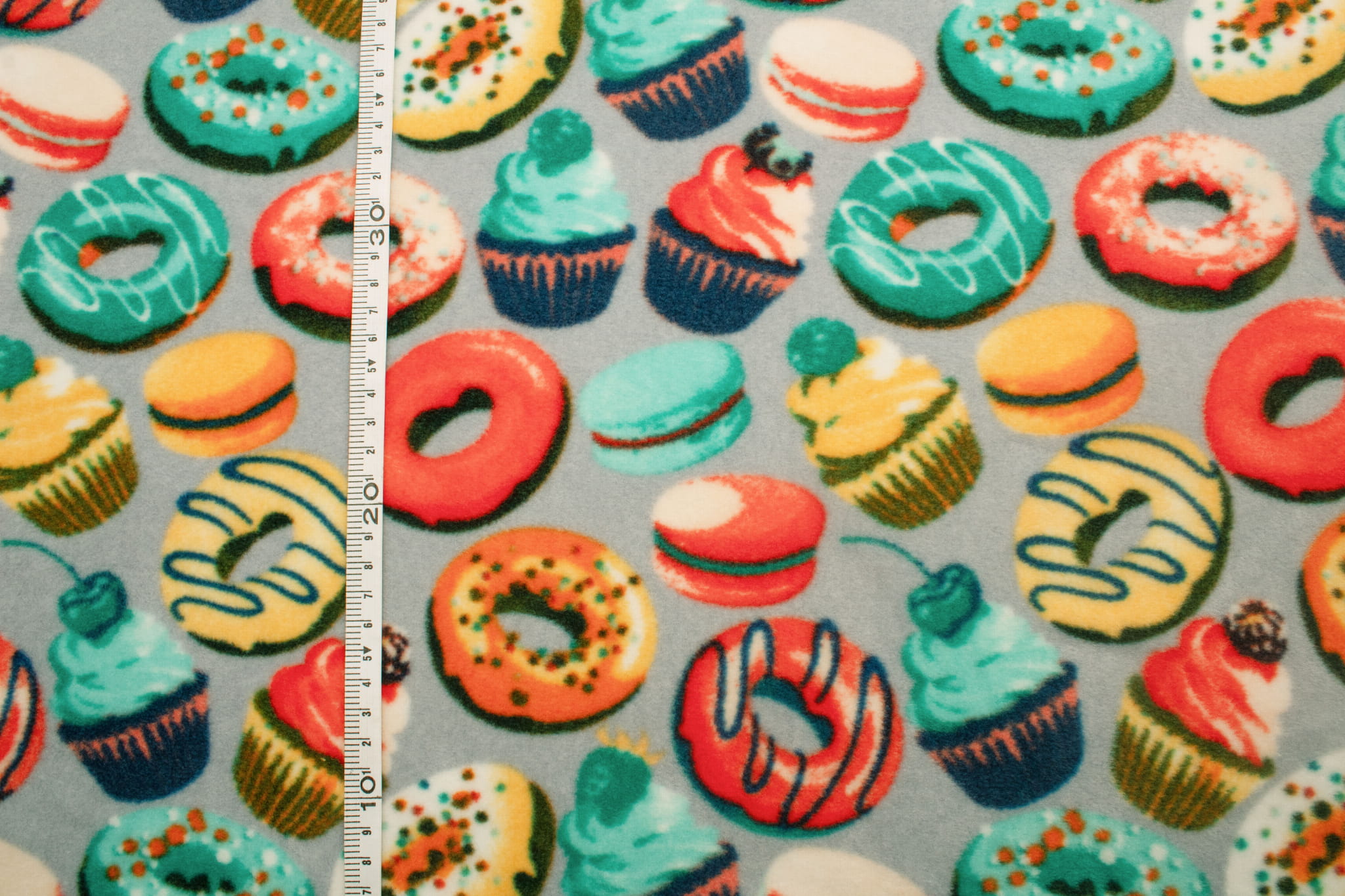 Fleecestoff besteht aus Polyester-Kunstfasern. Künstliche Fasern verleihen dem Stoff hydrophobe Eigenschaften sowie eine hohe Knitterfestigkeit und hohe Elastizität. Durch diese Eigenschaften trocknet das Vlies sehr schnell und muss nicht gebügelt werden. Der wichtigste Vorteil von Fleece ist jedoch der hervorragende Kälteschutz. Dieses bedruckte Fleece wurde mit der DTY-Technologie hergestellt, sodass wir Ihnen ein hochwertigeres Material anbieten können. DTY-Fleece hat eine glattere und weichere Textur als klassisches Fleece. Es pillt nicht, ist sehr widerstandsfähig und langlebig. Der Stoff erstreckt sich über die Breite. Das süßeste Muster, das es gibt :) Das Vlies ist mit einem permanenten süßen Aufdruck verziert – wir haben hier Donuts, Muffins und Makronen im Angebot. Sehr farbenfrohes, intensives Muster. Der Druck erfolgt auf beiden Seiten, allerdings ist zwischen der linken und rechten Stoffseite ein deutlich sichtbarer Unterschied zu erkennen. Erhältlich in 3 Farbversionen.