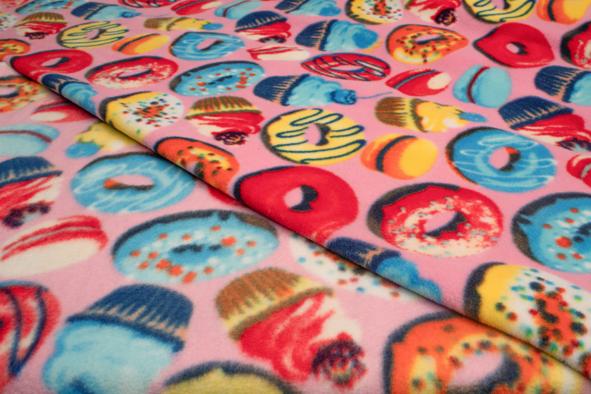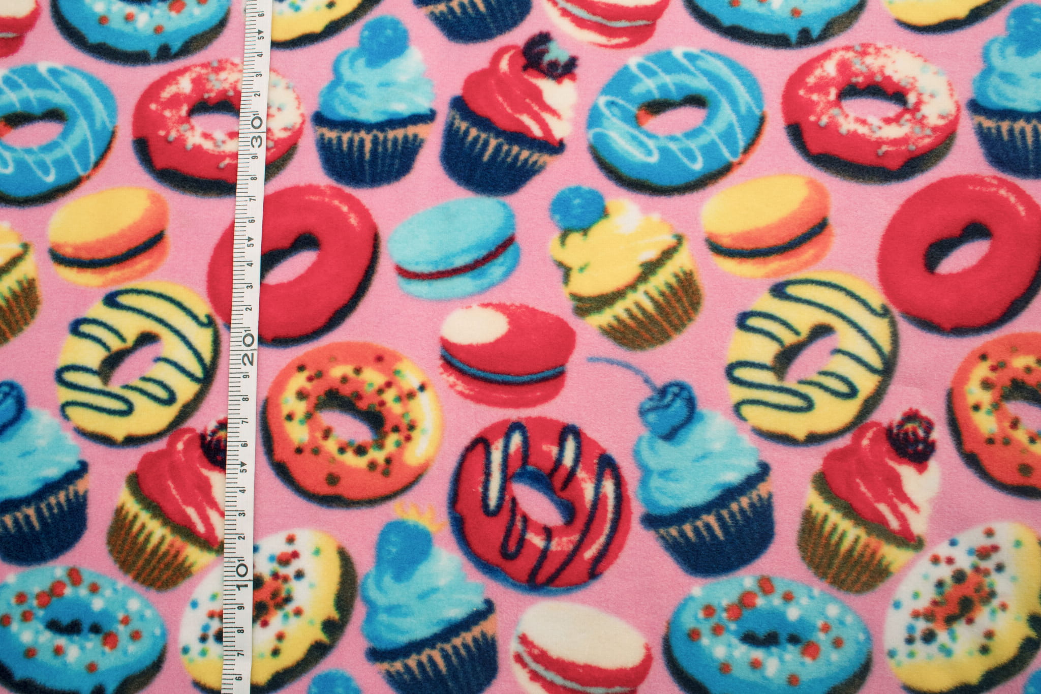 Fleecestoff besteht aus Polyester-Kunstfasern. Künstliche Fasern verleihen dem Stoff hydrophobe Eigenschaften sowie eine hohe Knitterfestigkeit und hohe Elastizität. Durch diese Eigenschaften trocknet das Vlies sehr schnell und muss nicht gebügelt werden. Der wichtigste Vorteil von Fleece ist jedoch der hervorragende Kälteschutz. Dieses bedruckte Fleece wurde mit der DTY-Technologie hergestellt, sodass wir Ihnen ein hochwertigeres Material anbieten können. DTY-Fleece hat eine glattere und weichere Textur als klassisches Fleece. Es pillt nicht, ist sehr widerstandsfähig und langlebig. Der Stoff erstreckt sich über die Breite. Das süßeste Muster, das es gibt :) Das Vlies ist mit einem permanenten süßen Aufdruck verziert – wir haben hier Donuts, Muffins und Makronen im Angebot. Sehr farbenfrohes, intensives Muster. Der Druck erfolgt auf beiden Seiten, allerdings ist zwischen der linken und rechten Stoffseite ein deutlich sichtbarer Unterschied zu erkennen. Erhältlich in 3 Farbversionen.