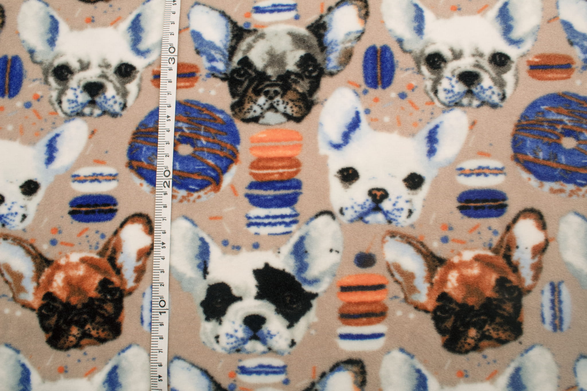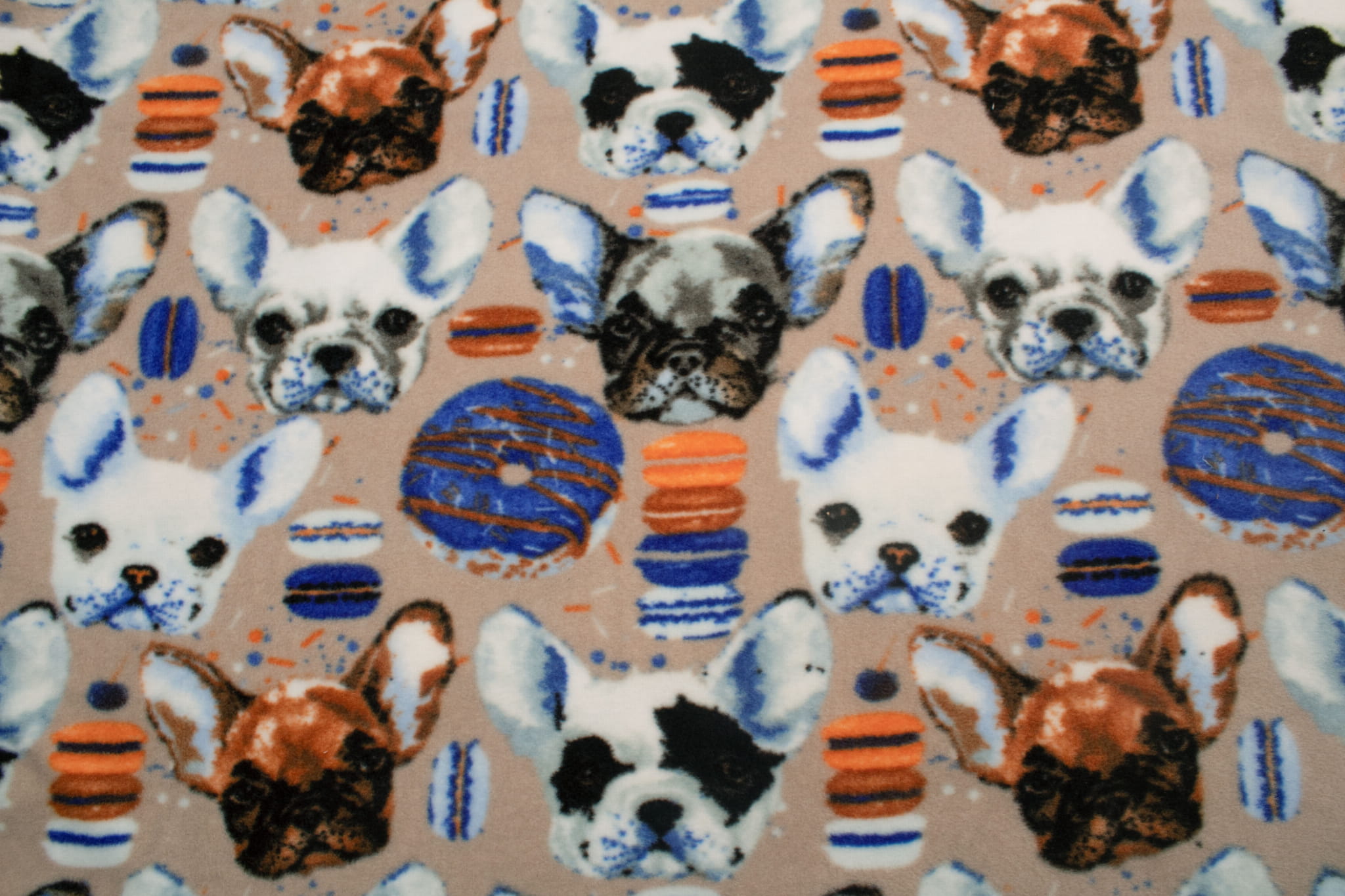 Fleecestoff besteht aus Polyester-Kunstfasern. Künstliche Fasern verleihen dem Stoff hydrophobe Eigenschaften sowie eine hohe Knitterfestigkeit und hohe Elastizität. Durch diese Eigenschaften trocknet das Vlies sehr schnell und muss nicht gebügelt werden. Der wichtigste Vorteil von Fleece ist jedoch der hervorragende Kälteschutz. Dieses bedruckte Fleece wurde mit der DTY-Technologie hergestellt, sodass wir Ihnen ein hochwertigeres Material anbieten können. DTY-Fleece hat eine glattere und weichere Textur als klassisches Fleece. Es pillt nicht, ist sehr widerstandsfähig und langlebig. Der Stoff erstreckt sich über die Breite. The fleece is decorated with a permanent print of cute French bulldogs accompanied by sweets. The print is on both sides, but there is a clearly visible difference between the left and right sides of the fabric. Available in 3 color versions.