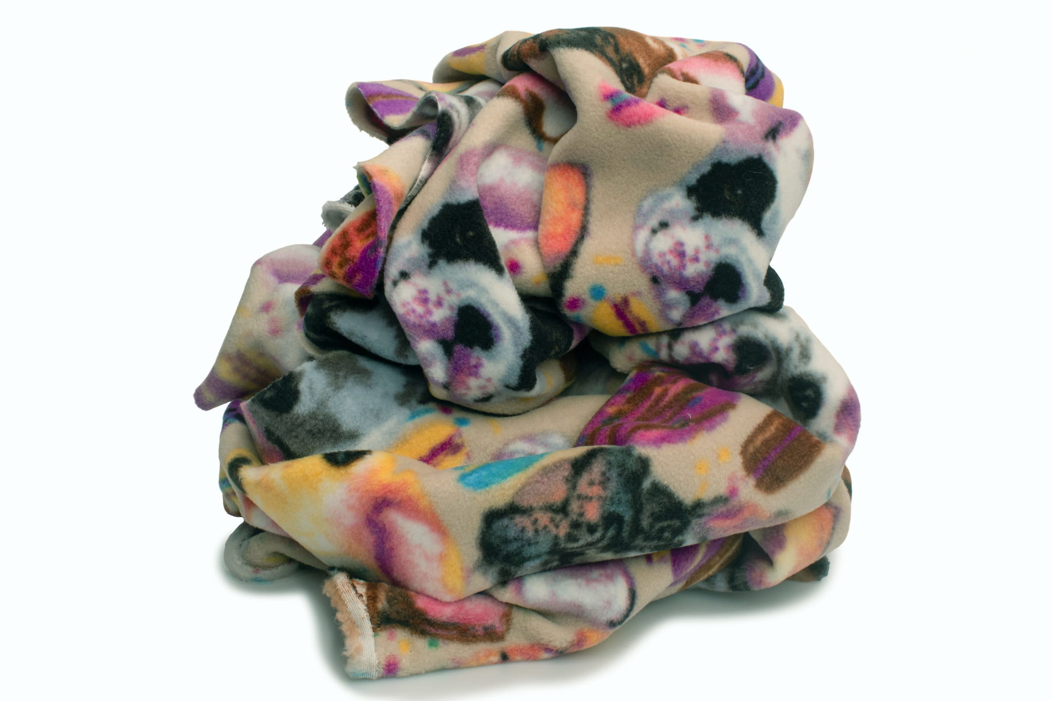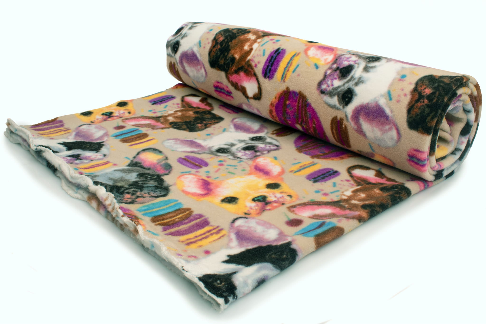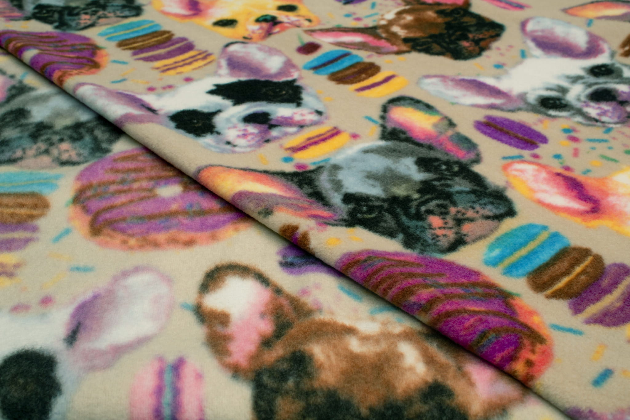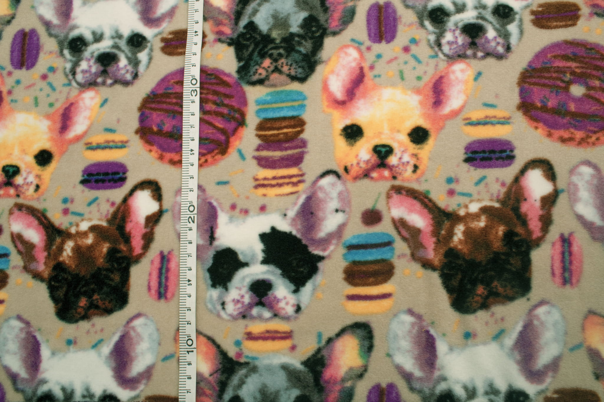 Fleecestoff besteht aus Polyester-Kunstfasern. Künstliche Fasern verleihen dem Stoff hydrophobe Eigenschaften sowie eine hohe Knitterfestigkeit und hohe Elastizität. Durch diese Eigenschaften trocknet das Vlies sehr schnell und muss nicht gebügelt werden. Der wichtigste Vorteil von Fleece ist jedoch der hervorragende Kälteschutz. Dieses bedruckte Fleece wurde mit der DTY-Technologie hergestellt, sodass wir Ihnen ein hochwertigeres Material anbieten können. DTY-Fleece hat eine glattere und weichere Textur als klassisches Fleece. Es pillt nicht, ist sehr widerstandsfähig und langlebig. Der Stoff erstreckt sich über die Breite. The fleece is decorated with a permanent print of cute French bulldogs accompanied by sweets. The print is on both sides, but there is a clearly visible difference between the left and right sides of the fabric. Available in 3 color versions.