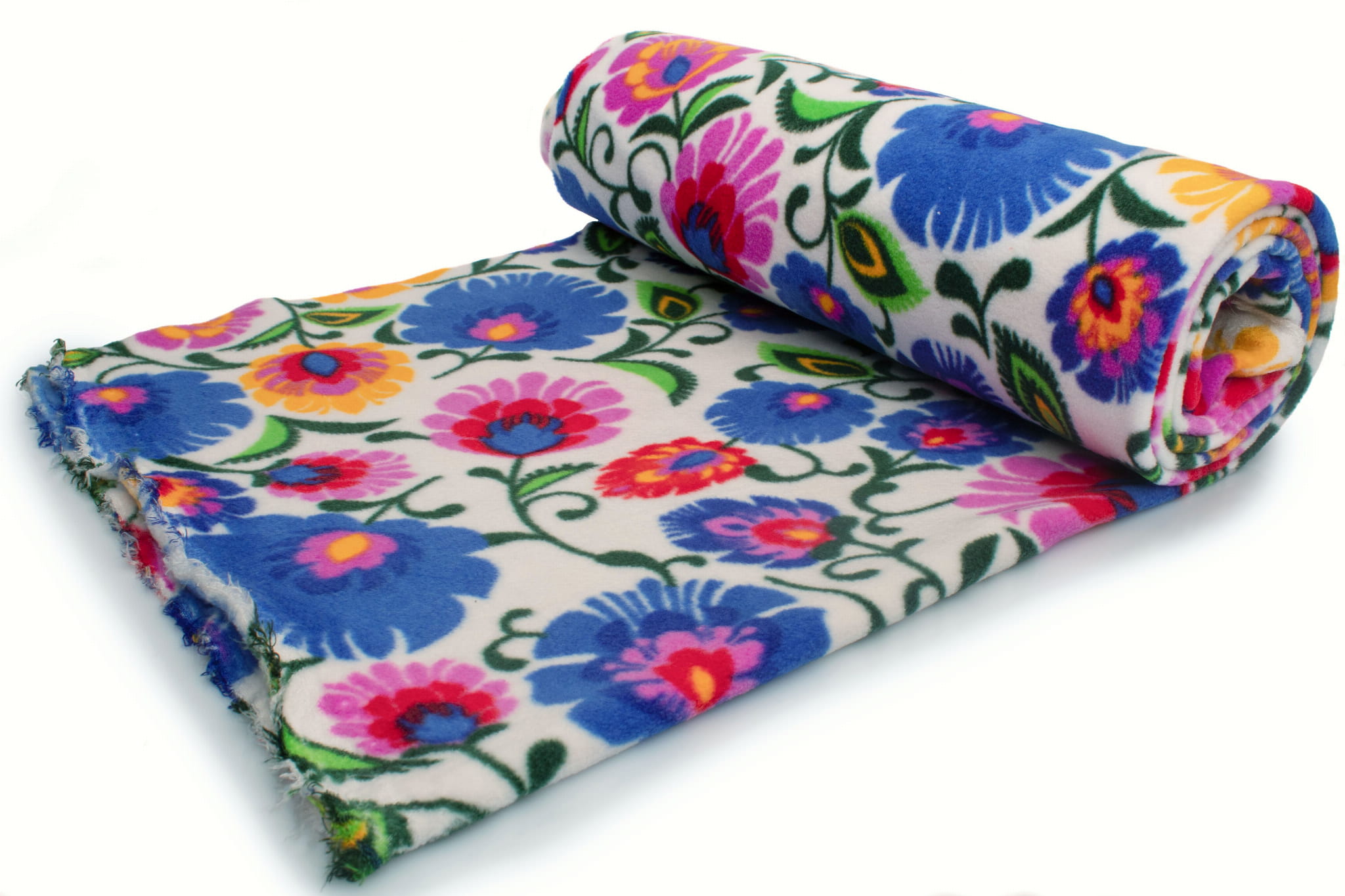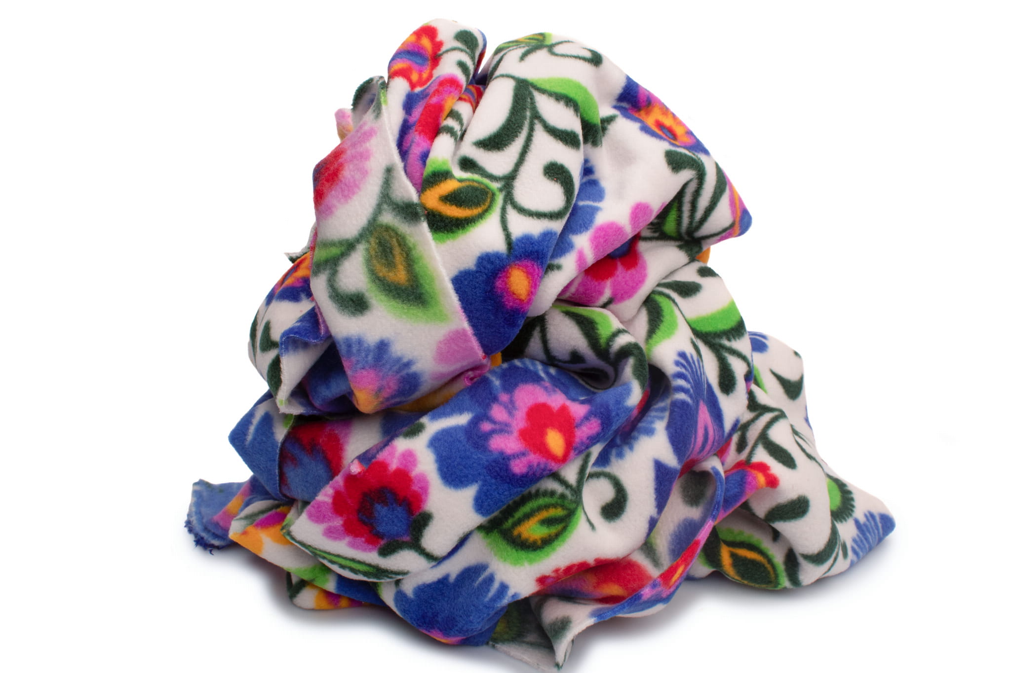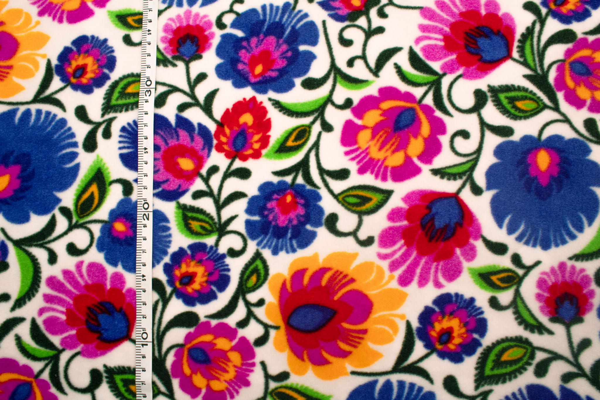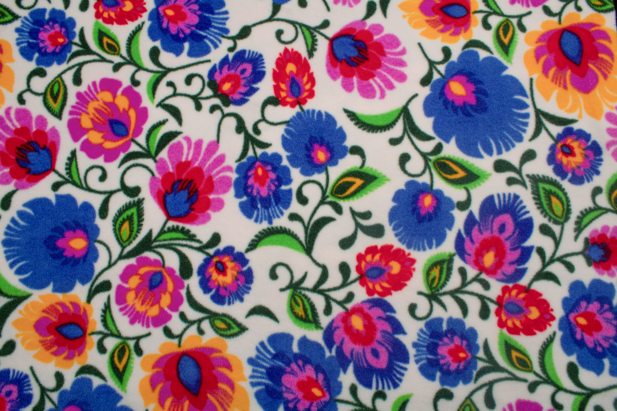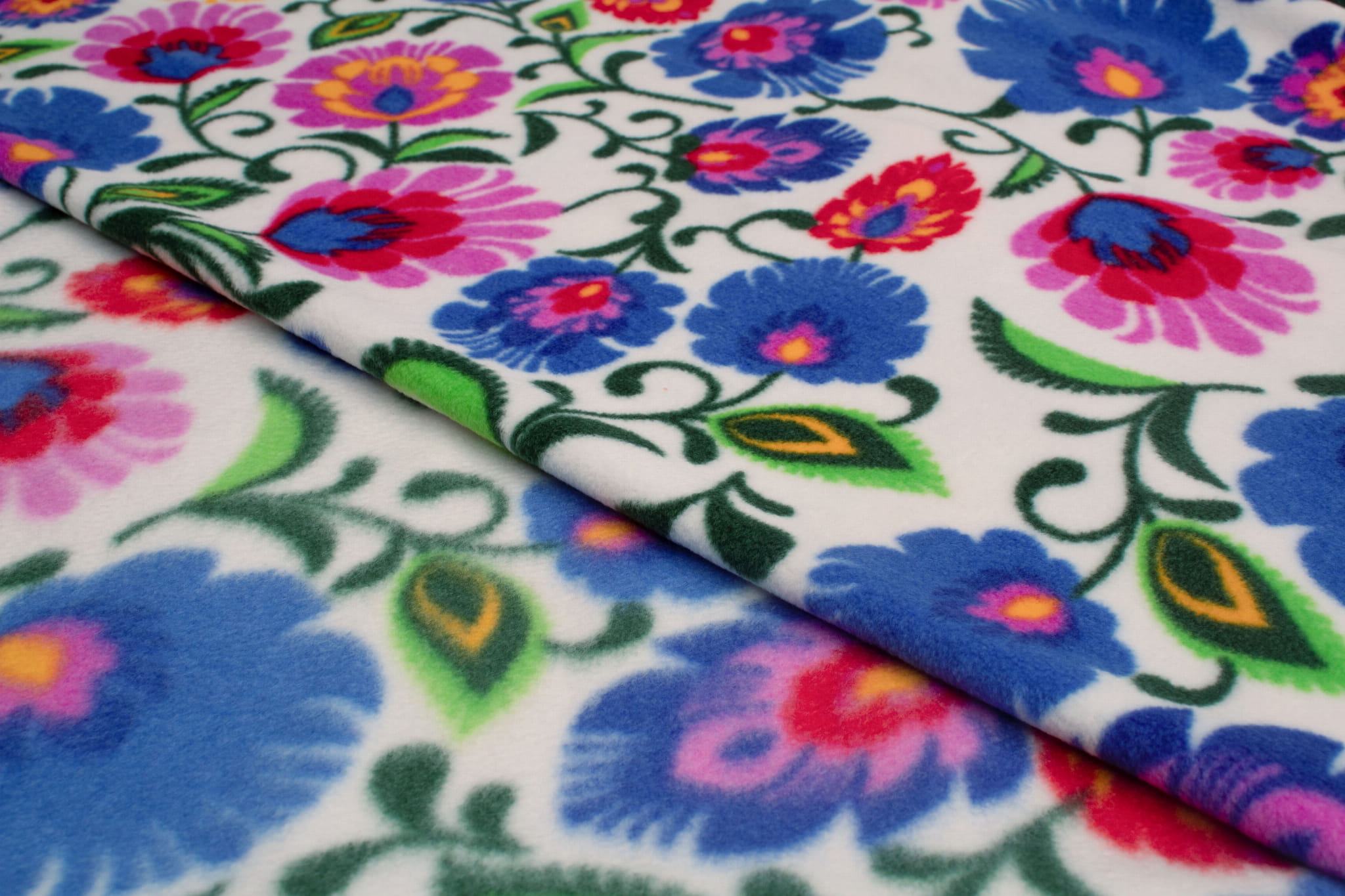 Fleecestoff besteht aus Polyester-Kunstfasern. Künstliche Fasern verleihen dem Stoff hydrophobe Eigenschaften sowie eine hohe Knitterfestigkeit und hohe Elastizität. Durch diese Eigenschaften trocknet das Vlies sehr schnell und muss nicht gebügelt werden. Der wichtigste Vorteil von Fleece ist jedoch der hervorragende Kälteschutz. Dieses bedruckte Fleece wurde mit der DTY-Technologie hergestellt, sodass wir Ihnen ein hochwertigeres Material anbieten können. DTY-Fleece hat eine glattere und weichere Textur als klassisches Fleece. Es pillt nicht, ist sehr widerstandsfähig und langlebig. Der Stoff erstreckt sich über die Breite. Das Fleece ist mit einem haltbaren Aufdruck mit Volksmustern aus Łowicz verziert. Die Farben sind sehr vielfältig und intensiv. Der Druck erfolgt auf beiden Seiten, allerdings ist zwischen der linken und rechten Stoffseite ein deutlich sichtbarer Unterschied zu erkennen. Erhältlich in 3 Farbversionen.
