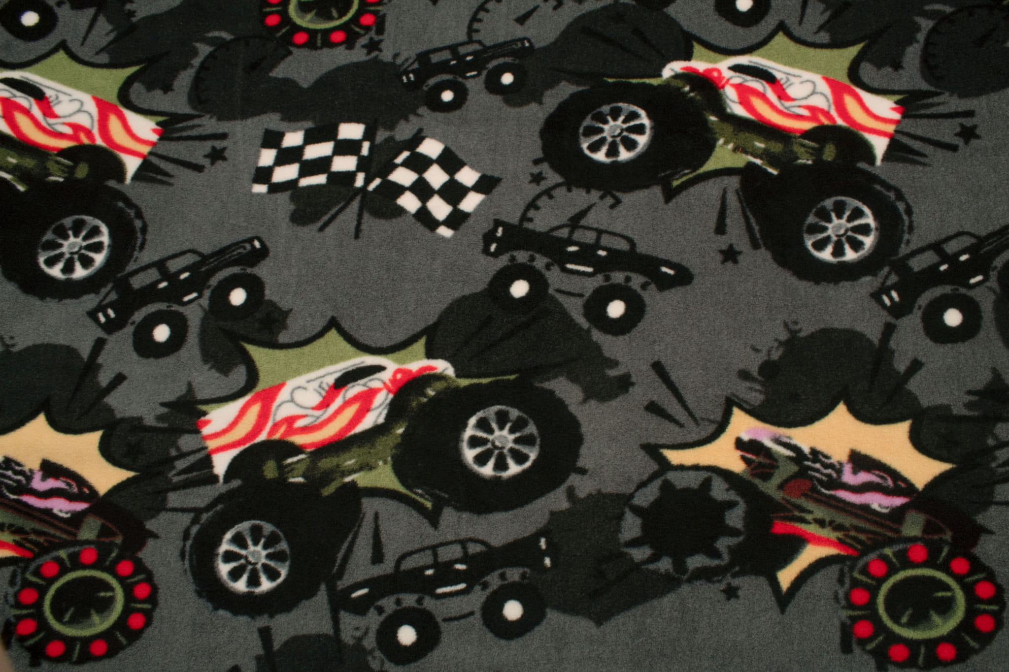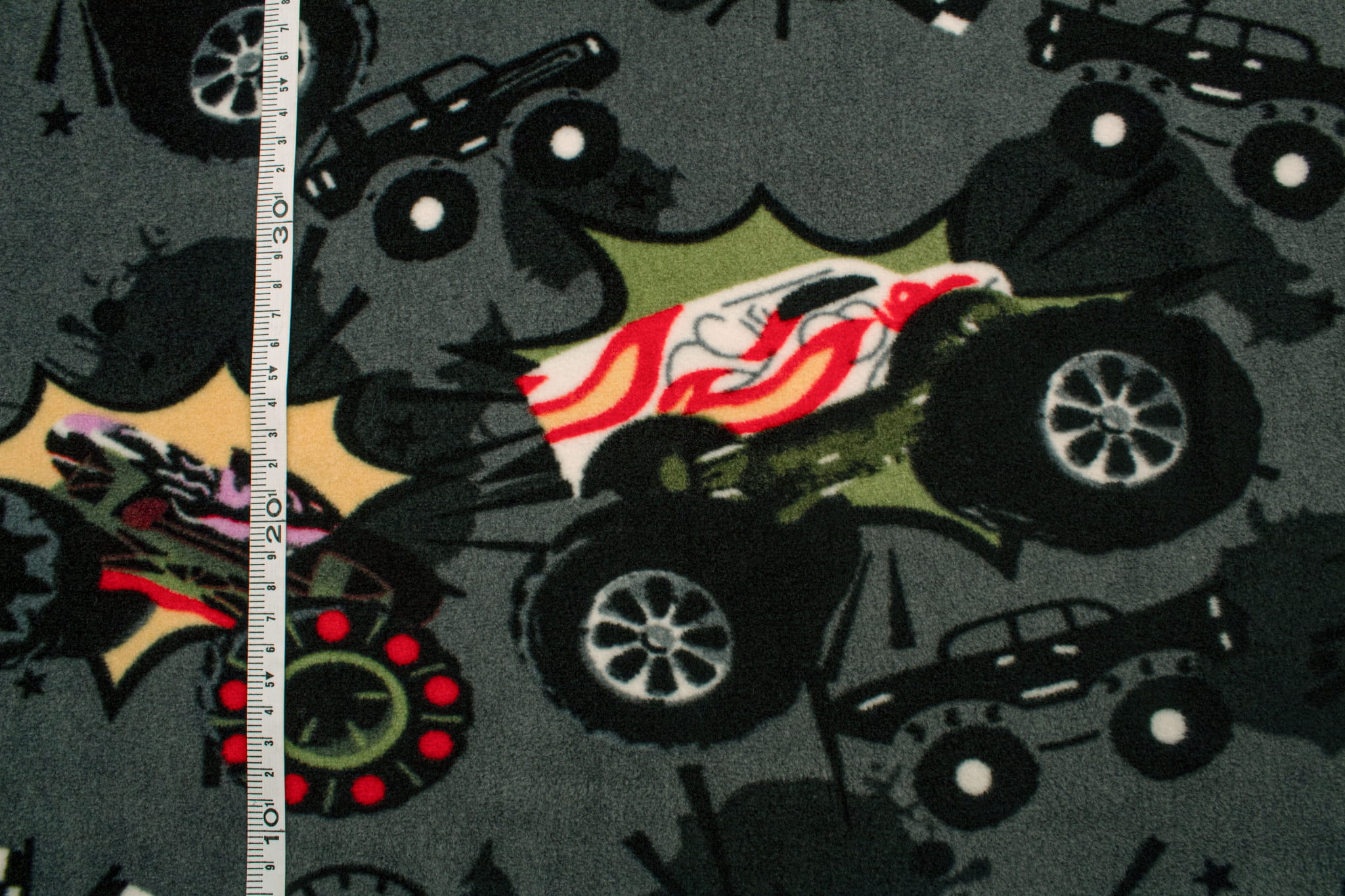 Fleecestoff besteht aus Polyester-Kunstfasern. Künstliche Fasern verleihen dem Stoff hydrophobe Eigenschaften sowie eine hohe Knitterfestigkeit und hohe Elastizität. Durch diese Eigenschaften trocknet das Vlies sehr schnell und muss nicht gebügelt werden. Der wichtigste Vorteil von Fleece ist jedoch der hervorragende Kälteschutz. Dieses bedruckte Fleece wurde mit der DTY-Technologie hergestellt, sodass wir Ihnen ein hochwertigeres Material anbieten können. DTY-Fleece hat eine glattere und weichere Textur als klassisches Fleece. Es pillt nicht, ist sehr widerstandsfähig und langlebig. Der Stoff erstreckt sich über die Breite. De fleece is versierd met een duurzame print met kinderpatroon - Monster Trucks. De print is aan beide zijden, maar er is een duidelijk zichtbaar verschil tussen de linker- en rechterzijde van de stof. Verkrijgbaar in 4 kleurenversies.