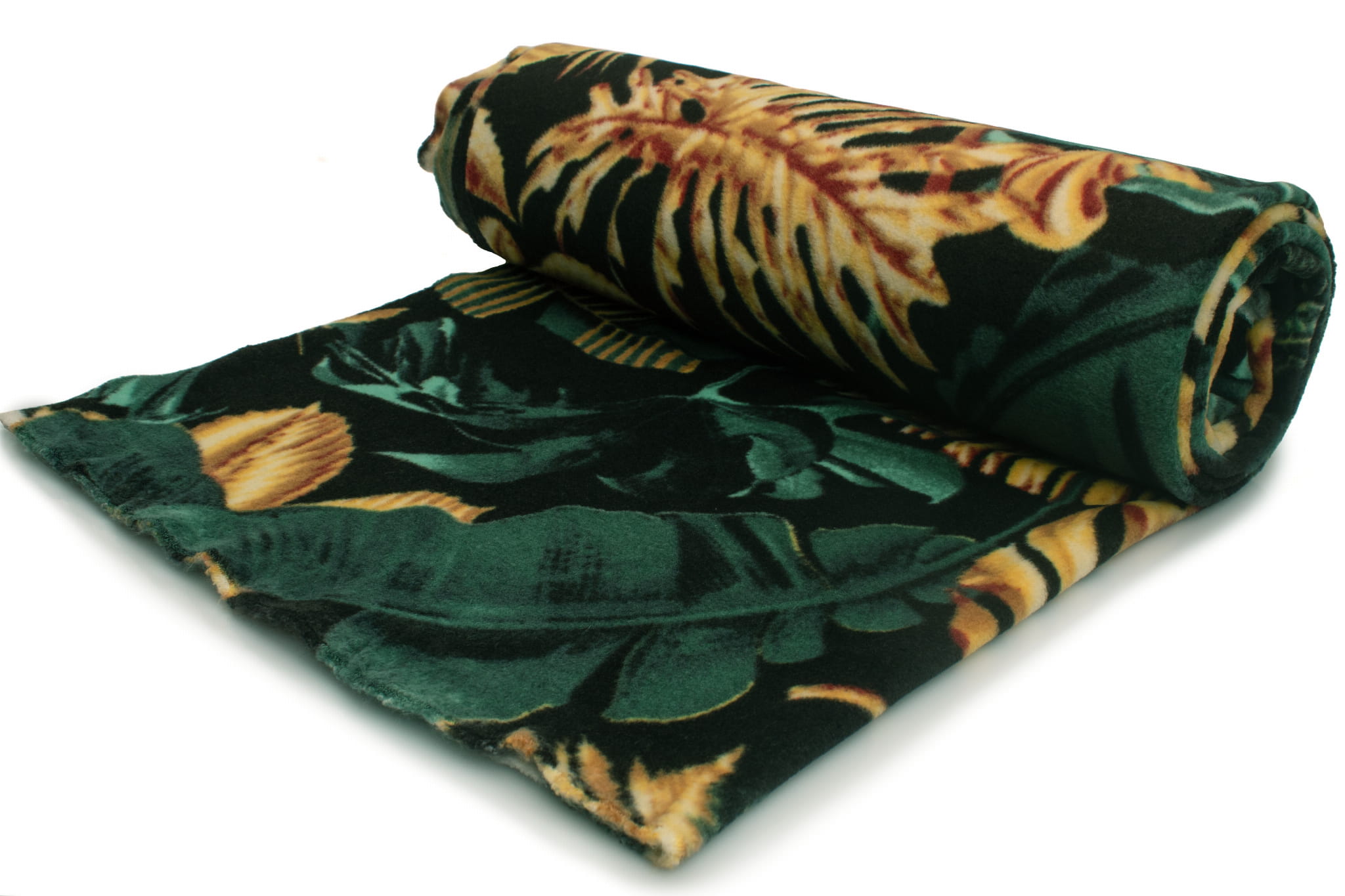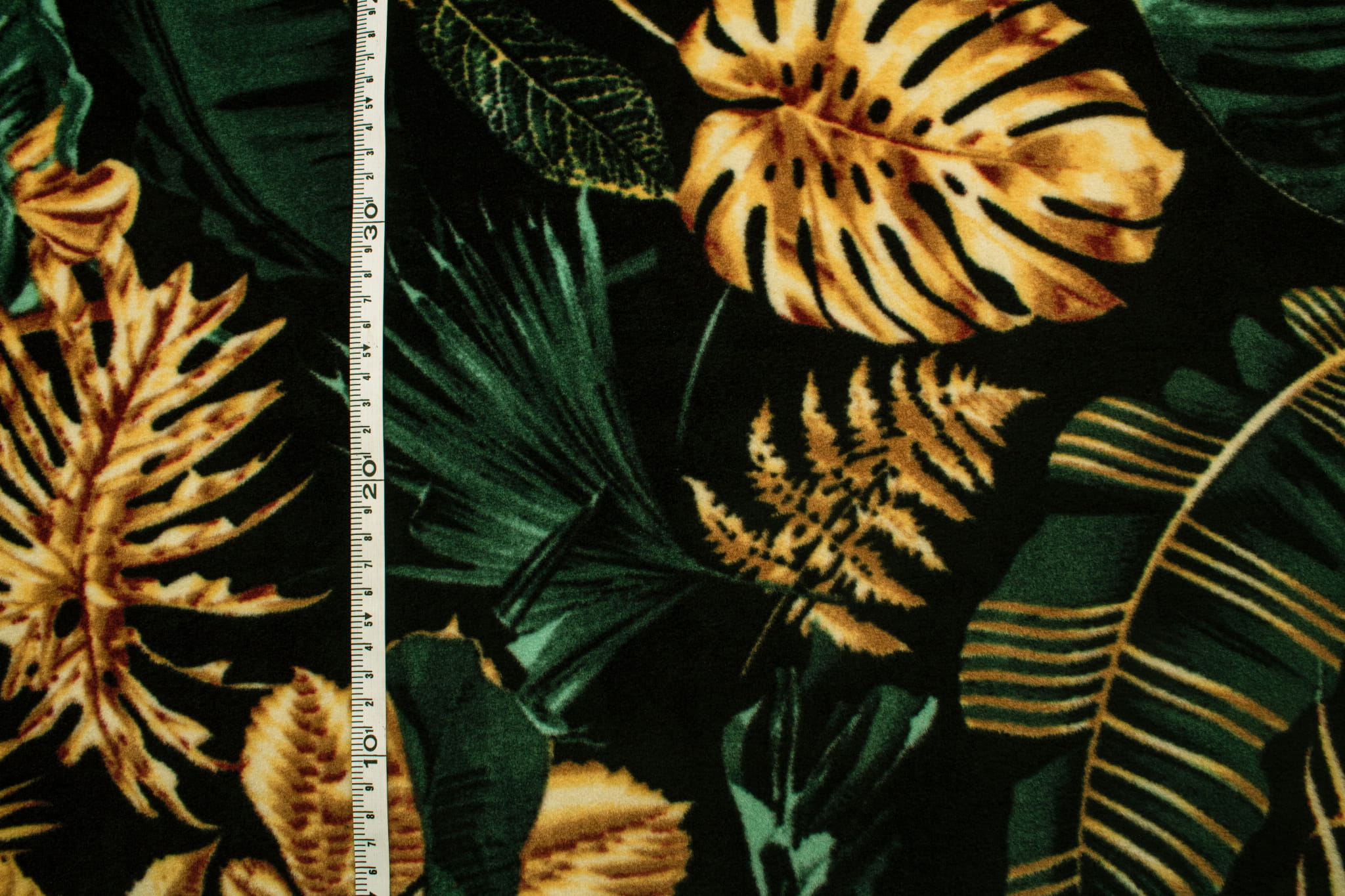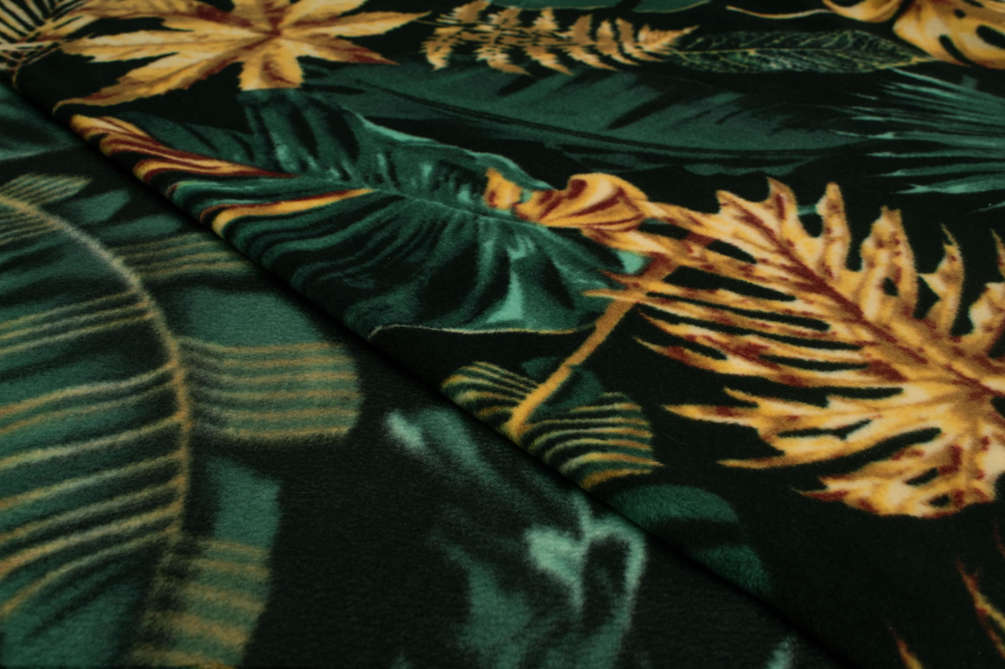 Fleecestoff besteht aus Polyester-Kunstfasern. Künstliche Fasern verleihen dem Stoff hydrophobe Eigenschaften sowie eine hohe Knitterfestigkeit und hohe Elastizität. Durch diese Eigenschaften trocknet das Vlies sehr schnell und muss nicht gebügelt werden. Der wichtigste Vorteil von Fleece ist jedoch der hervorragende Kälteschutz. Dieses bedruckte Fleece wurde mit der DTY-Technologie hergestellt, sodass wir Ihnen ein hochwertigeres Material anbieten können. DTY-Fleece hat eine glattere und weichere Textur als klassisches Fleece. Es pillt nicht, ist sehr widerstandsfähig und langlebig. Der Stoff erstreckt sich über die Breite. Das Vlies ist mit einem haltbaren Aufdruck mit verschiedenen Blattarten verziert – wir haben hier Bananenpflanzen, Monsteras, Farne und viele andere im Angebot. Die sehr intensive Farbe der Blätter wird mit edlem Gold kontrastiert. Der Druck erfolgt auf beiden Seiten, allerdings ist zwischen der linken und rechten Stoffseite ein deutlich sichtbarer Unterschied zu erkennen. Erhältlich in 4 Farbversionen.