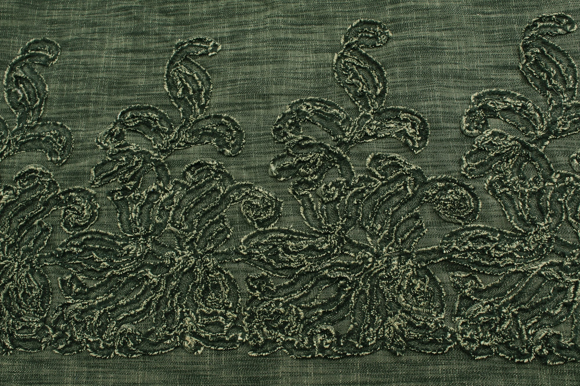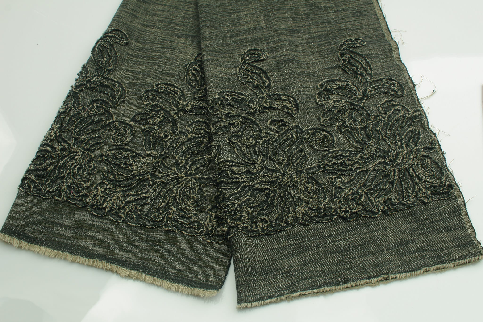 Der Stoff ist aus Köpergewebe. Ein charakteristisches Element ist eine aufgenähte Applikation, die an beiden Kanten ein identisches Muster erzeugt. Das Material fühlt sich angenehm an und ist luftig, sehr langlebig.