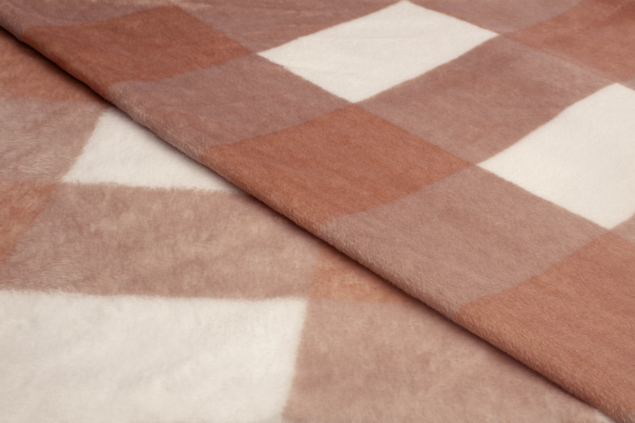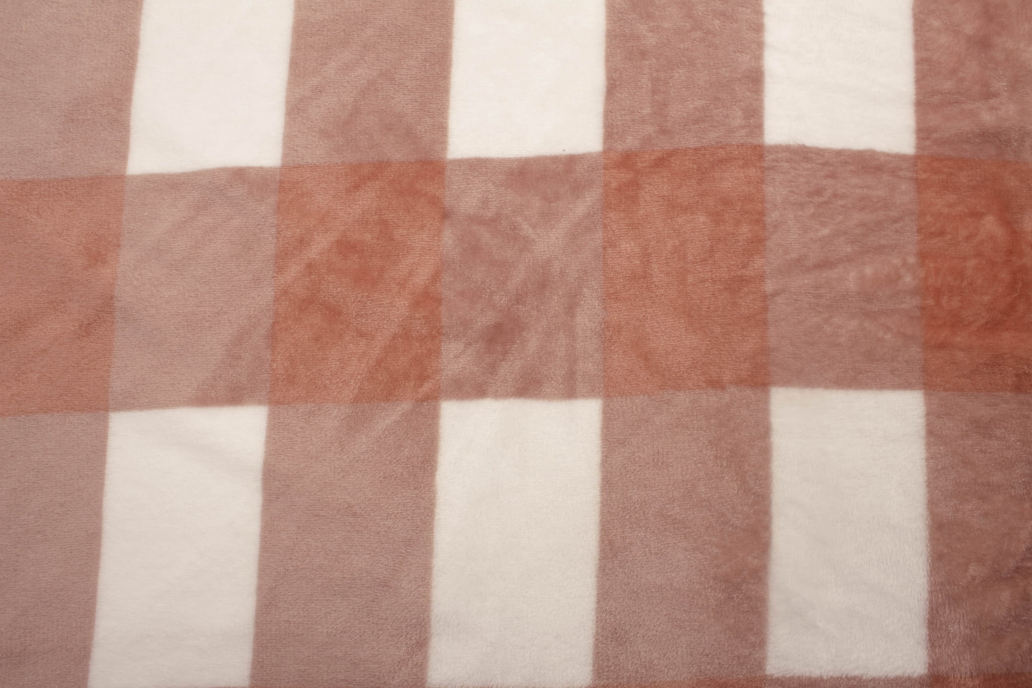 Plüschstrickstoff ist ein Strickstoff aus Polyesterfasern. Die langen Haare auf beiden Seiten des Materials sorgen für eine weiche und äußerst kuschelige Textur. Plüsch ist sehr warm und angenehm anzufassen. Es hat einen großen Karodruck in den Farben Schmutzrosa, Rostrot und Ecru. Der lange Flor und der Aufdruck erscheinen auf beiden Seiten des Materials.