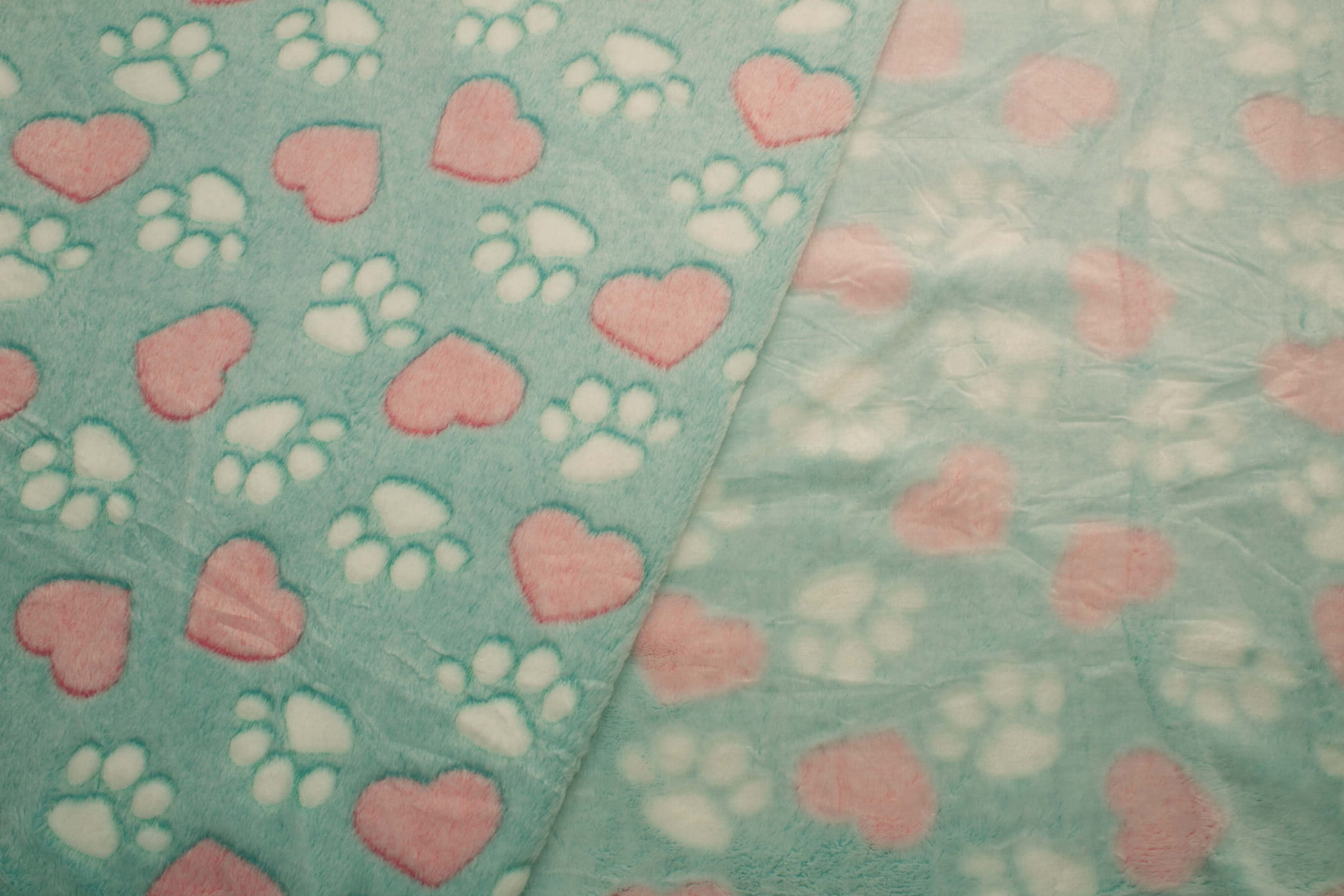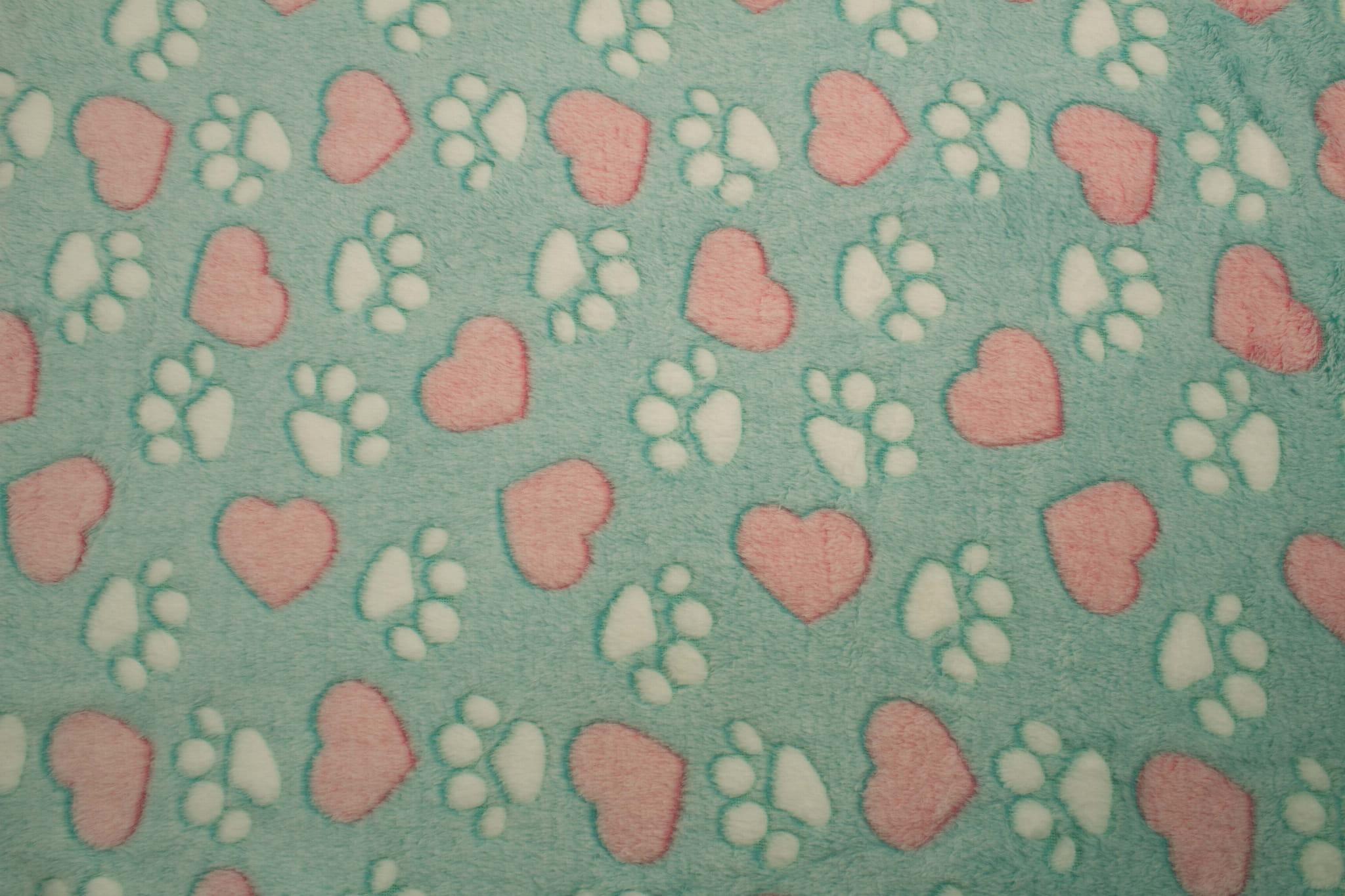 Vlies Minky Plush ist ein Gestrick aus Polyesterfasern. Lange Borsten auf beiden Seiten des Stoffes sorgen für eine weiche und äußerst kuschelige Textur. Plüsch ist sehr warm und fühlt sich angenehm an. Das Material wurde mit einem Abdruck von Hundepfoten und -herzen angereichert. Das Material ist eher einseitig - es gibt einen deutlichen Unterschied zwischen der rechten und der linken Seite. Auf beiden Seiten erscheinen lange Borsten, auf der rechten Seite ist der Druck deutlicher, zusätzlich wurden die Borsten auf dieser Seite beschnitten, um einen 3D-Effekt zu erzielen. Trotz der sichtbaren Unterschiede zwischen rechter und linker Seite kann das Material (nach der Verarbeitung) eigenständig z.B. als Decke fungieren.