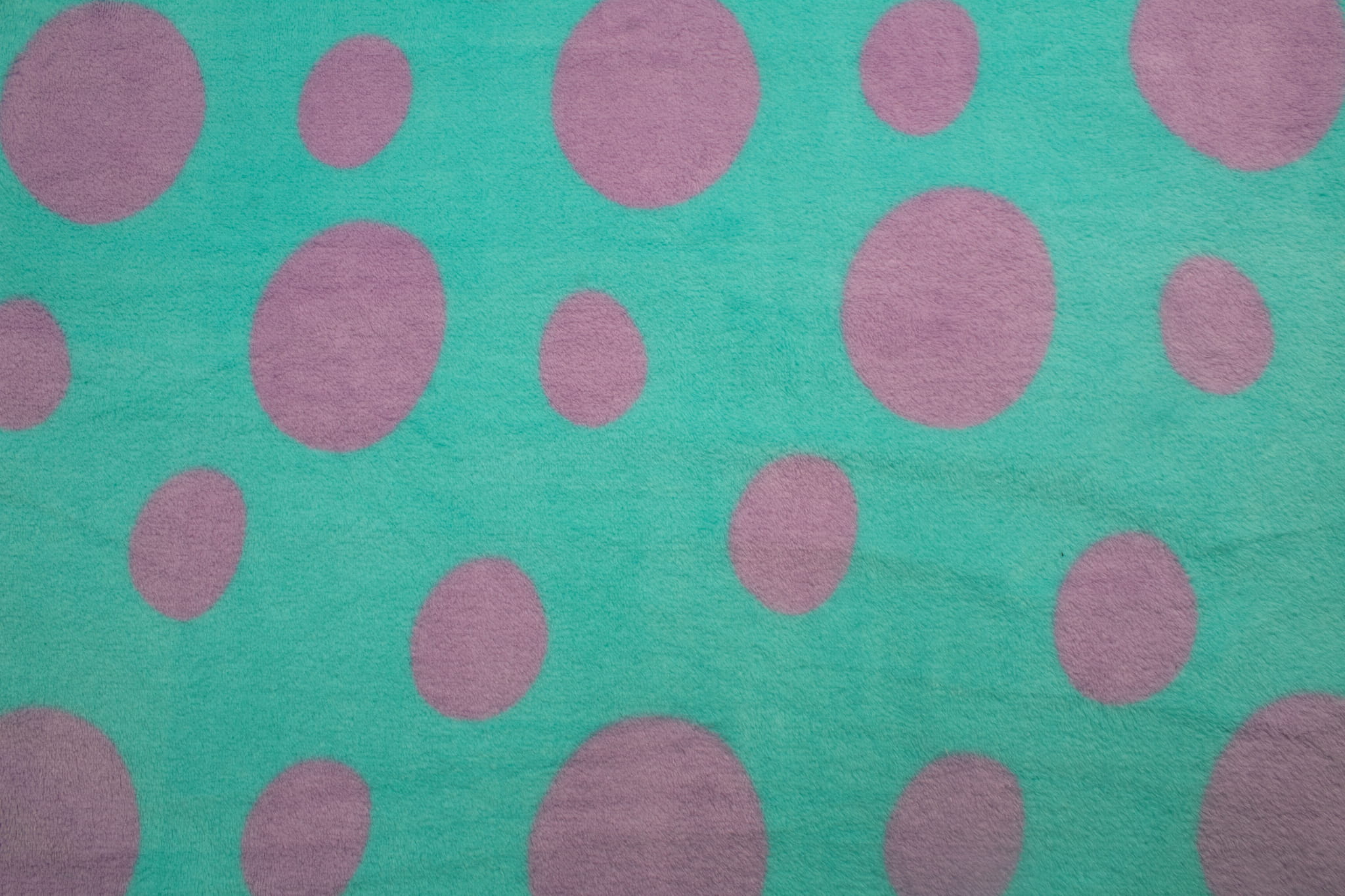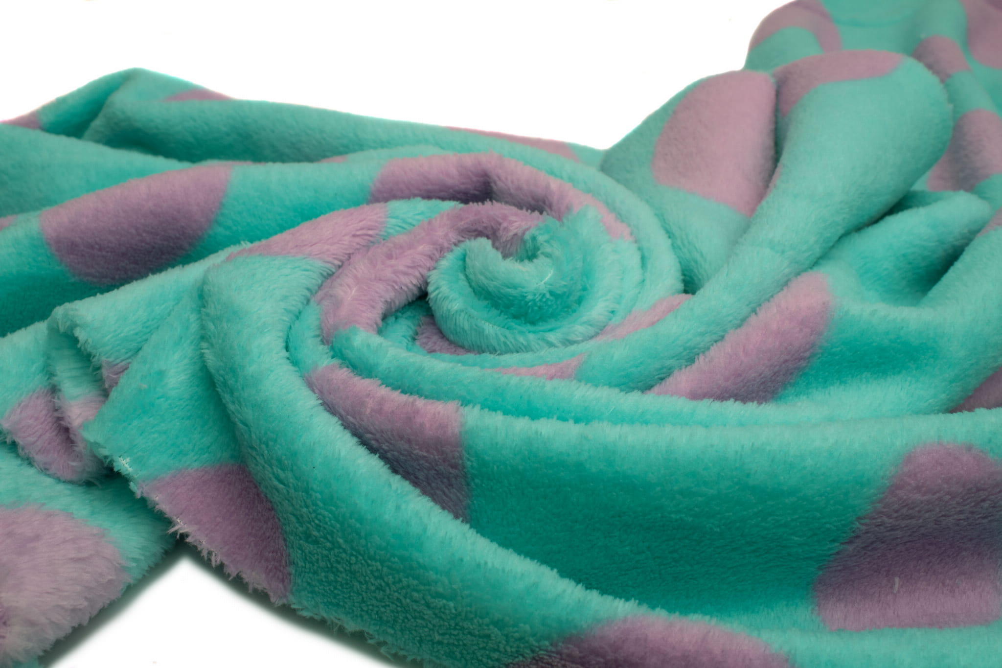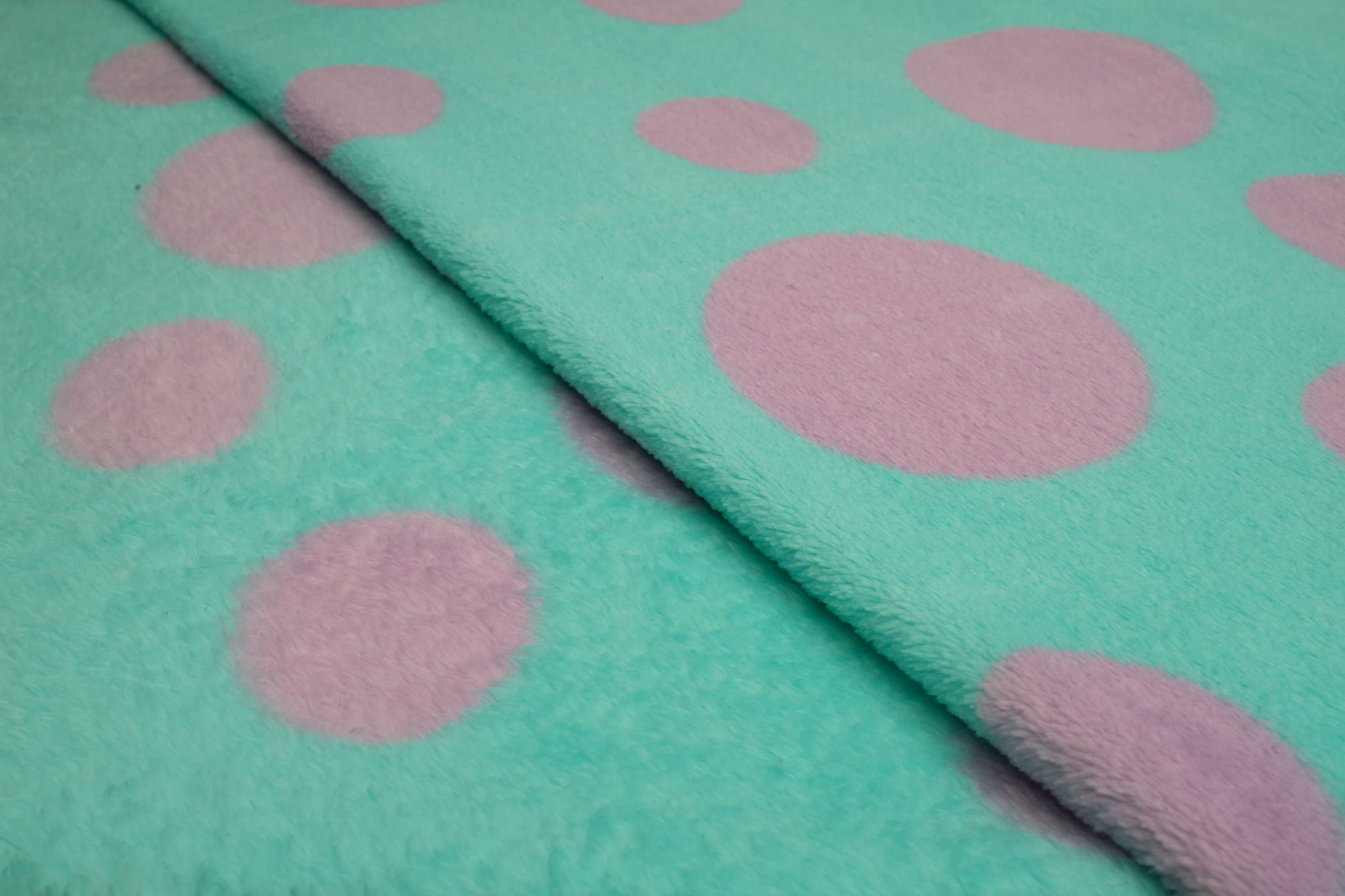 Minky Plush ist ein Strickstoff aus Polyesterfasern. Die Haare auf beiden Seiten des Materials erzeugen eine weiche und äußerst kuschelige Textur. Plüsch ist sehr warm und fühlt sich angenehm an. Das Muster besteht aus lila Punkten in verschiedenen Größen auf mintfarbenem Hintergrund. Das Material ist doppelseitig - die Borsten und der Druck befinden sich auf beiden Seiten des Materials.