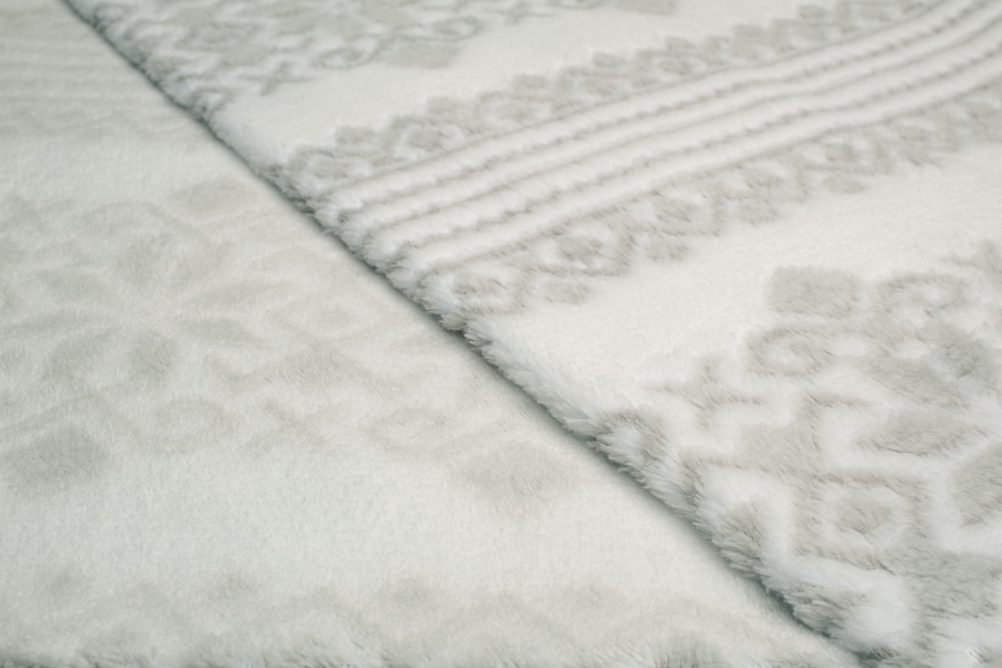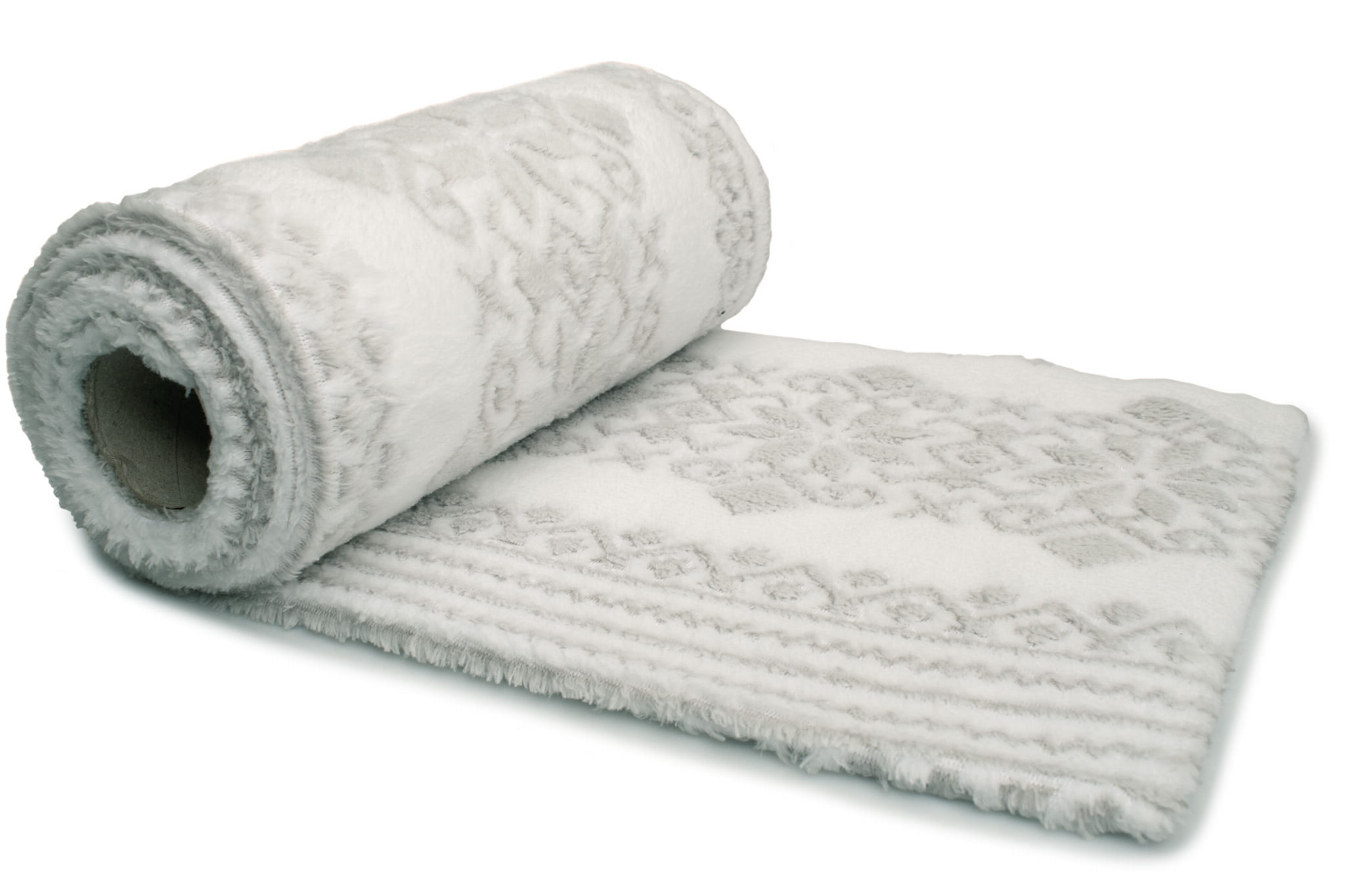 Minky Plüsch ist ein Strickstoff aus Polyesterfasern. Die Haare auf beiden Seiten des Materials erzeugen eine weiche und äußerst kuschelige Textur. Plüsch ist sehr warm und fühlt sich angenehm an. Auf einem weißen Hintergrund wurde ein graues skandinavisches Muster platziert. Seine Konturen wurden beschnitten, wodurch der Druck einen dreidimensionalen Effekt erhielt. Das Material ist einseitig. Die Borsten sind auf beiden Seiten des Materials vorhanden, der Druck ist nur auf der rechten Seite deutlich sichtbar.