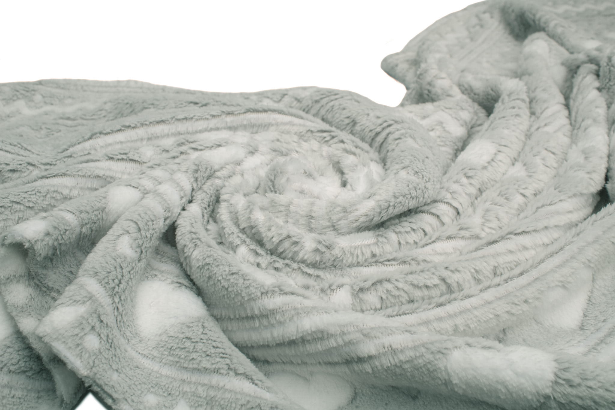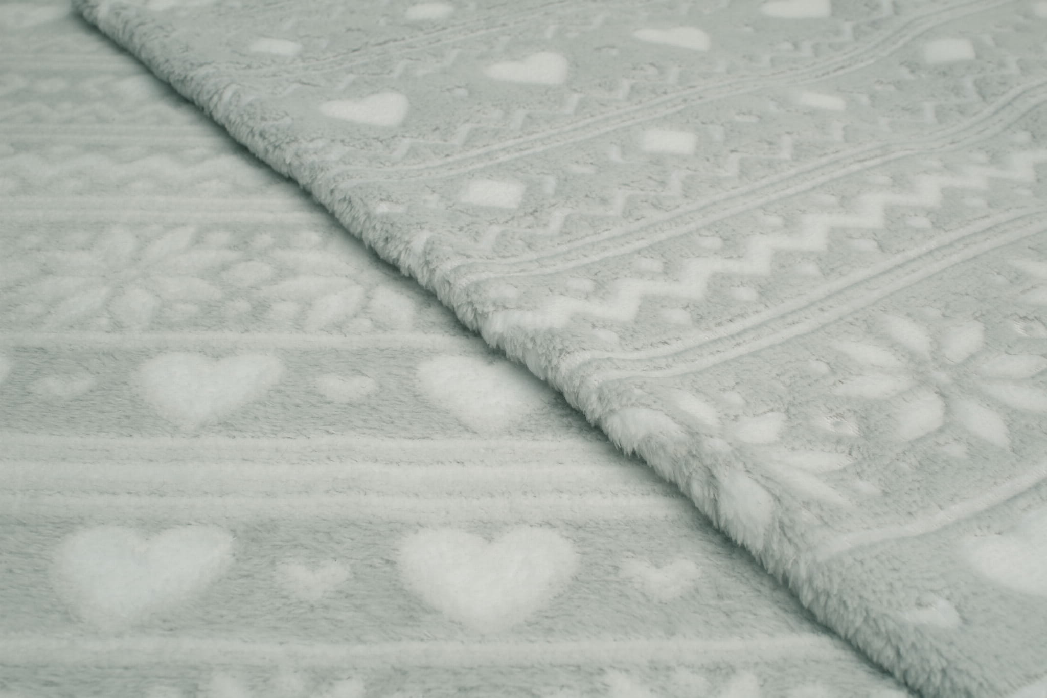 Vlies Minky Plush ist ein Strickstoff aus Polyesterfasern. Die Haare auf beiden Seiten des Materials erzeugen eine weiche und äußerst kuschelige Textur. Plüsch ist sehr warm und fühlt sich angenehm an. Auf einem grauen Hintergrund wurde ein weißes skandinavisches Muster platziert. Seine Konturen wurden beschnitten, wodurch der Druck einen dreidimensionalen Effekt erhielt. Das Material ist einseitig. Die Borsten sind auf beiden Seiten des Materials vorhanden, der Druck ist nur auf der rechten Seite deutlich sichtbar.