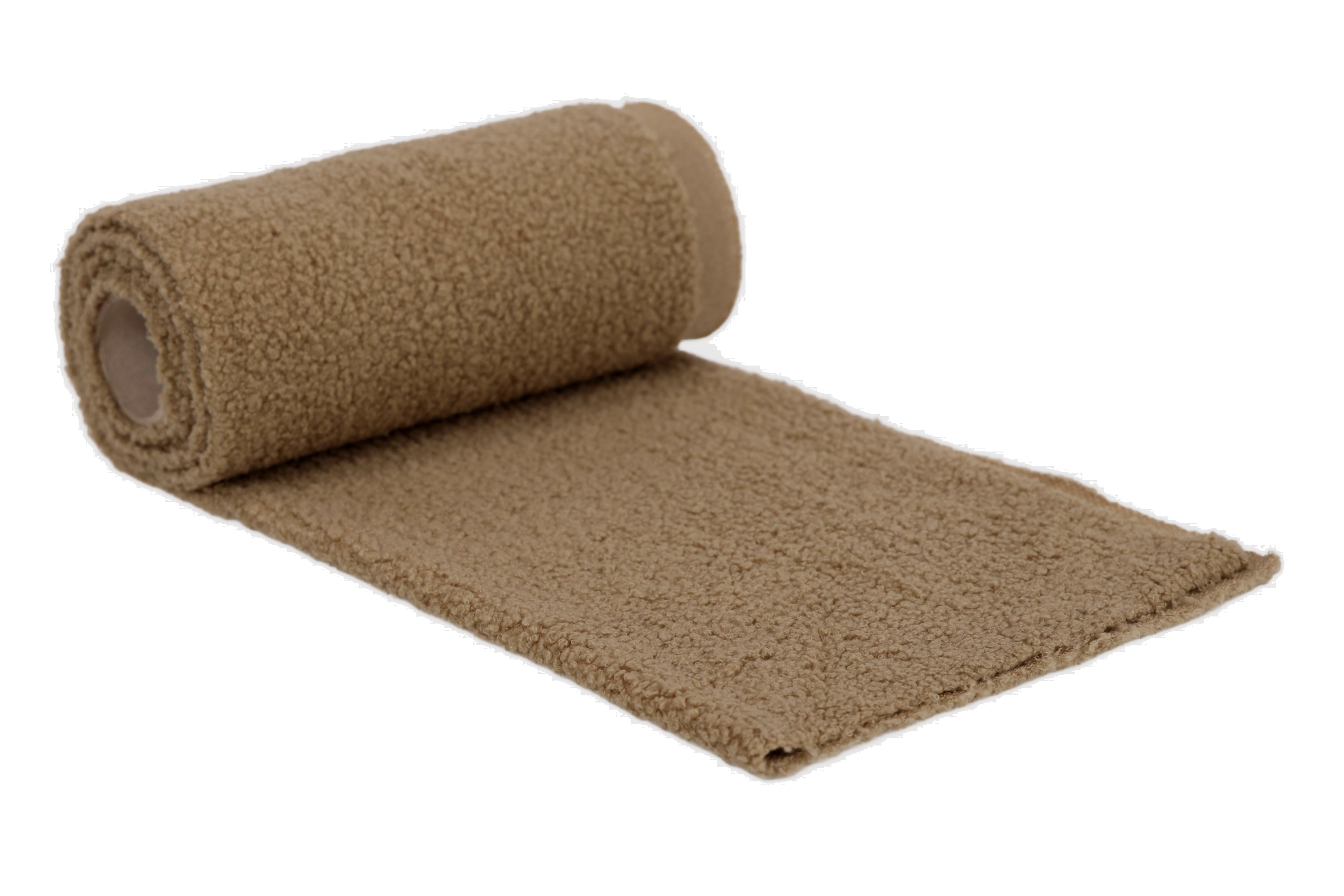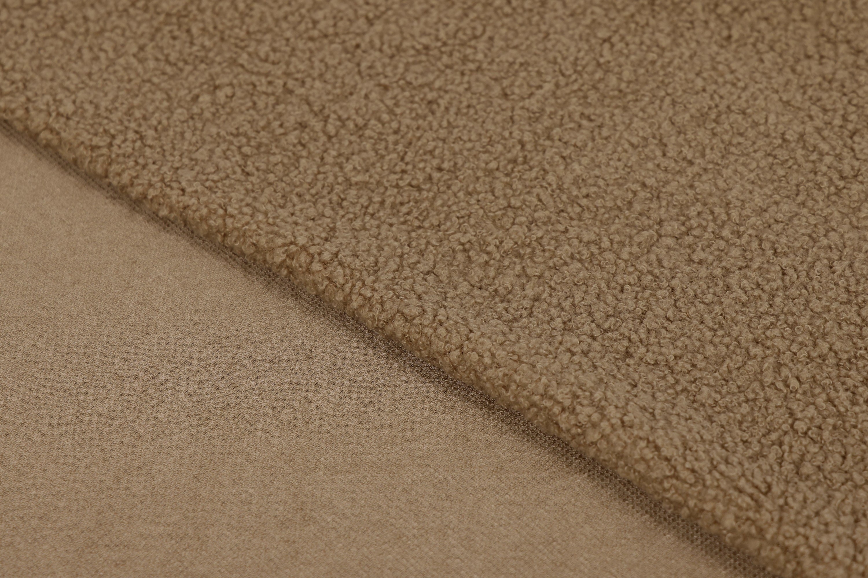 Minky Lamm Boucle ist extrem weich und zart. Das Material ist in der Breite stark dehnbar und in der Länge leicht dehnbar. Hergestellt aus Polyesterfasern zeichnet es sich vor allem durch eine sehr gute Wärmedämmung aus und ist zudem hydrophob. Das Material ist einseitig – auf der Außenseite ähnelt die Textur einem Schaffell, auf der Unterseite ist es glatt. Es ist sehr angenehm zu berühren. Es unterscheidet sich vom Minky-Lamm in der Art und Weise, wie sein Fell verarbeitet ist. Hier haben wir lockige Schlaufen, während das Haar bei Sherpa gebürstet und flauschiger ist.