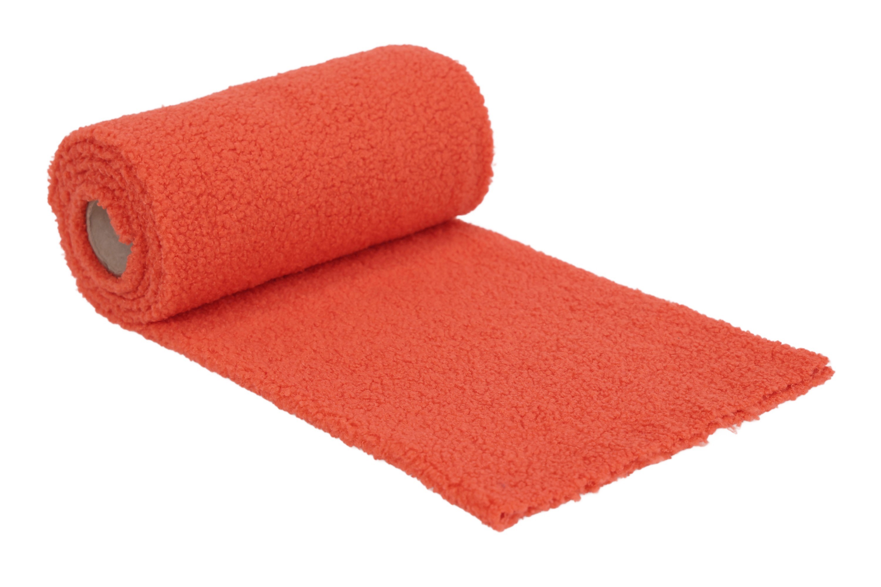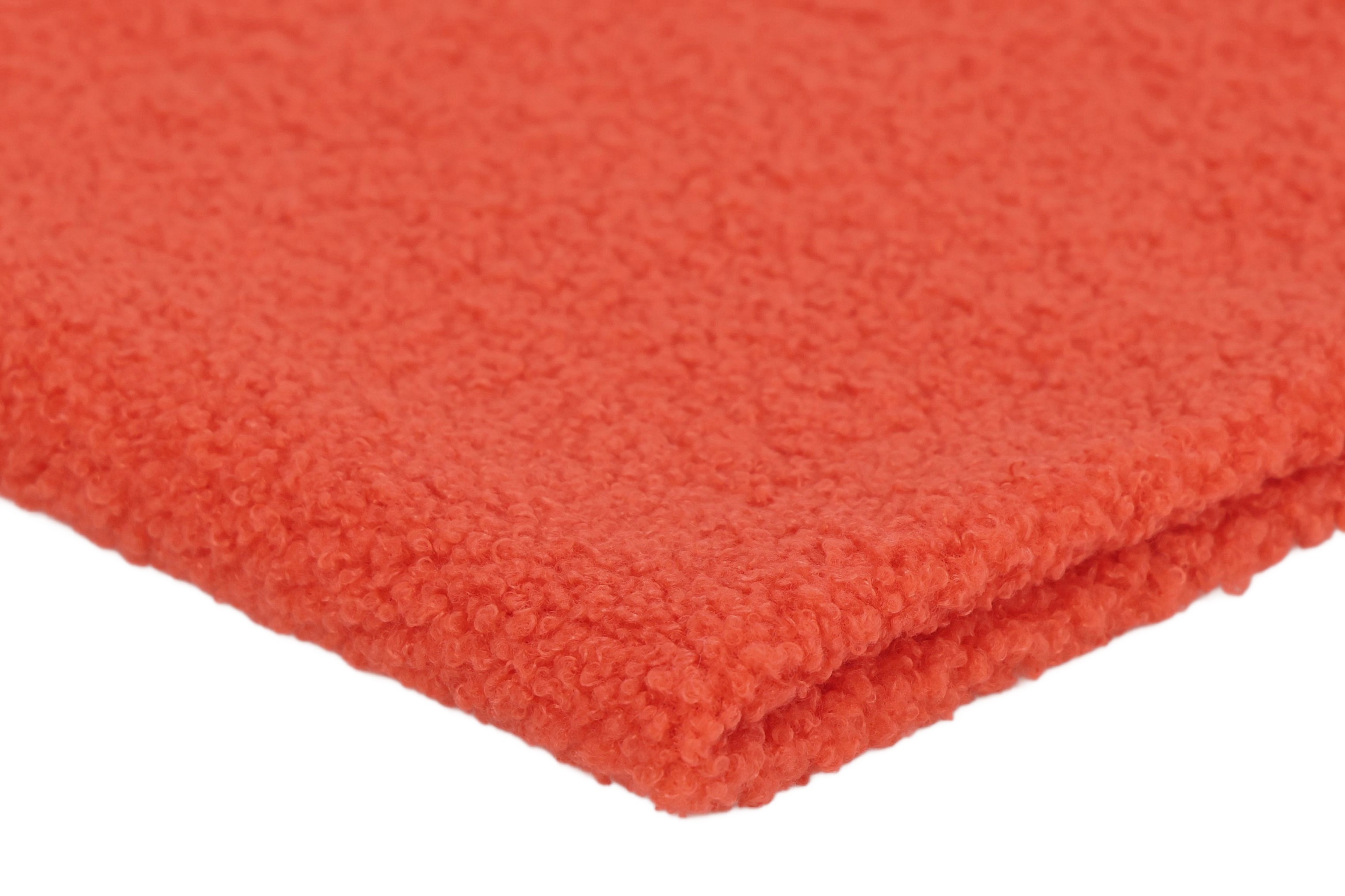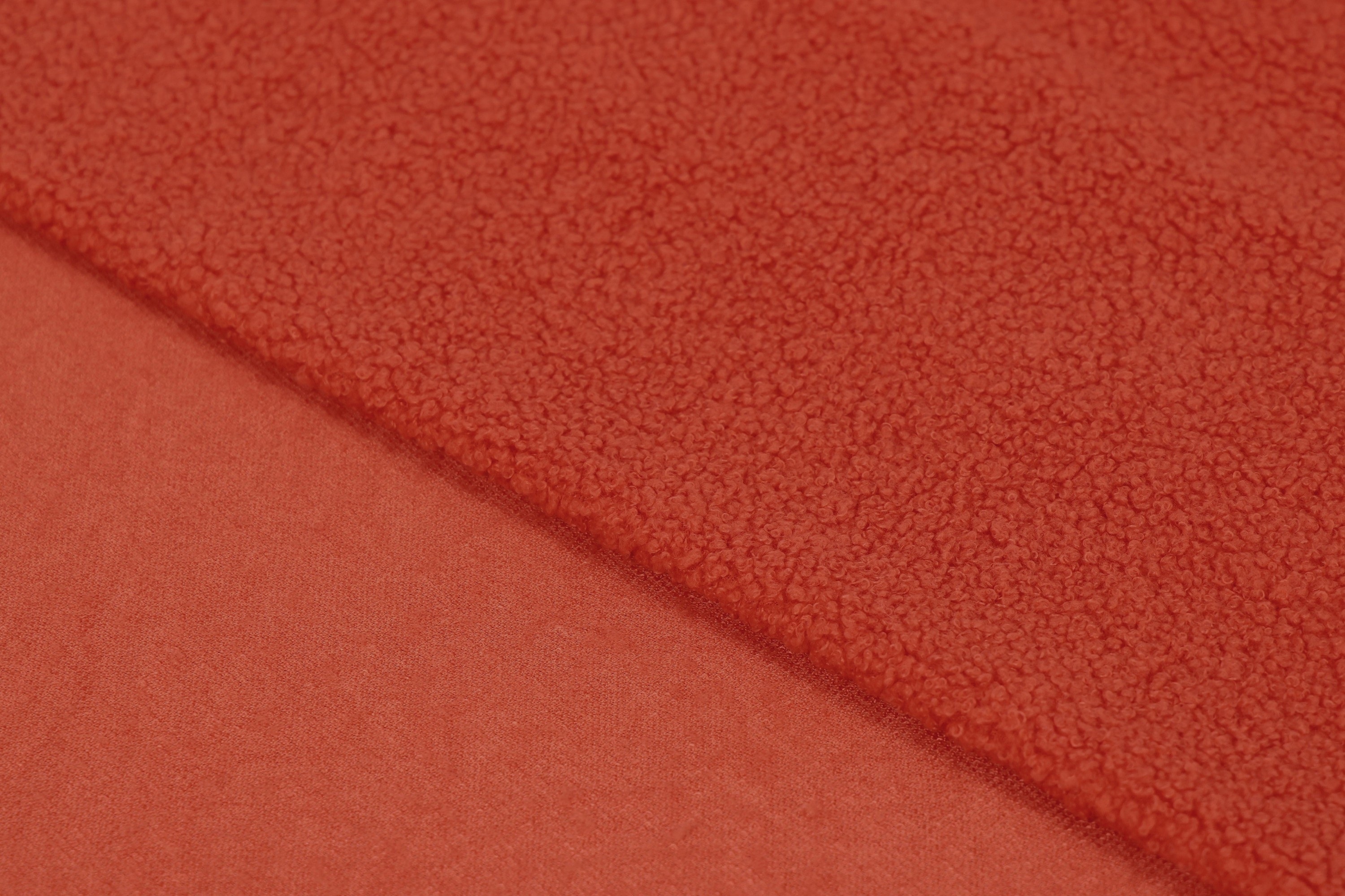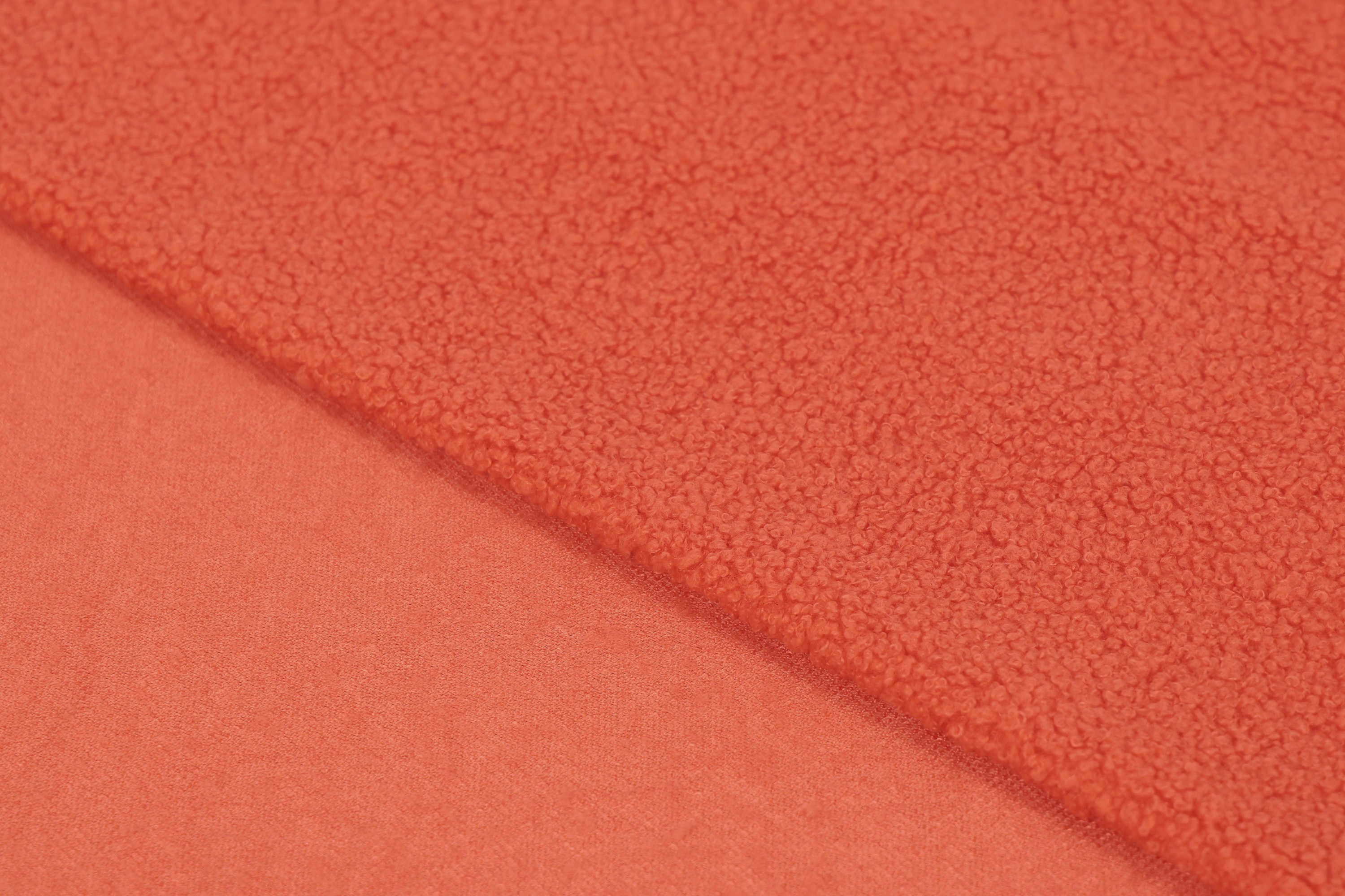 Minky Lamm Boucle ist extrem weich und zart. Das Material ist in der Breite stark dehnbar und in der Länge leicht dehnbar. Hergestellt aus Polyesterfasern zeichnet es sich vor allem durch eine sehr gute Wärmedämmung aus und ist zudem hydrophob. Das Material ist einseitig – auf der Außenseite ähnelt die Textur einem Schaffell, auf der Unterseite ist es glatt. Es ist sehr angenehm zu berühren. Es unterscheidet sich vom Minky-Lamm in der Art und Weise, wie sein Fell verarbeitet ist. Hier haben wir lockige Schlaufen, während das Haar bei Sherpa gebürstet und flauschiger ist.