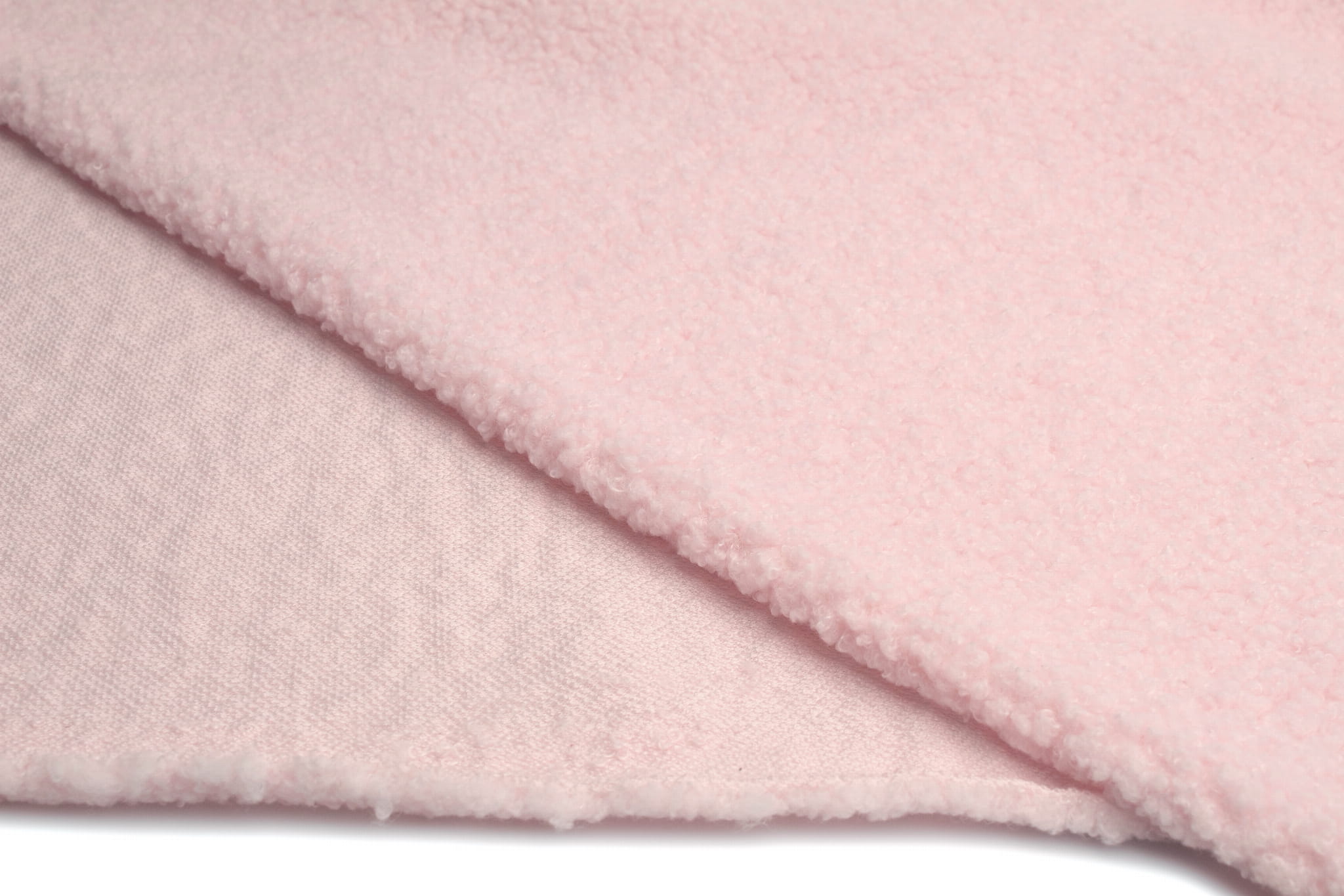 Minky Lamm Boucle ist extrem weich und zart. Das Material ist in der Breite stark dehnbar und in der Länge leicht dehnbar. Hergestellt aus Polyesterfasern zeichnet es sich vor allem durch eine sehr gute Wärmedämmung aus und ist zudem hydrophob. Das Material ist einseitig – auf der Außenseite ähnelt die Textur einem Schaffell, auf der Unterseite ist es glatt. Es ist sehr angenehm zu berühren. Es unterscheidet sich vom Minky-Lamm in der Art und Weise, wie sein Fell verarbeitet ist. Hier haben wir lockige Schlaufen, während das Haar bei Sherpa gebürstet und flauschiger ist.