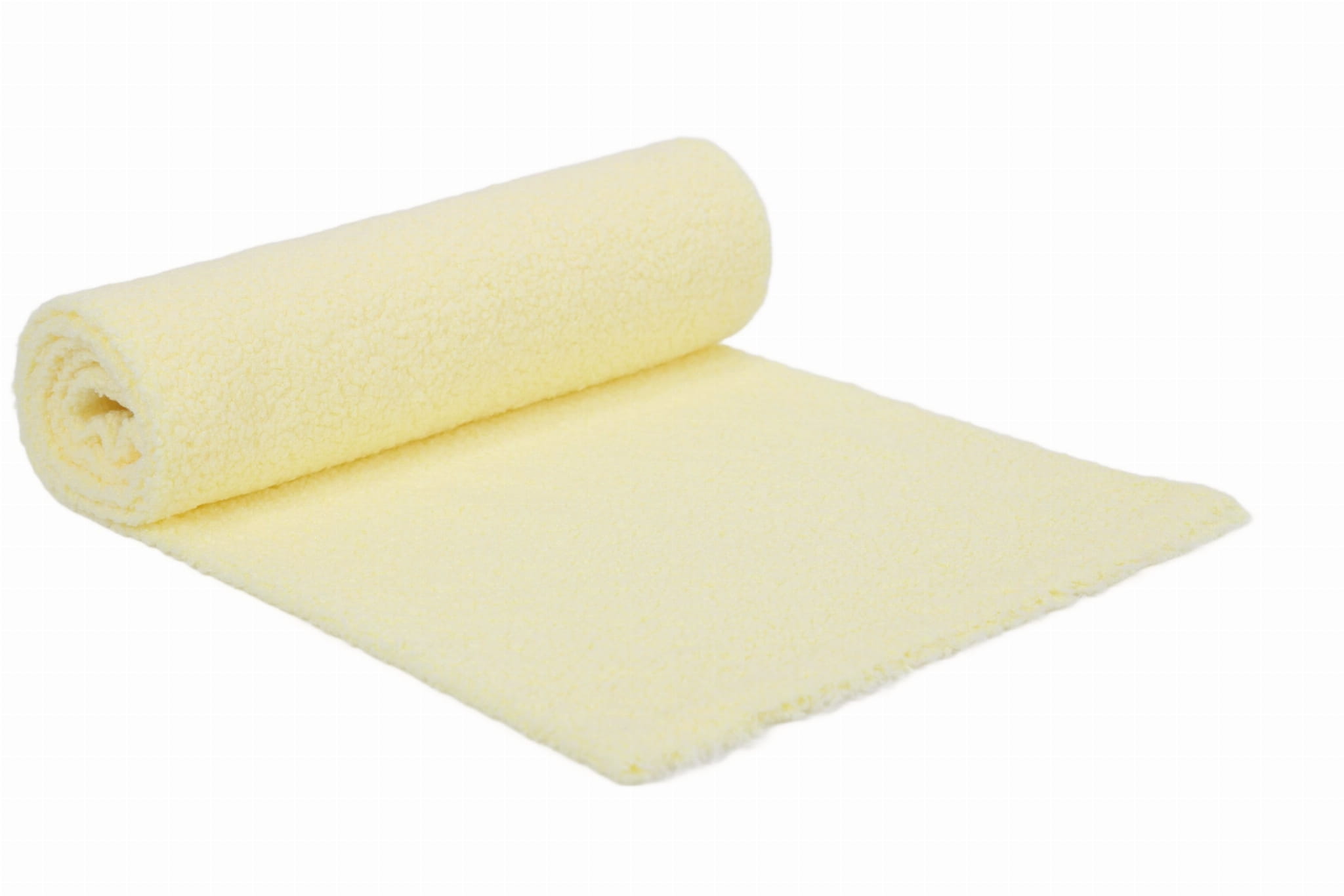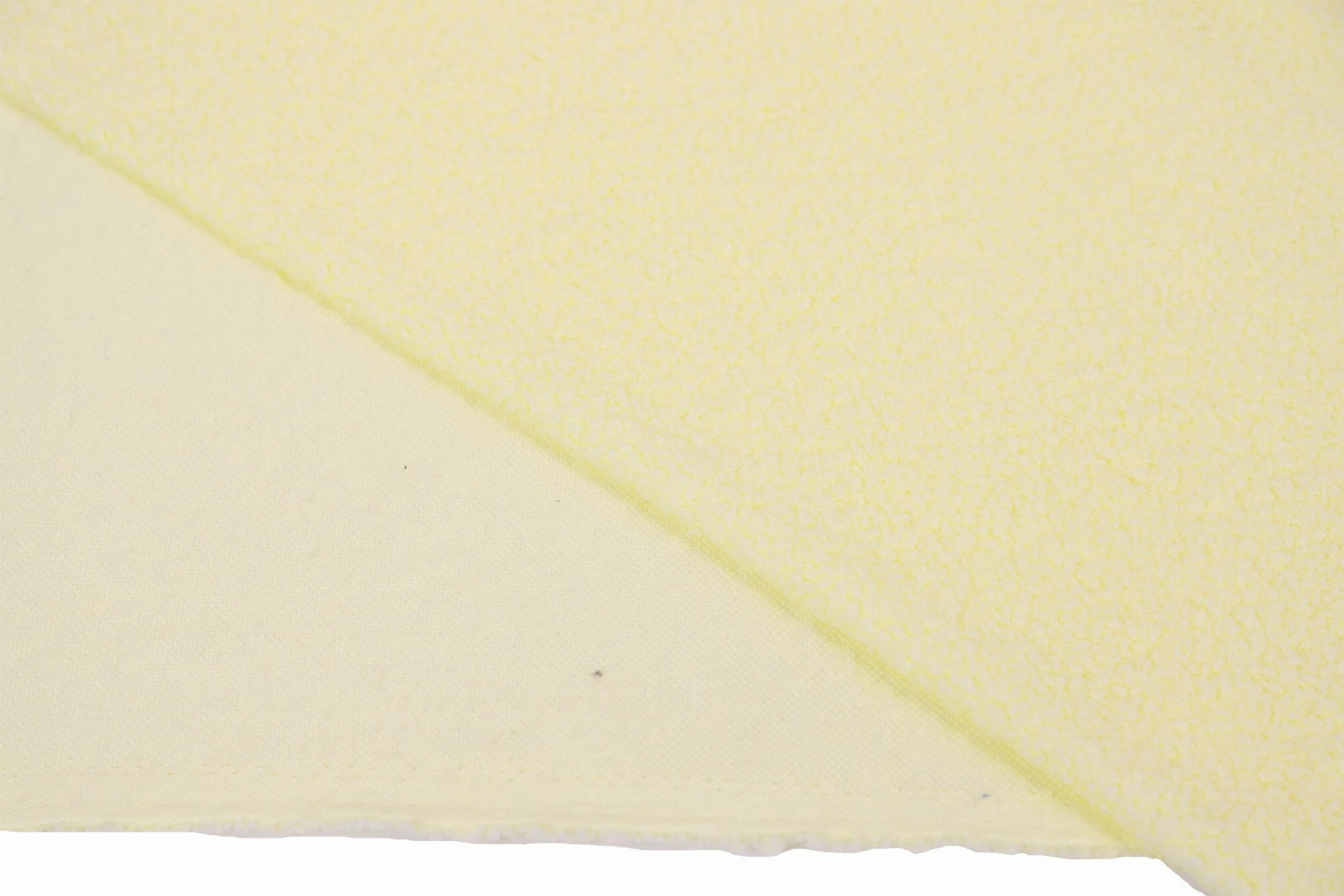 Minky Lamm Boucle ist extrem weich und zart. Das Material ist in der Breite stark dehnbar und in der Länge leicht dehnbar. Hergestellt aus Polyesterfasern zeichnet es sich vor allem durch eine sehr gute Wärmedämmung aus und ist zudem hydrophob. Das Material ist einseitig – auf der Außenseite ähnelt die Textur einem Schaffell, auf der Unterseite ist es glatt. Es ist sehr angenehm zu berühren. Es unterscheidet sich vom Minky-Lamm in der Art und Weise, wie sein Fell verarbeitet ist. Hier haben wir lockige Schlaufen, während das Haar bei Sherpa gebürstet und flauschiger ist.