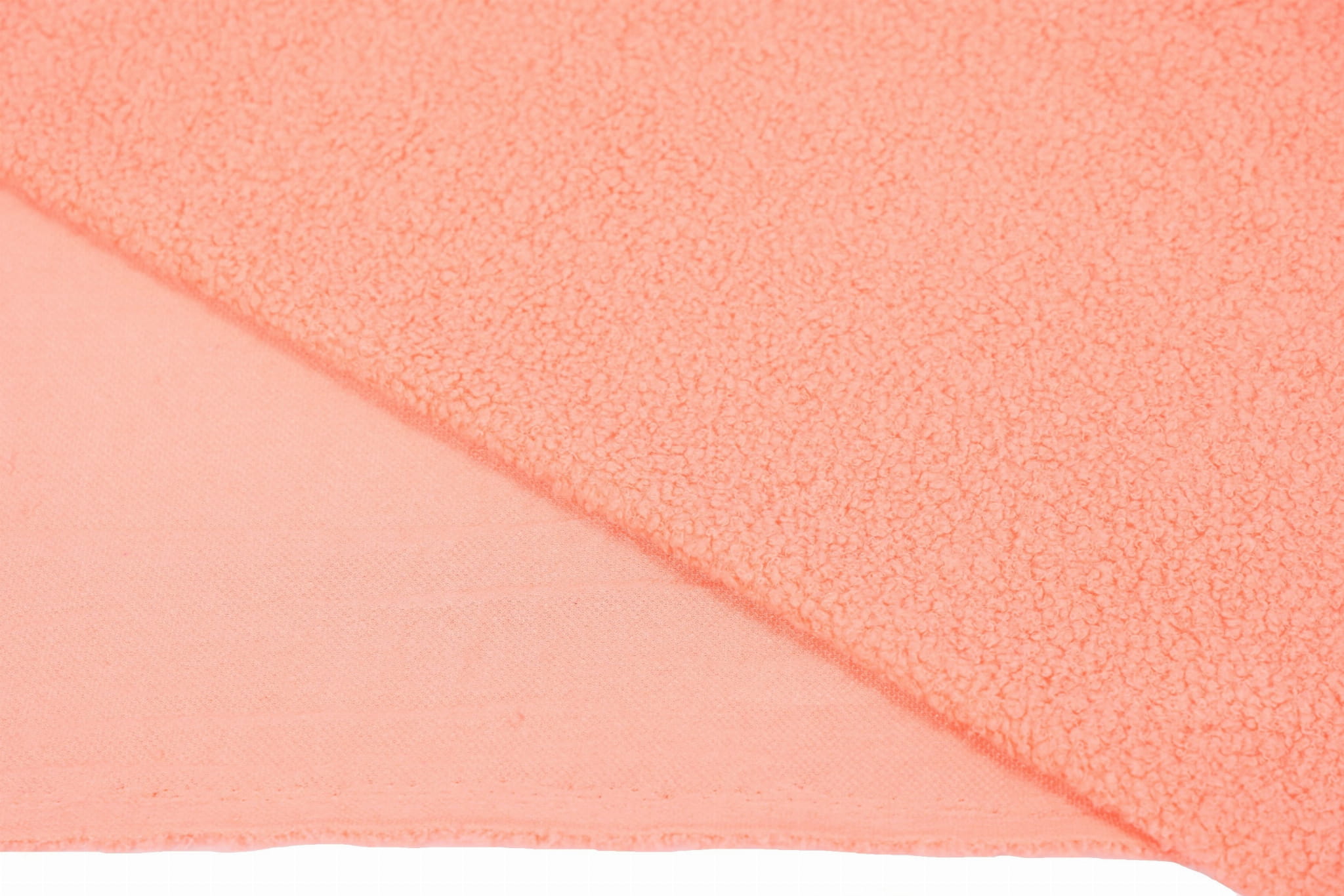 Minky Lamm Boucle ist extrem weich und zart. Das Material ist in der Breite stark dehnbar und in der Länge leicht dehnbar. Hergestellt aus Polyesterfasern zeichnet es sich vor allem durch eine sehr gute Wärmedämmung aus und ist zudem hydrophob. Das Material ist einseitig – auf der Außenseite ähnelt die Textur einem Schaffell, auf der Unterseite ist es glatt. Es ist sehr angenehm zu berühren. Es unterscheidet sich vom Minky-Lamm in der Art und Weise, wie sein Fell verarbeitet ist. Hier haben wir lockige Schlaufen, während das Haar bei Sherpa gebürstet und flauschiger ist.