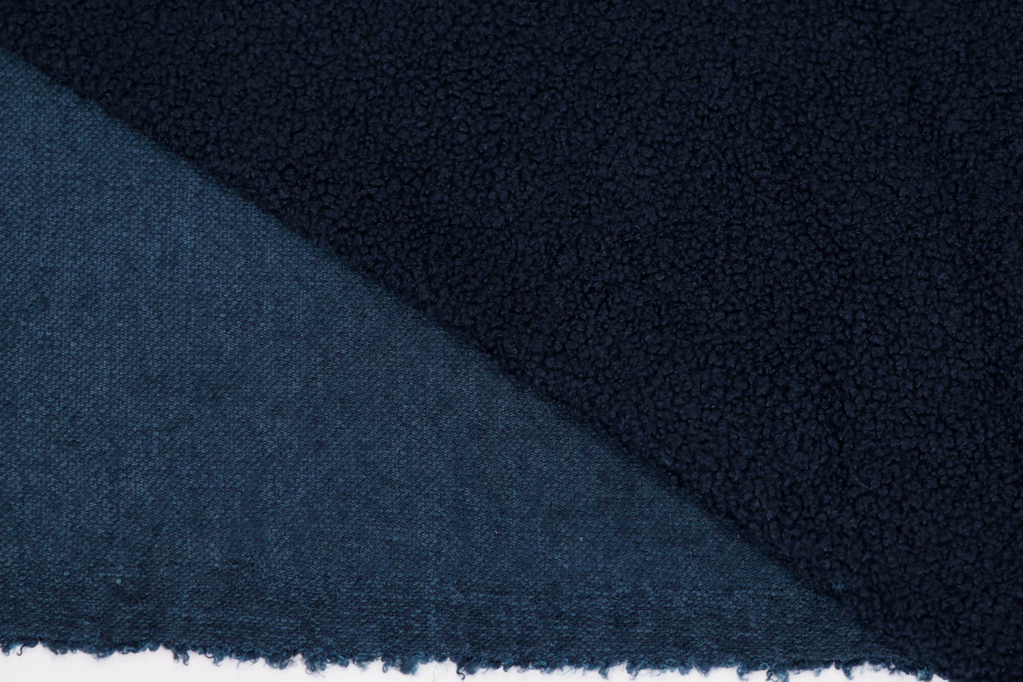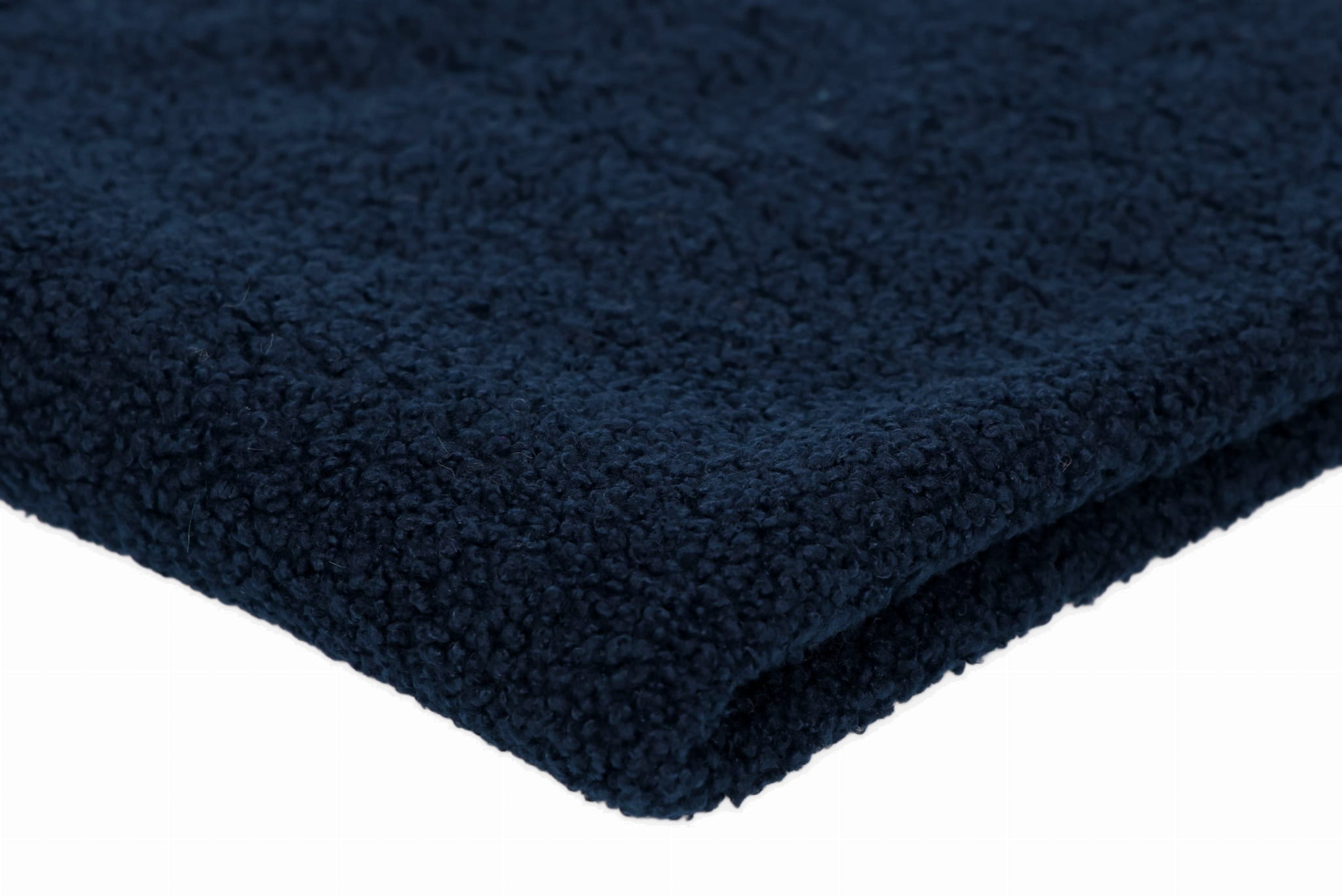 Minky Lamm Boucle ist extrem weich und zart. Das Material ist in der Breite stark dehnbar und in der Länge leicht dehnbar. Hergestellt aus Polyesterfasern zeichnet es sich vor allem durch eine sehr gute Wärmedämmung aus und ist zudem hydrophob. Das Material ist einseitig – auf der Außenseite ähnelt die Textur einem Schaffell, auf der Unterseite ist es glatt. Es ist sehr angenehm zu berühren. Es unterscheidet sich vom Minky-Lamm in der Art und Weise, wie sein Fell verarbeitet ist. Hier haben wir lockige Schlaufen, während das Haar bei Sherpa gebürstet und flauschiger ist.