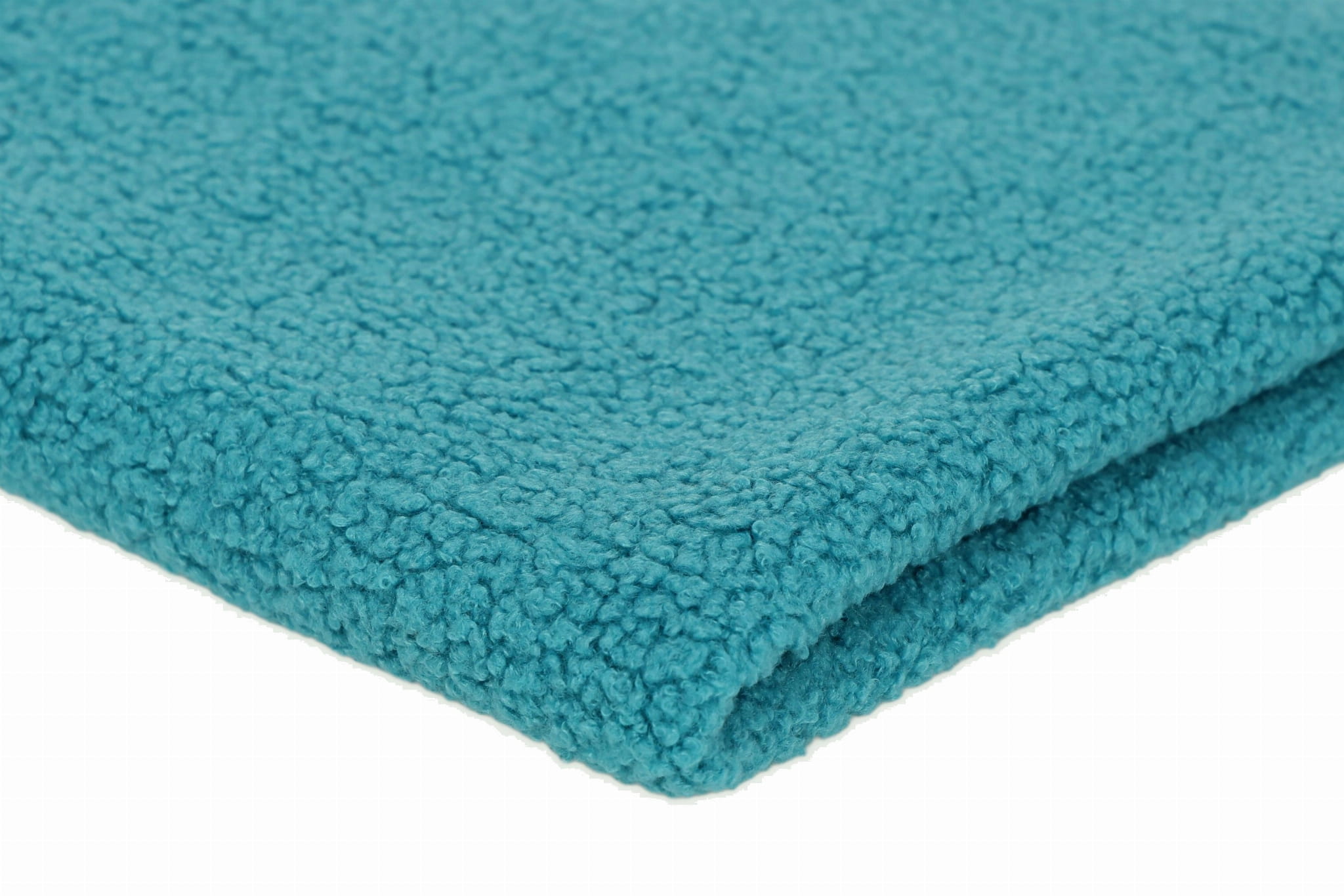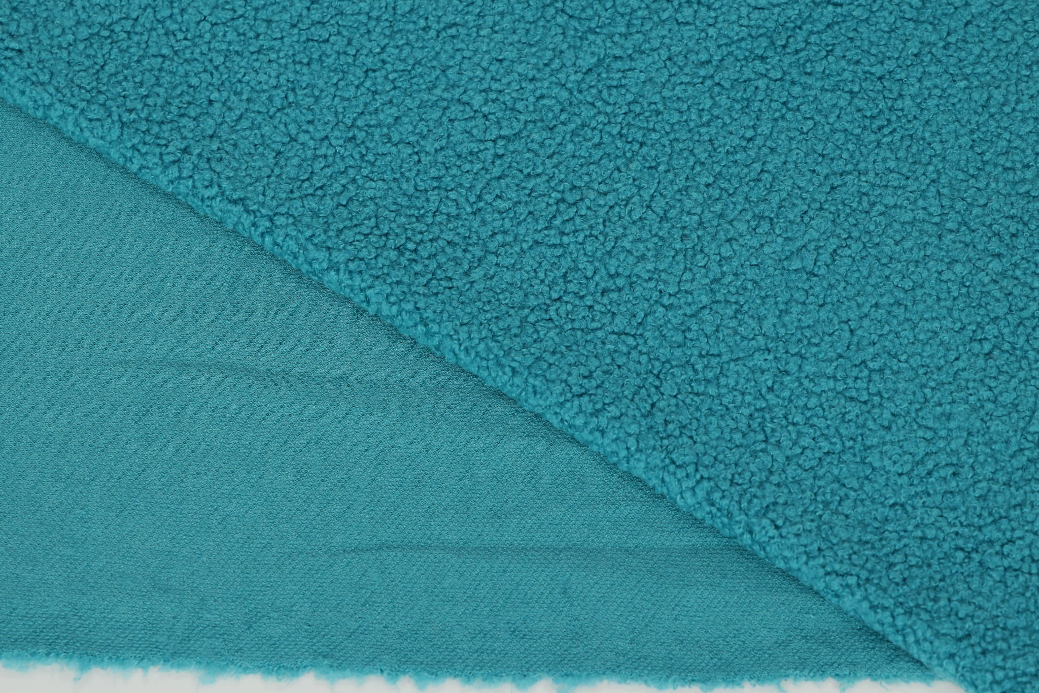Minky Lamm Boucle ist extrem weich und zart. Das Material ist in der Breite stark dehnbar und in der Länge leicht dehnbar. Hergestellt aus Polyesterfasern zeichnet es sich vor allem durch eine sehr gute Wärmedämmung aus und ist zudem hydrophob. Das Material ist einseitig – auf der Außenseite ähnelt die Textur einem Schaffell, auf der Unterseite ist es glatt. Es ist sehr angenehm zu berühren. Es unterscheidet sich vom Minky-Lamm in der Art und Weise, wie sein Fell verarbeitet ist. Hier haben wir lockige Schlaufen, während das Haar bei Sherpa gebürstet und flauschiger ist.