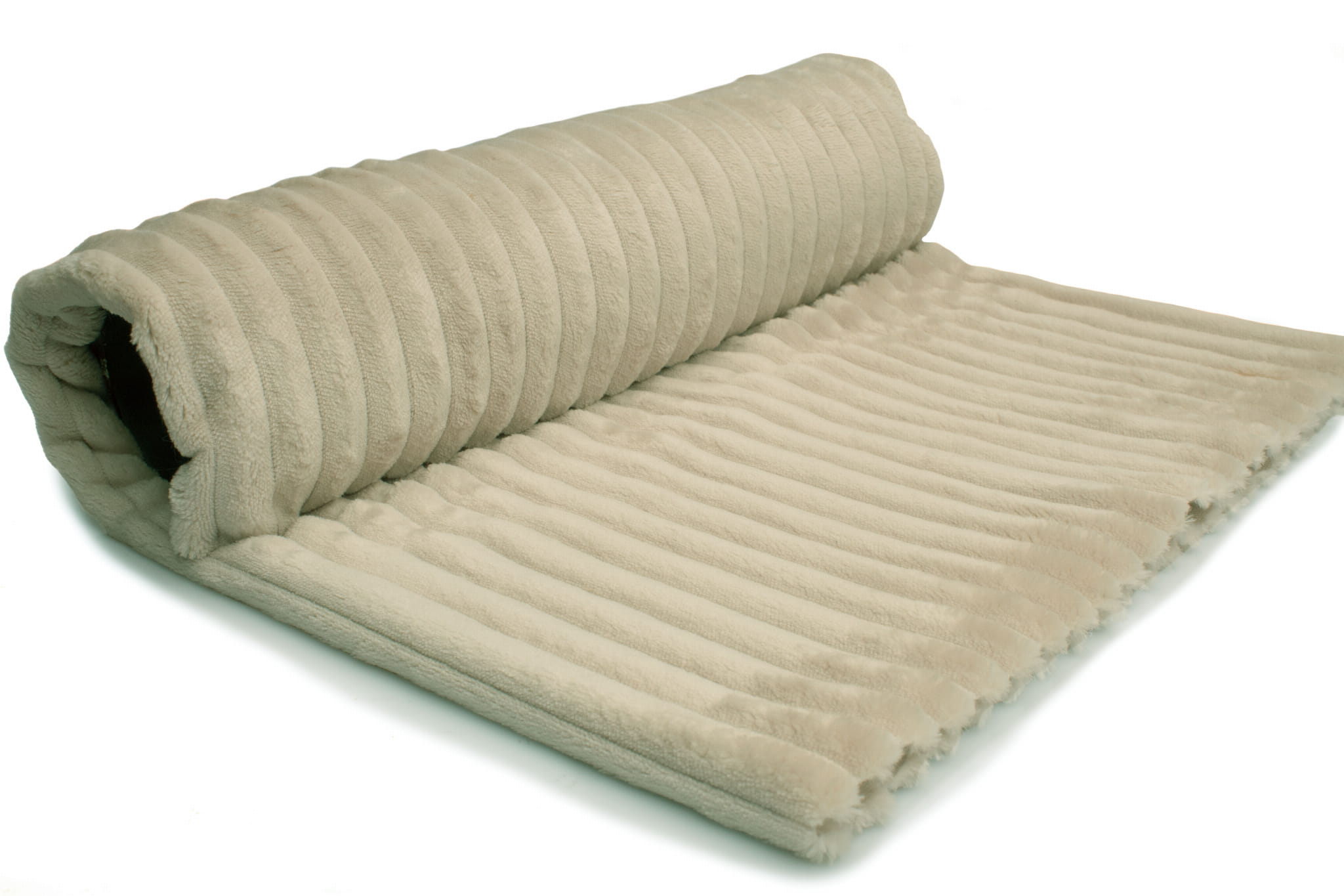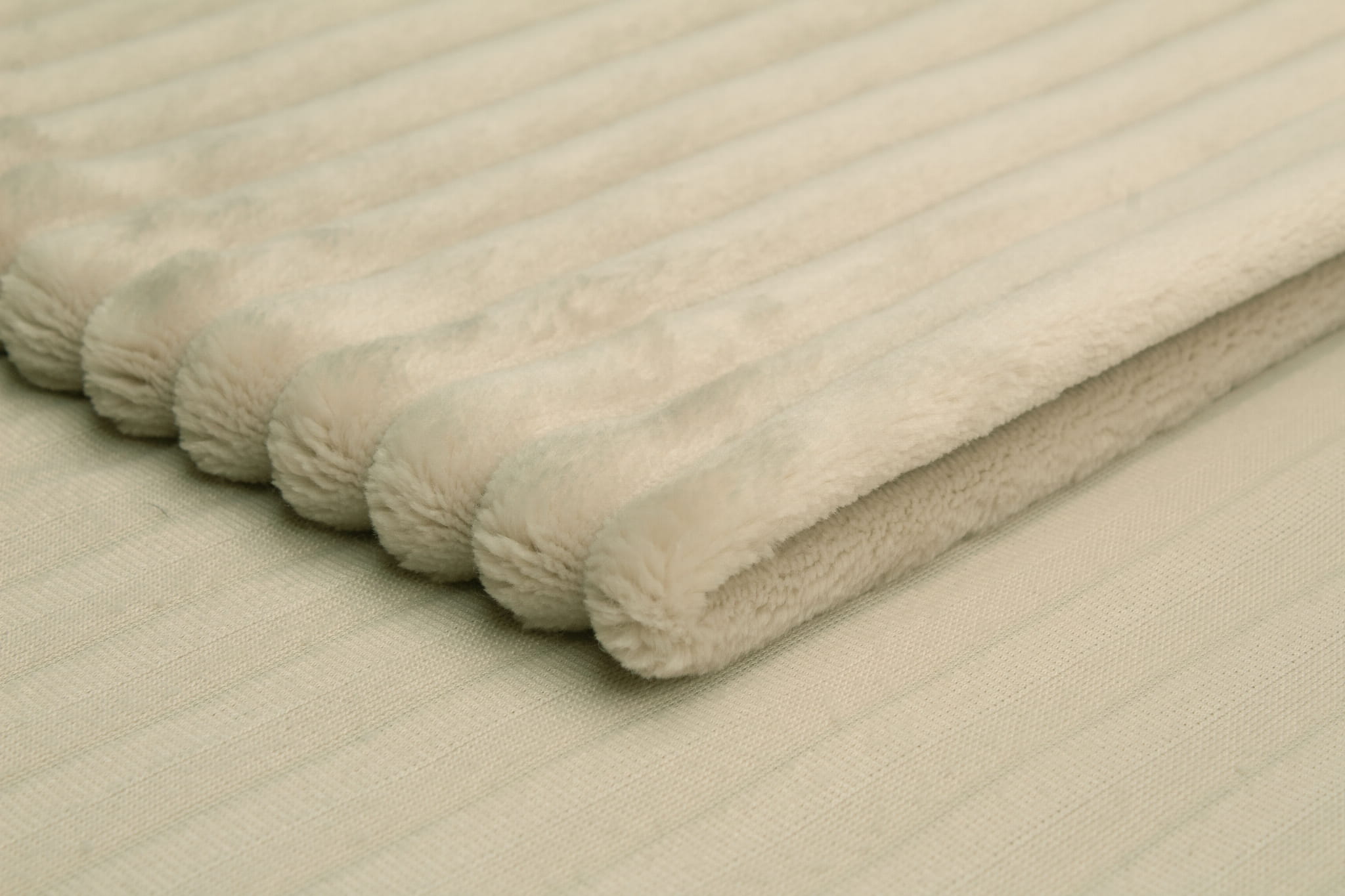 Minky Streifen ist ein Gewirk aus Polyesterfasern. Es zeichnet sich vor allem durch eine sehr gute Wärmedämmung und eine weiche und äußerst kuschelige Materialstruktur aus. Oben wurden die Borsten zu dekorativen Streifen geschnitten. Die gestrickte Unterseite ist glatt. Streifendicke: 15 mm, Musterdicke: ca. 18 mm, Borstenhöhe am höchsten Punkt: ca. 7 mm.