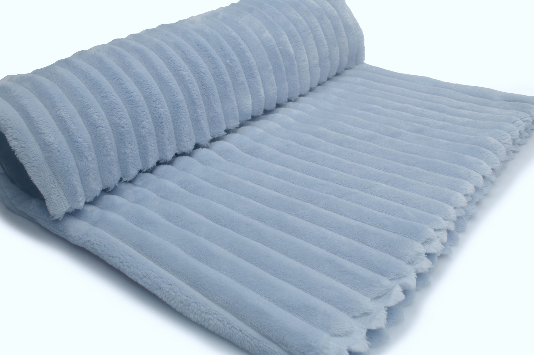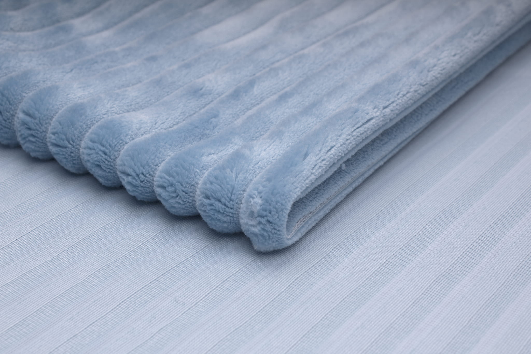Minky Streifen ist ein Gewirk aus Polyesterfasern. Es zeichnet sich vor allem durch eine sehr gute Wärmedämmung und eine weiche und äußerst kuschelige Materialstruktur aus. Oben wurden die Borsten zu dekorativen Streifen geschnitten. Die gestrickte Unterseite ist glatt. Streifendicke: 15 mm, Musterdicke: ca. 18 mm, Borstenhöhe am höchsten Punkt: ca. 7 mm.