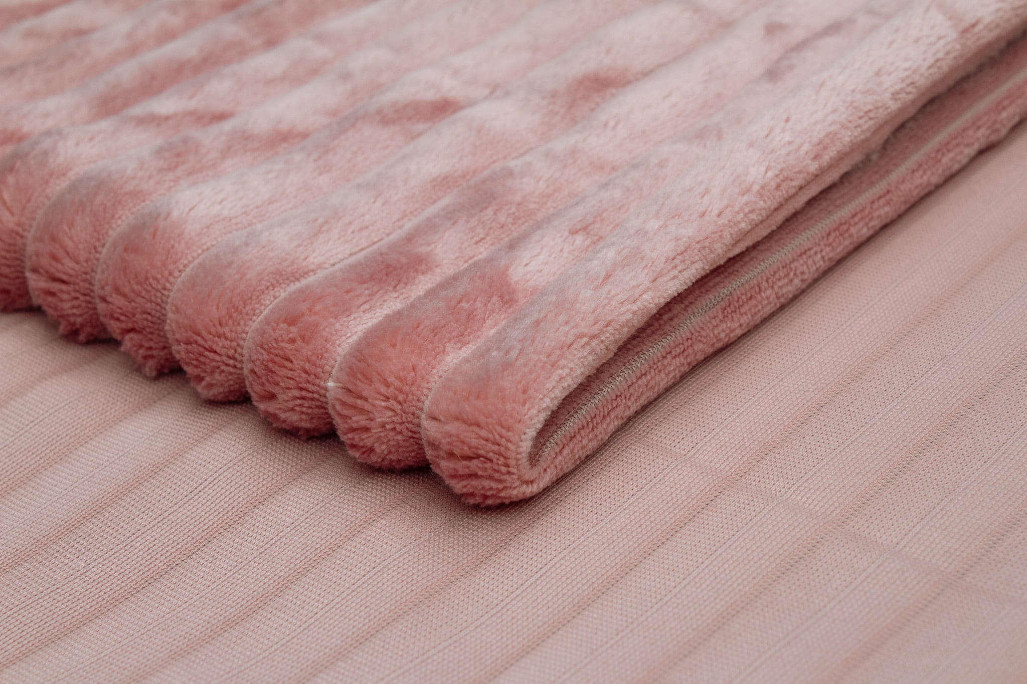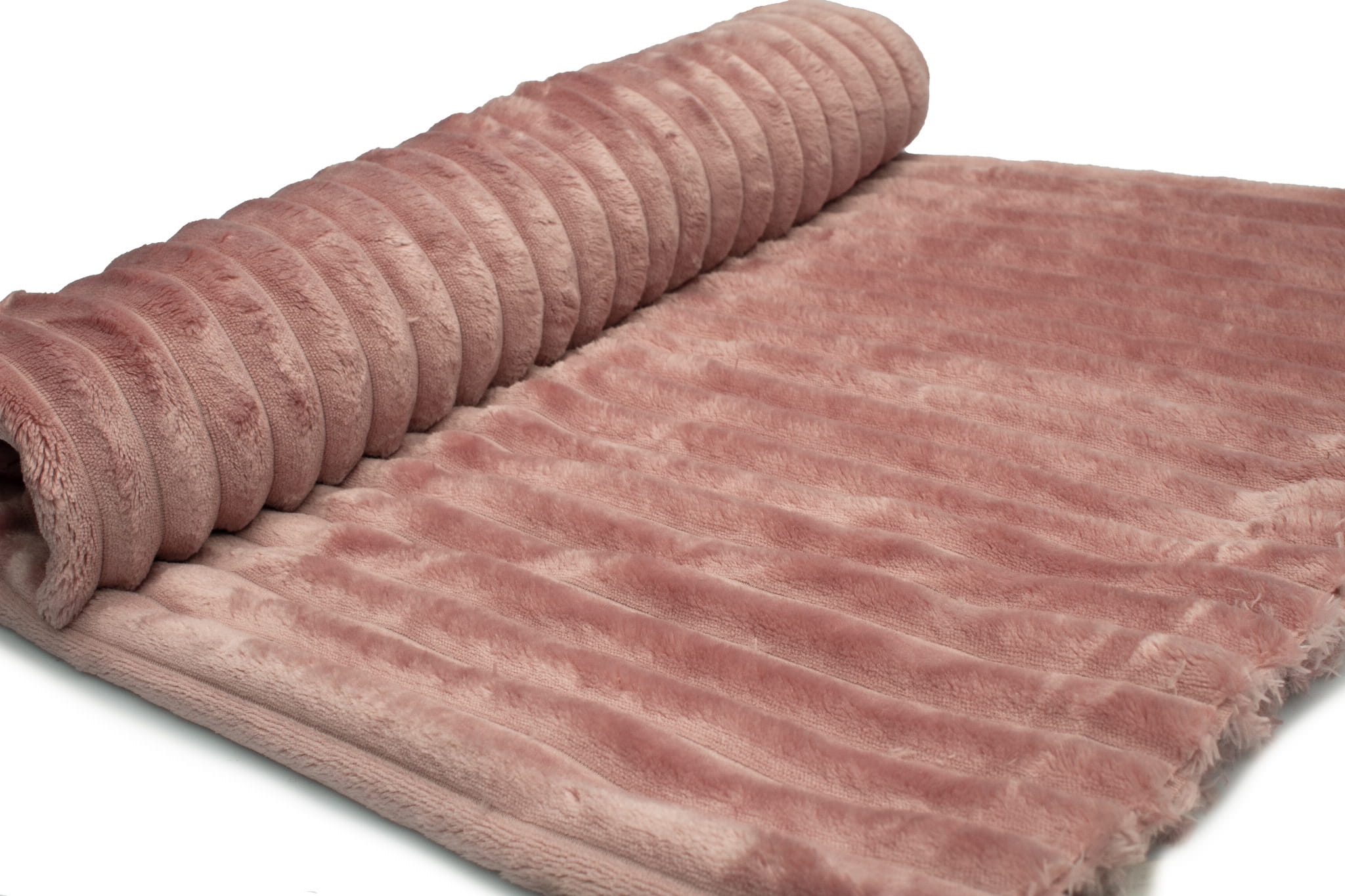 Minky Streifen ist ein Gewirk aus Polyesterfasern. Es zeichnet sich vor allem durch eine sehr gute Wärmedämmung und eine weiche und äußerst kuschelige Materialstruktur aus. Oben wurden die Borsten zu dekorativen Streifen geschnitten. Die gestrickte Unterseite ist glatt. Streifendicke: 15 mm, Musterdicke: ca. 18 mm, Borstenhöhe am höchsten Punkt: ca. 7 mm.