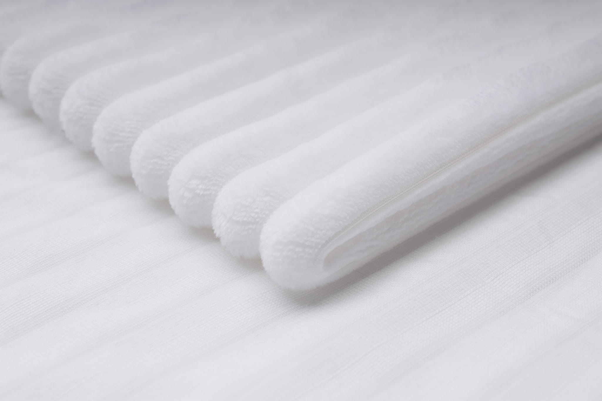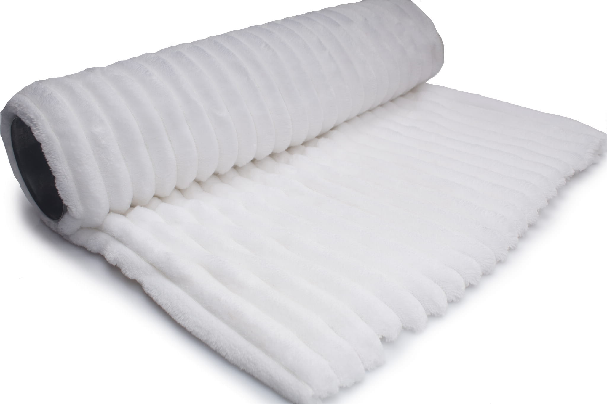 Minky Streifen ist ein Gewirk aus Polyesterfasern. Es zeichnet sich vor allem durch eine sehr gute Wärmedämmung und eine weiche und äußerst kuschelige Materialstruktur aus. Oben wurden die Borsten zu dekorativen Streifen geschnitten. Die gestrickte Unterseite ist glatt. Streifendicke: 15 mm, Musterdicke: ca. 18 mm, Borstenhöhe am höchsten Punkt: ca. 7 mm.