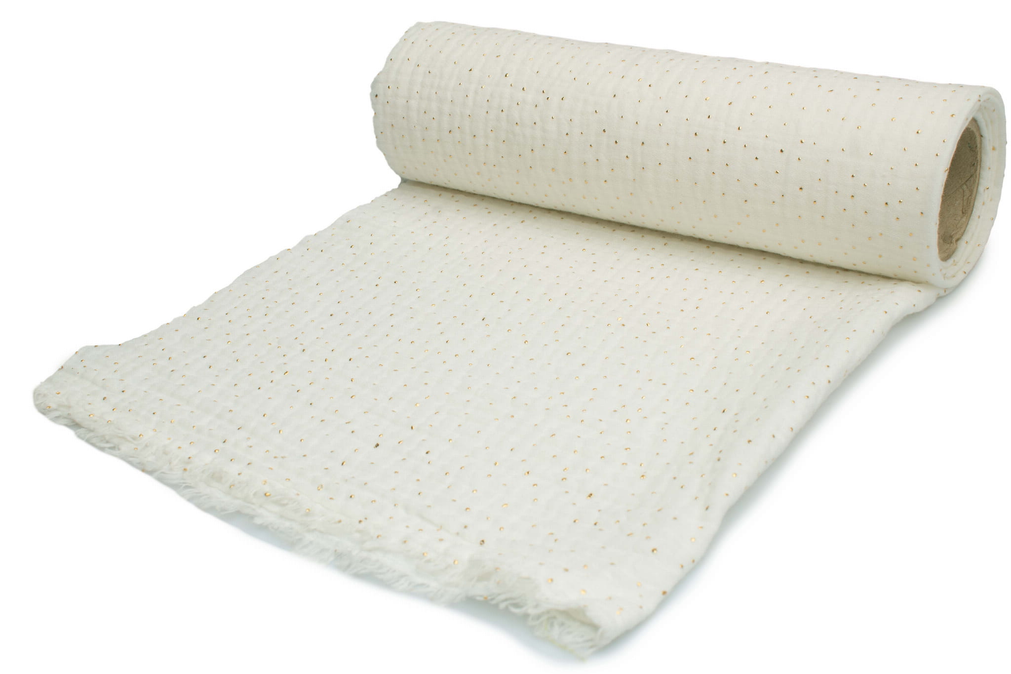Musselin zeichnet sich durch außergewöhnliche Subtilität aus. Ursprünglich wurde es aus natürlichen Ressourcen hergestellt: Seide, Baumwolle, Leinen oder Wolle. Derzeit können Sie sich mit einer anderen Zusammensetzung treffen, aber die wünschenswerteste ist 100% Baumwolle. Wir können 3 Arten von Musselin unterscheiden: Single, Double und Triple Gaze, wobei die Namen die Anzahl der im Material vorhandenen Schichten angeben. Die einzelnen Lagen sind mit einer lockeren Leinenbindung gewebt und erzeugen durch ihre Verbindung eine charakteristische Faltenbildung des Stoffes. Double Gauze Baumwoll-Musselin ist dünn, leicht und sehr luftig. Dank zweier Materialschichten ist es blickdicht. Dieser Stoff ist sicher für die Haut: Seine natürliche Zusammensetzung verursacht keine Allergien, während die weichen Fasern keine Reizungen verursachen. Das Material sorgt für eine sehr gute Luftzirkulation und lässt die Haut an heißen Tagen atmen. Es ist hygroskopisch, was bedeutet, dass es viel Wasser aufnehmen kann, während es dank seiner lockeren Webart recht schnell trocknet. Die oben genannten Funktionen ermöglichen die breite Verwendung von Musselin.