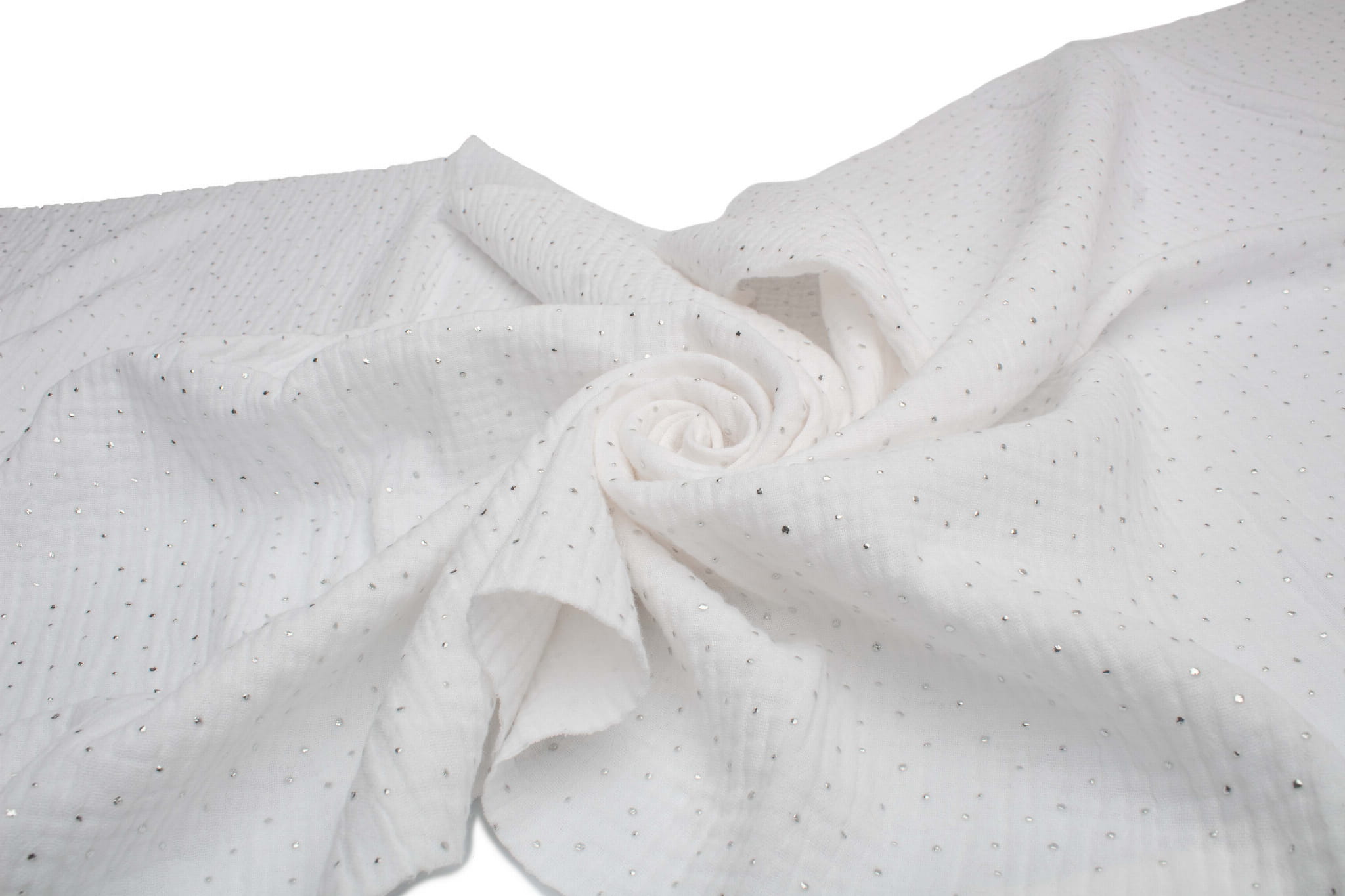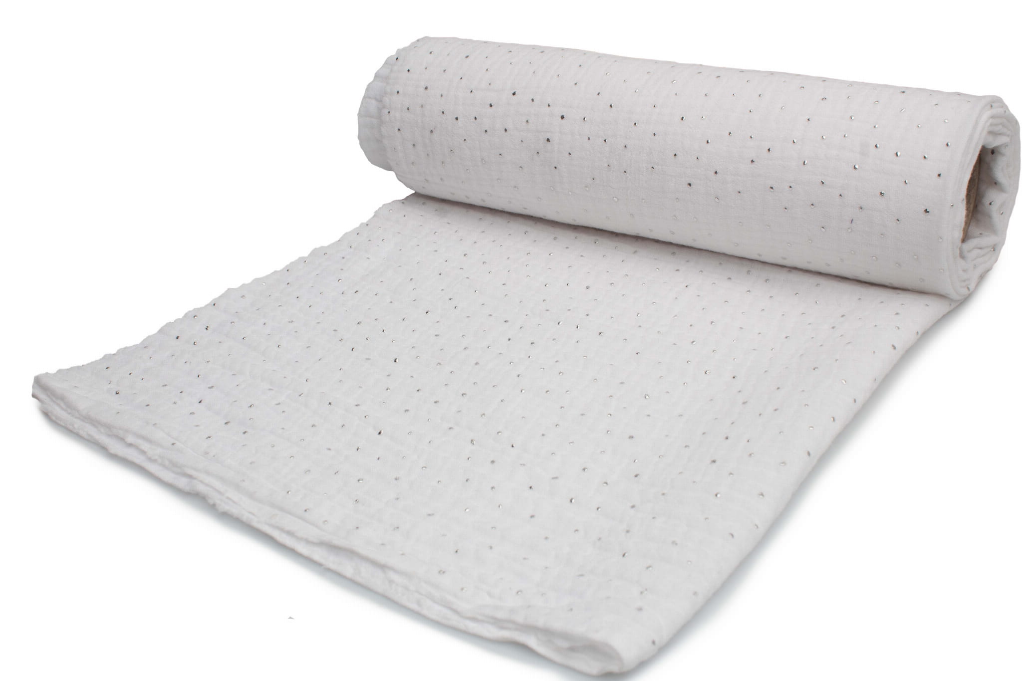 Musselin zeichnet sich durch außergewöhnliche Subtilität aus. Ursprünglich wurde es aus natürlichen Ressourcen hergestellt: Seide, Baumwolle, Leinen oder Wolle. Derzeit können Sie sich mit einer anderen Zusammensetzung treffen, aber die wünschenswerteste ist 100% Baumwolle. Wir können 3 Arten von Musselin unterscheiden: Single, Double und Triple Gaze, wobei die Namen die Anzahl der im Material vorhandenen Schichten angeben. Die einzelnen Lagen sind mit einer lockeren Leinenbindung gewebt und erzeugen durch ihre Verbindung eine charakteristische Faltenbildung des Stoffes. Double Gauze Baumwoll-Musselin ist dünn, leicht und sehr luftig. Dank zweier Materialschichten ist es blickdicht. Dieser Stoff ist sicher für die Haut: Seine natürliche Zusammensetzung verursacht keine Allergien, während die weichen Fasern keine Reizungen verursachen. Das Material sorgt für eine sehr gute Luftzirkulation und lässt die Haut an heißen Tagen atmen. Es ist hygroskopisch, was bedeutet, dass es viel Wasser aufnehmen kann, während es dank seiner lockeren Webart recht schnell trocknet. Die oben genannten Funktionen ermöglichen die breite Verwendung von Musselin.