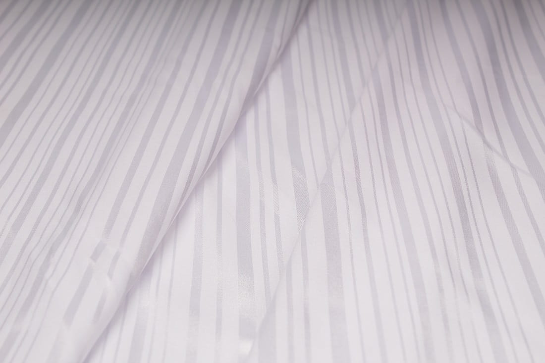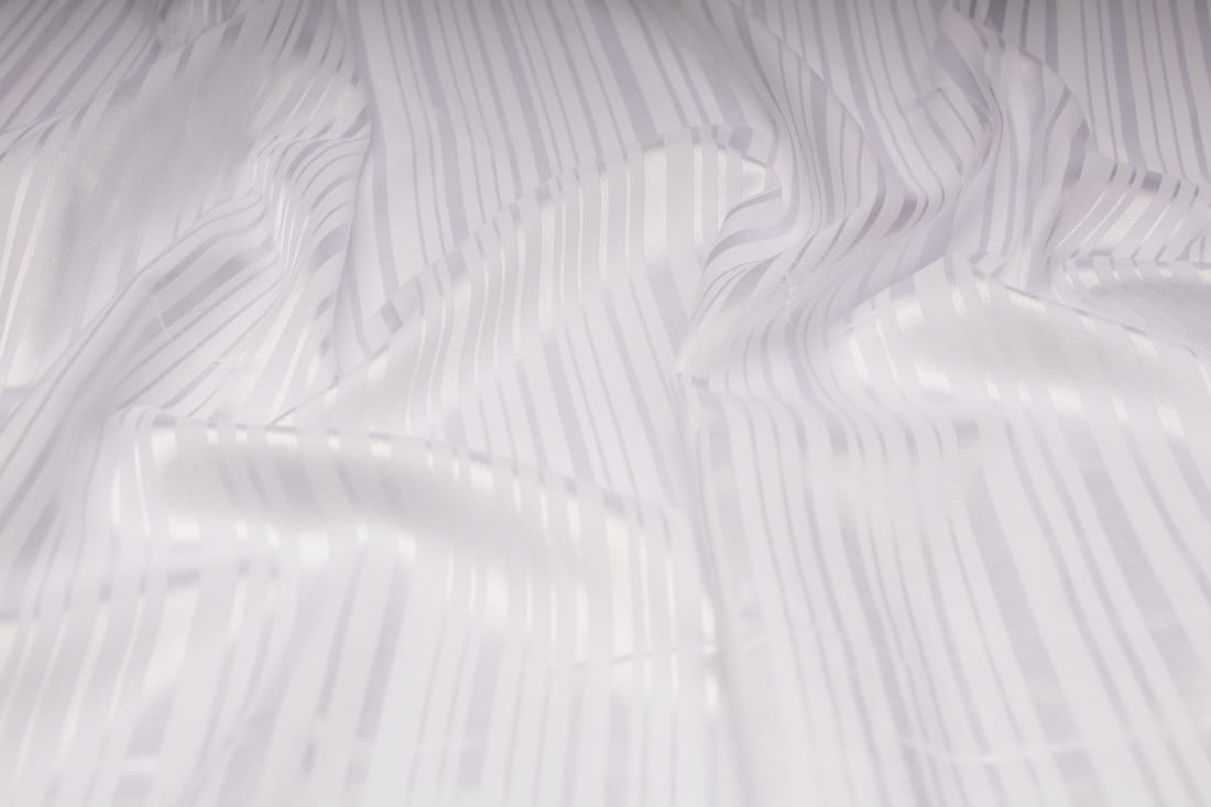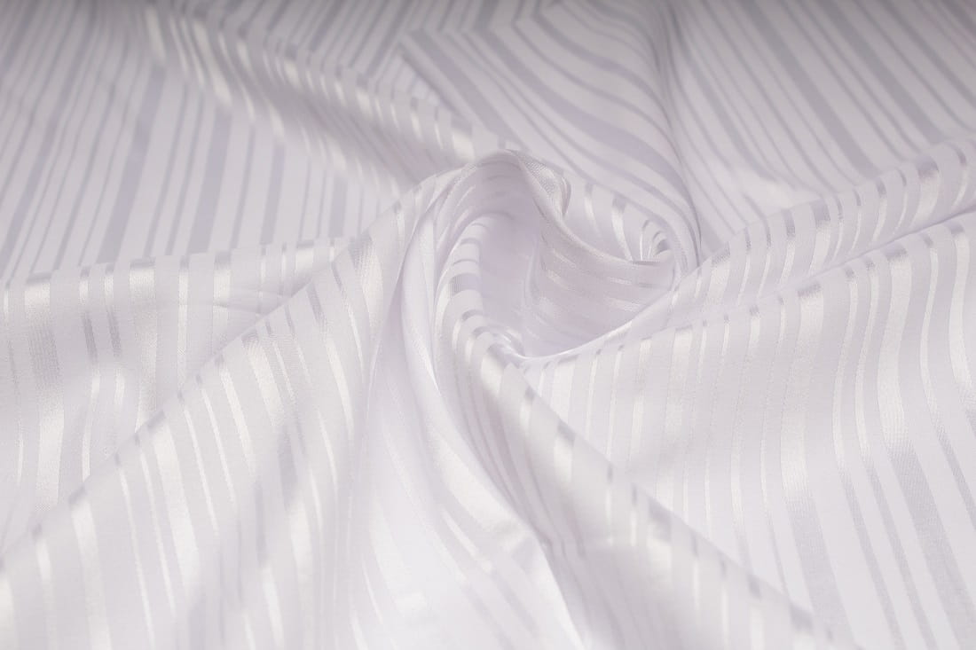 Satin ist einer der effektivsten Stoffe auf dem Markt mit einer breiten Palette an Kleidungsstücken und dekorativen Anwendungen. Der Name des Stoffes stammt aus dem alten chinesischen Handelshafen der Stadt Quanzhou, der auf Arabisch Zaiton genannt wurde. Satin ist ein einseitiger Stoff, bei der die rechte Seite des Gewebes wird mit einem Schuß (Satin) weben, und die linke Seite mit einem Satin-Webart hergestellt. Das Material zeichnet sich vor allem durch eine angenehm anzufassende und zarte Textur aus und das ungewöhnliche Aussehen einer glänzenden und eleganten Oberfläche. Gestreifter Satin ist eine weichere Version des klassischen Satins. Die Zugabe von Lycra macht das Material leicht dehnbar und passt sich perfekt dem Körper an. Dekorative Streifen, abwechselnd glänzend und matt, verleihen dem Stoff einen einzigartigen Charme. Sie wurden nach der Jacquard-Methode hergestellt. Die linke Seite des Stoffes ist das Negativ der rechten Seite.