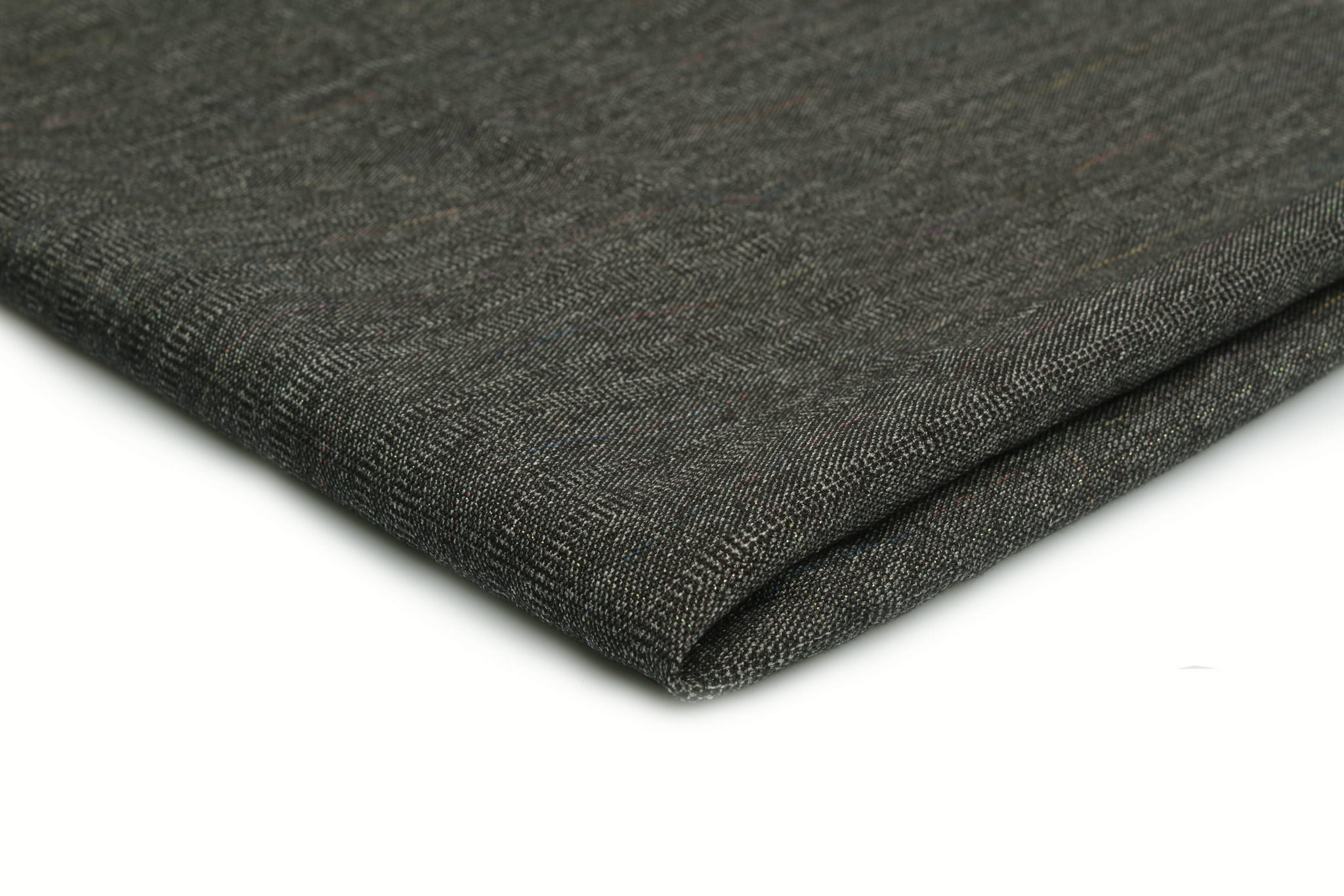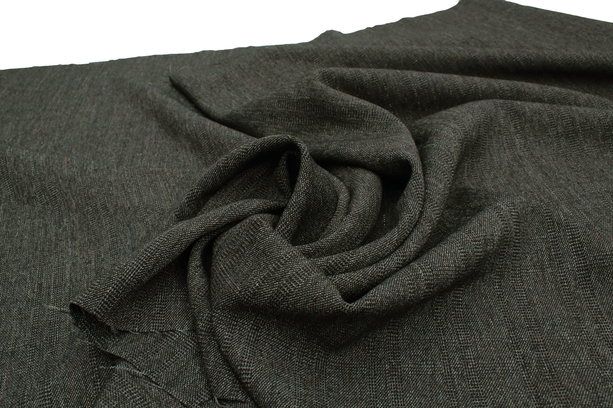 Ein Polyestergewebe, mit einer Köperbindung gewebt, leicht dehnbar. Es sieht aus wie Tweed, ist aber weicher und passt gut. Das dichte Gewebe macht es neben den hervorragenden visuellen Eigenschaften auch zu einem extrem haltbaren und haltbaren Material. Es ist sehr widerstandsfähig gegen alle Arten von Falten und Abrieb. Der visuelle Effekt wurde durch das Weben eines Glitzerfadens verfeinert, wodurch das Material einen Glanz erhielt.