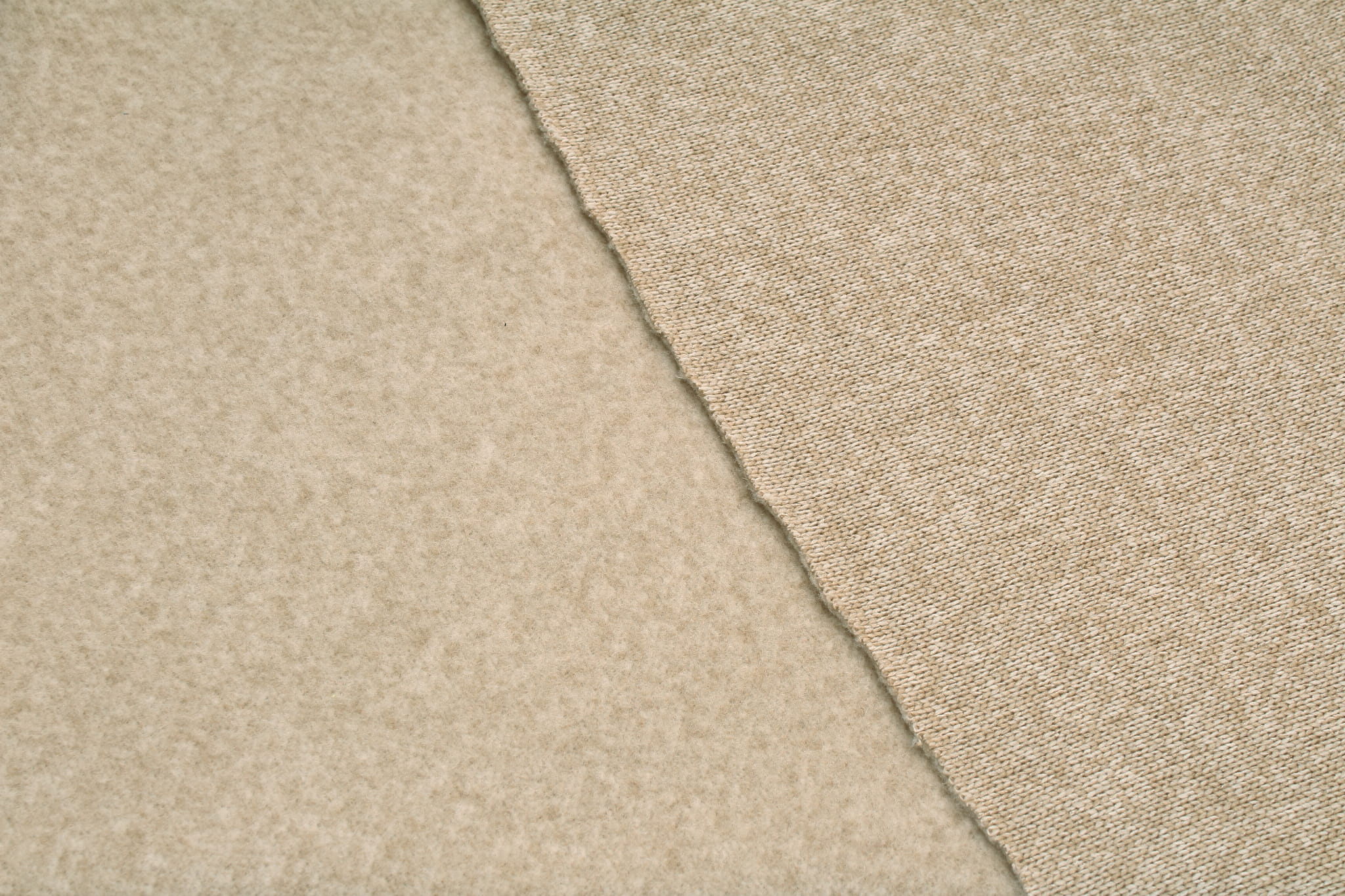 Ein Hacci ist ein Textilprodukt, das aus Reihen miteinander verbundener Ösen hergestellt wird. Das Garn in der Strickware hat eine sehr große Kerbe, wodurch die Strickware sehr elastisch und in alle Richtungen dehnbar ist. Das Material fühlt sich äußerst angenehm an. Dank dünner Fasern verleiht das Gewebe ihm Zartheit und Elastizität. Auf der Unterseite hat der Strick ein Fleece-Finish, das ihn warm, aber nicht schwer macht.