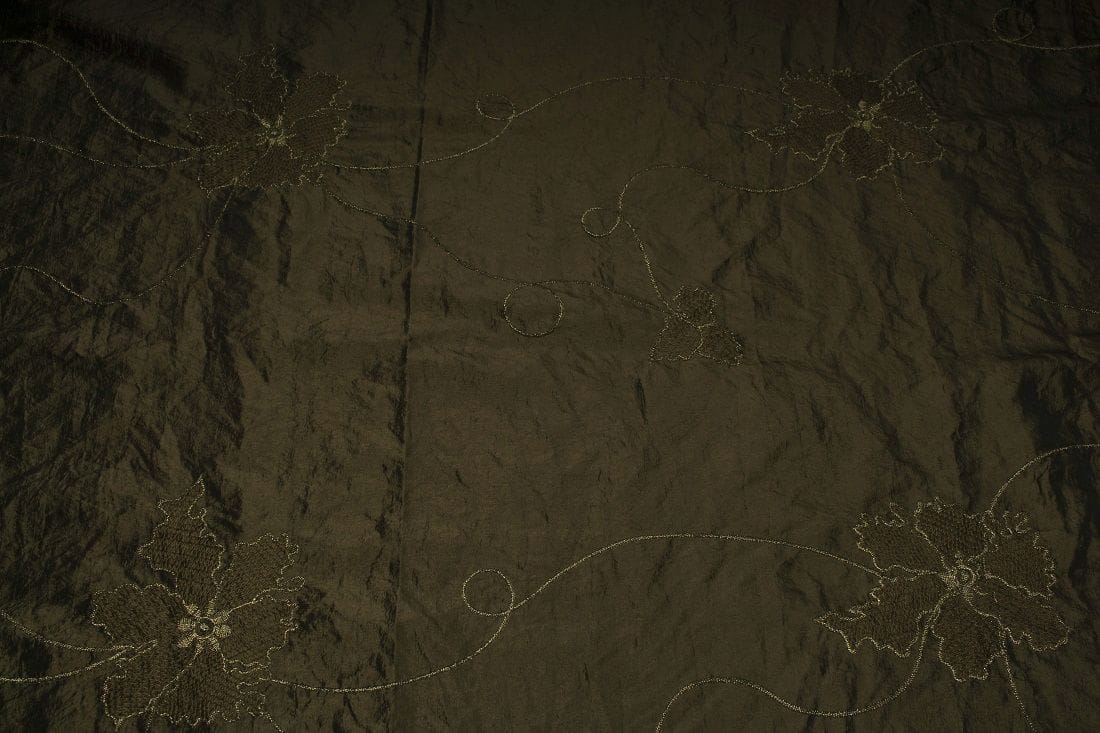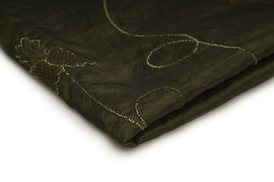 Ein Stoff mit einer steifen und raschelnden Textur und einer glänzenden Oberfläche, die mit Stickereien verziert ist. Taft ist ein sehr einzigartiges und optisch wirksames Material. Das gestickte Muster lässt den Stoff einzigartig und interessant aussehen.