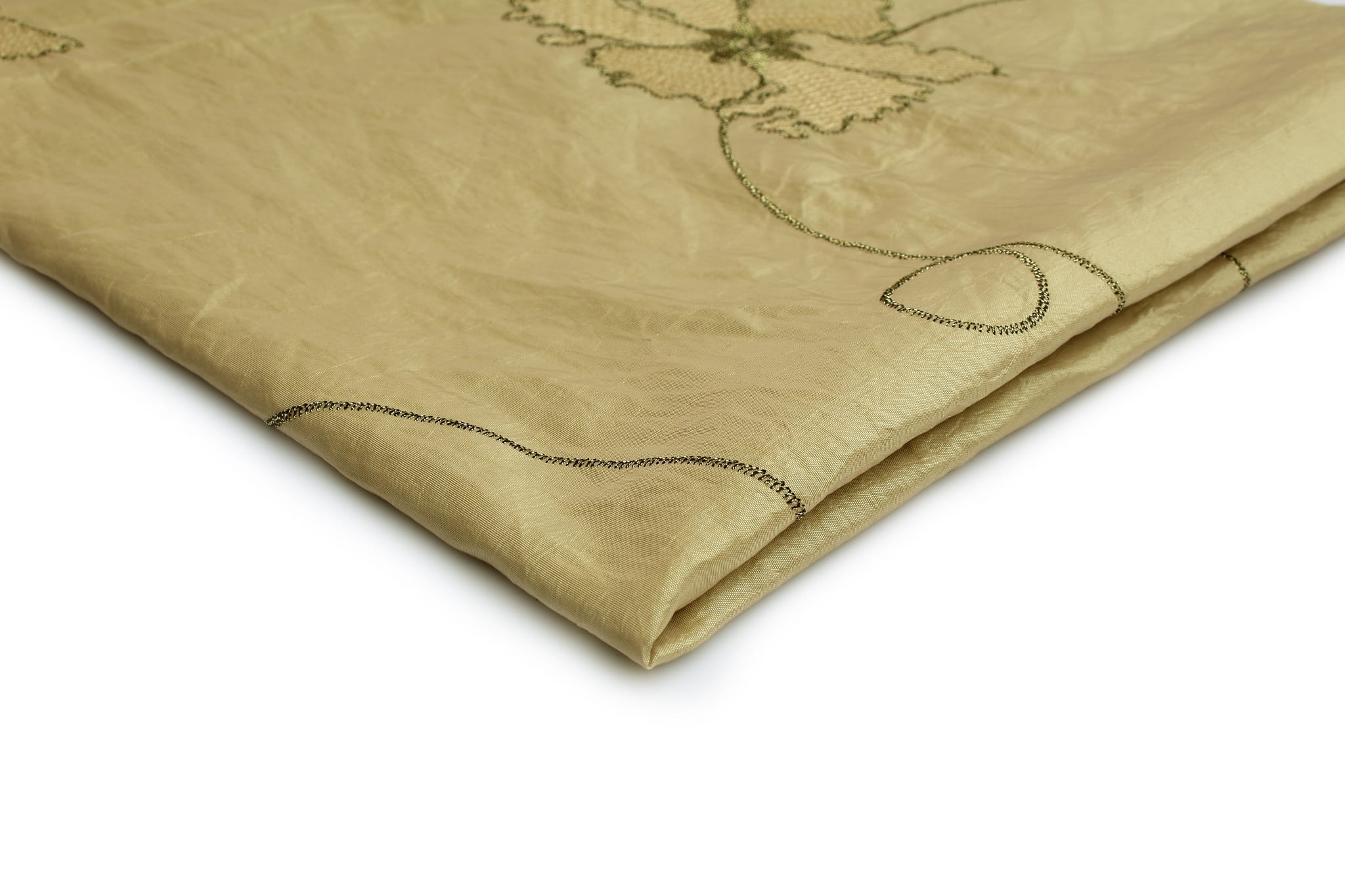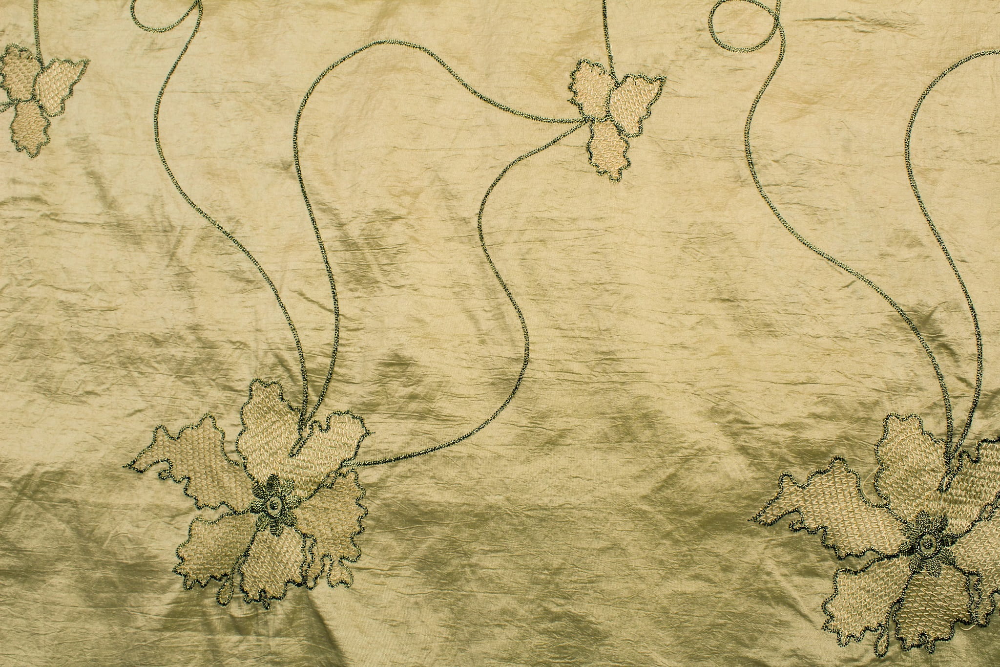 Ein Stoff mit einer steifen und raschelnden Textur und einer glänzenden Oberfläche, die mit Stickereien verziert ist. Taft ist ein sehr einzigartiges und optisch wirksames Material. Das gestickte Muster lässt den Stoff einzigartig und interessant aussehen.