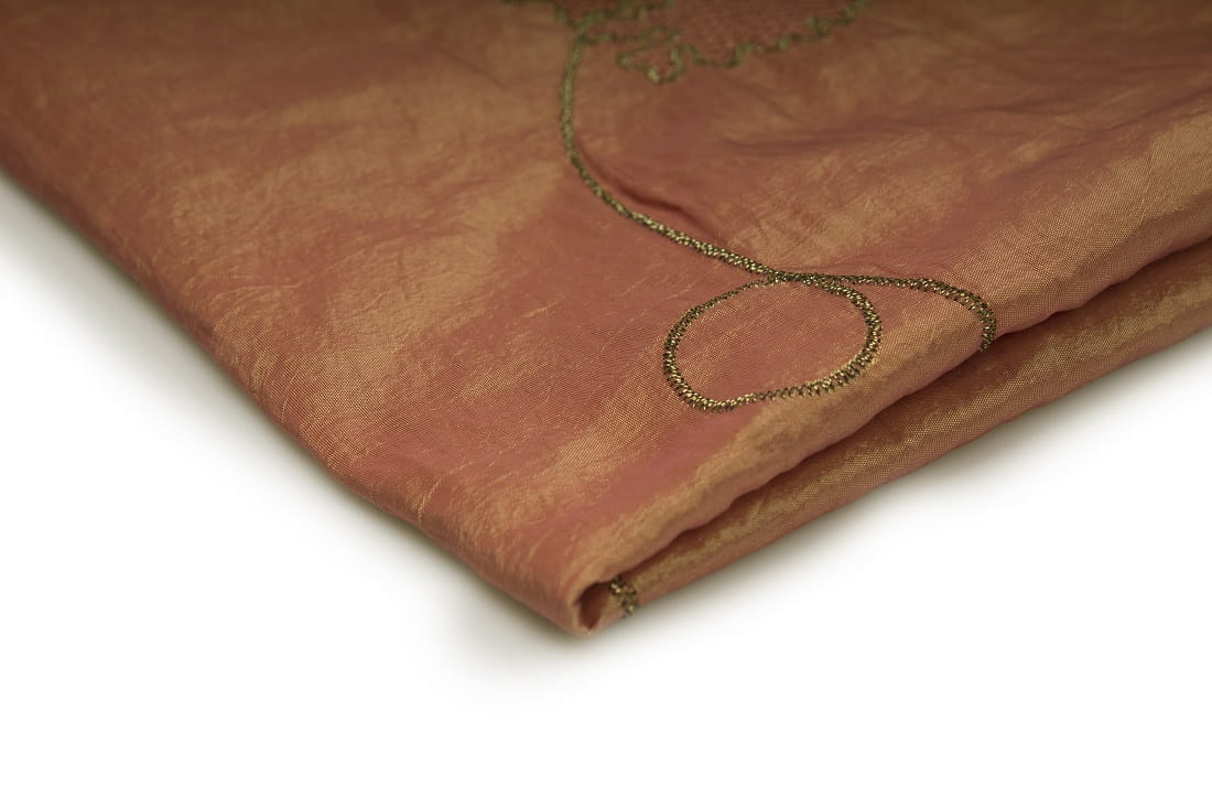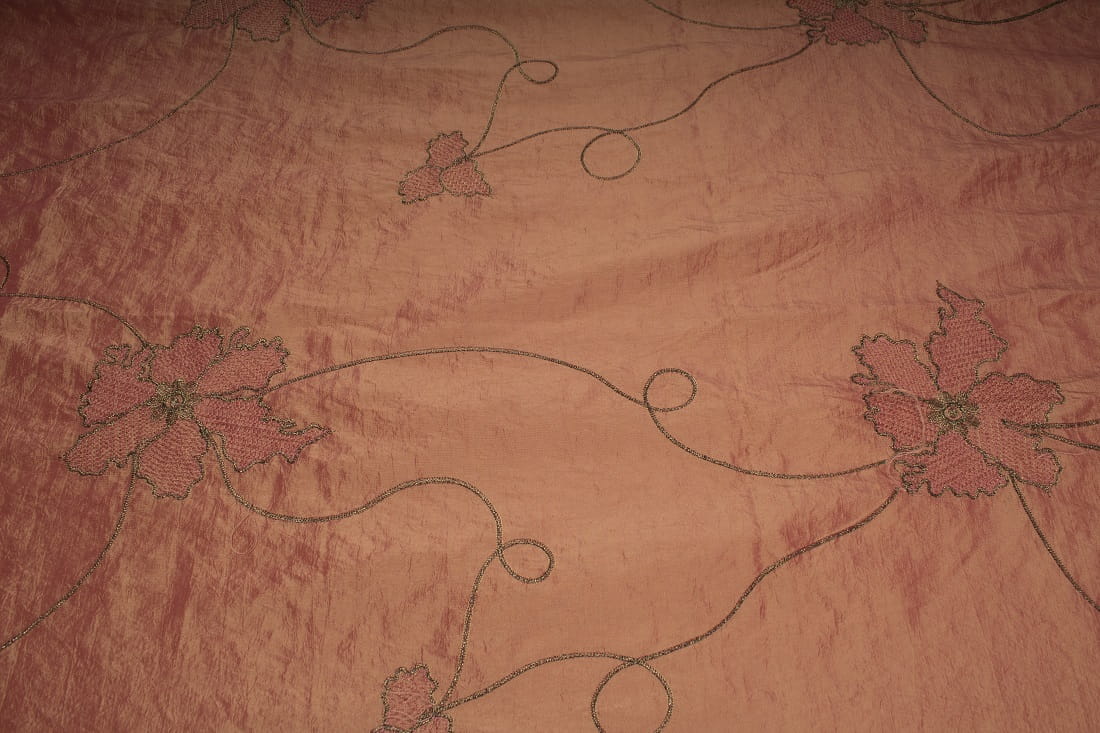 Ein Stoff mit einer steifen und raschelnden Textur und einer glänzenden Oberfläche, die mit Stickereien verziert ist. Taft ist ein sehr einzigartiges und optisch wirksames Material. Das gestickte Muster lässt den Stoff einzigartig und interessant aussehen.