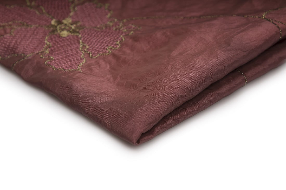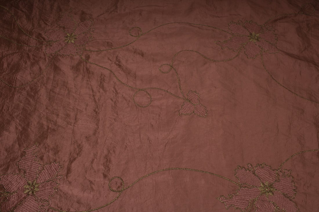 Ein Stoff mit einer steifen und raschelnden Textur und einer glänzenden Oberfläche, die mit Stickereien verziert ist. Taft ist ein sehr einzigartiges und optisch wirksames Material. Das gestickte Muster lässt den Stoff einzigartig und interessant aussehen.