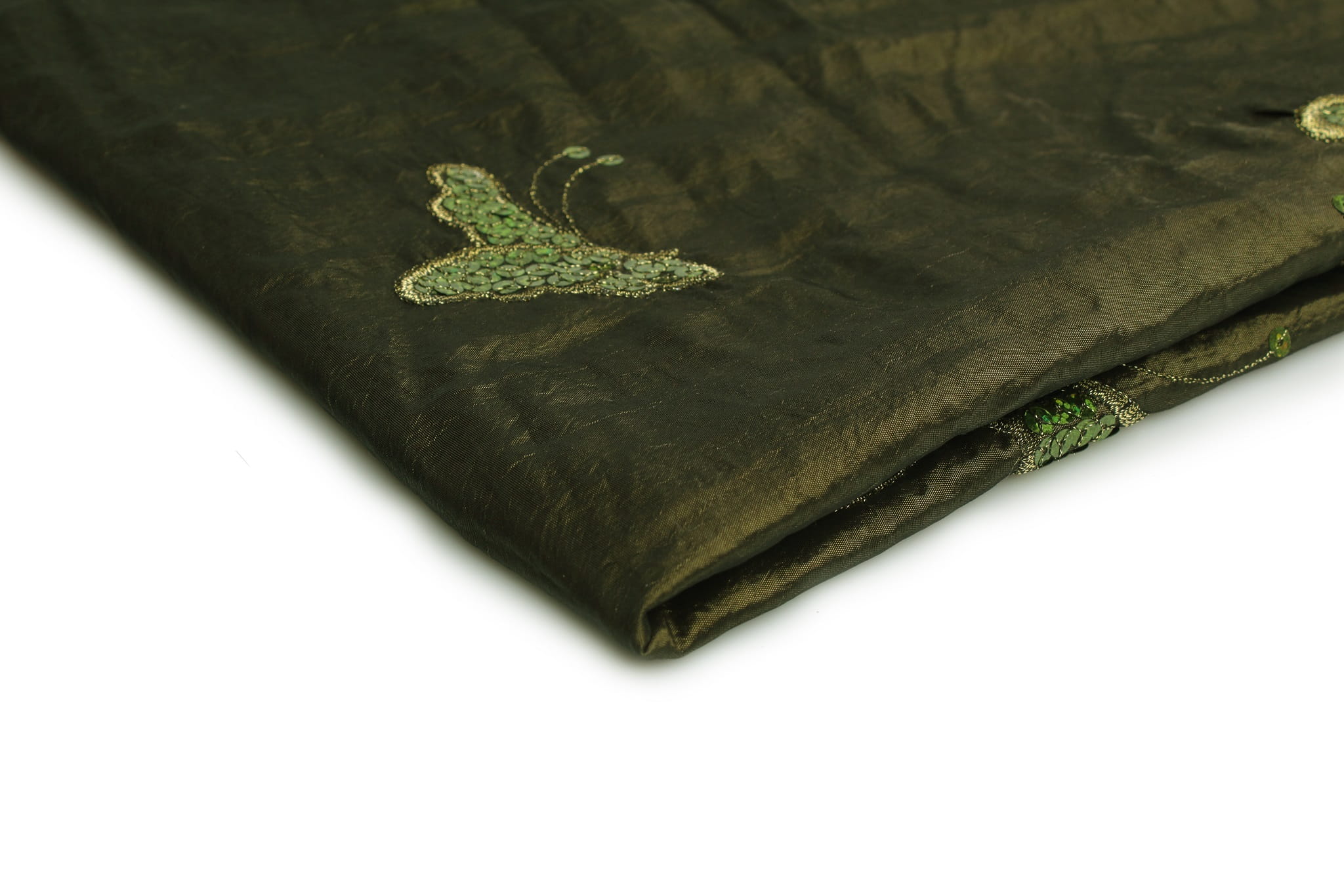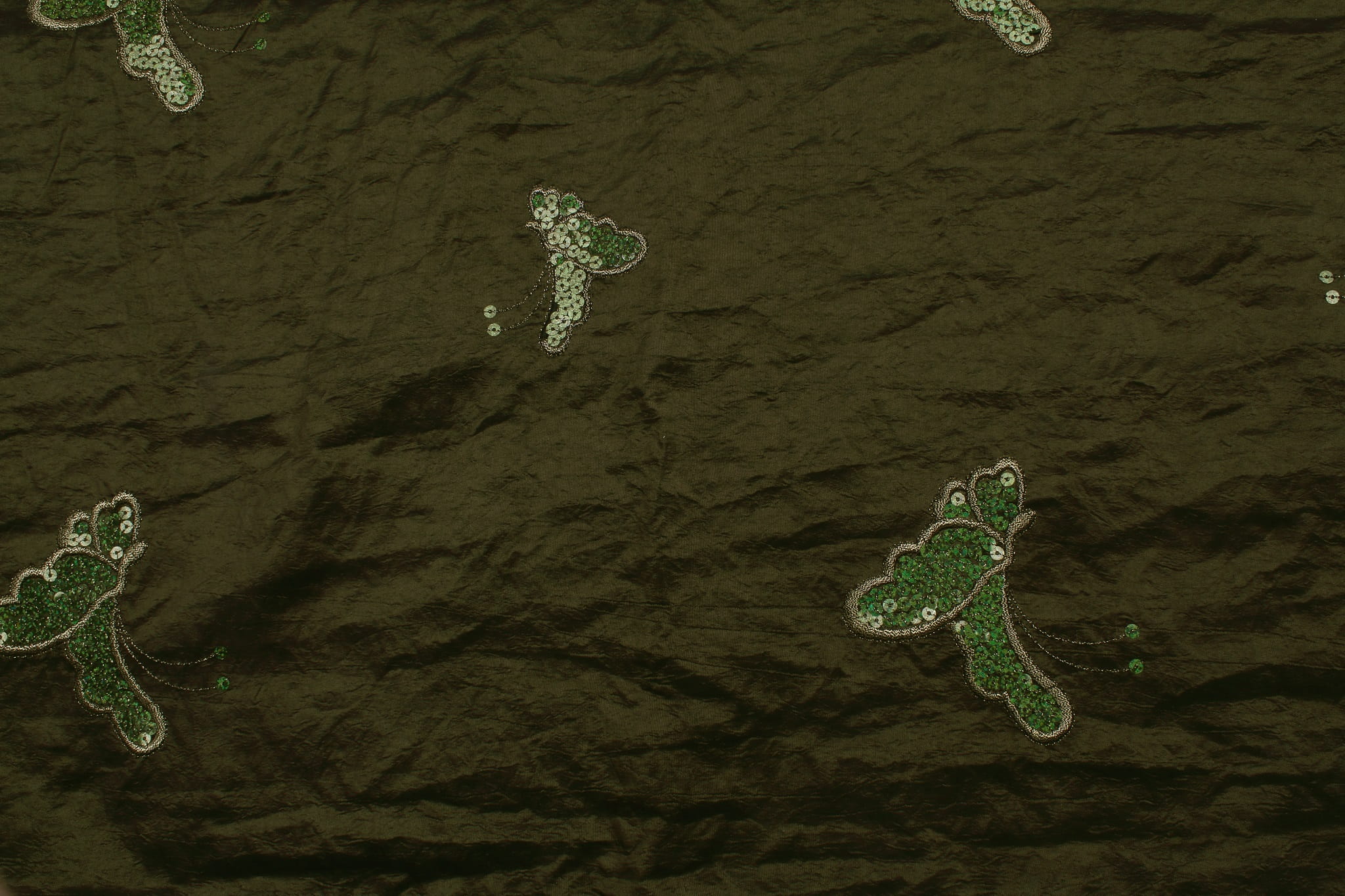 Ein Stoff mit einer steifen und raschelnden Textur und einer glänzenden Oberfläche, die mit Stickereien verziert ist. Taft ist ein sehr einzigartiges und optisch wirksames Material. Das gestickte Muster lässt den Stoff einzigartig und interessant aussehen.