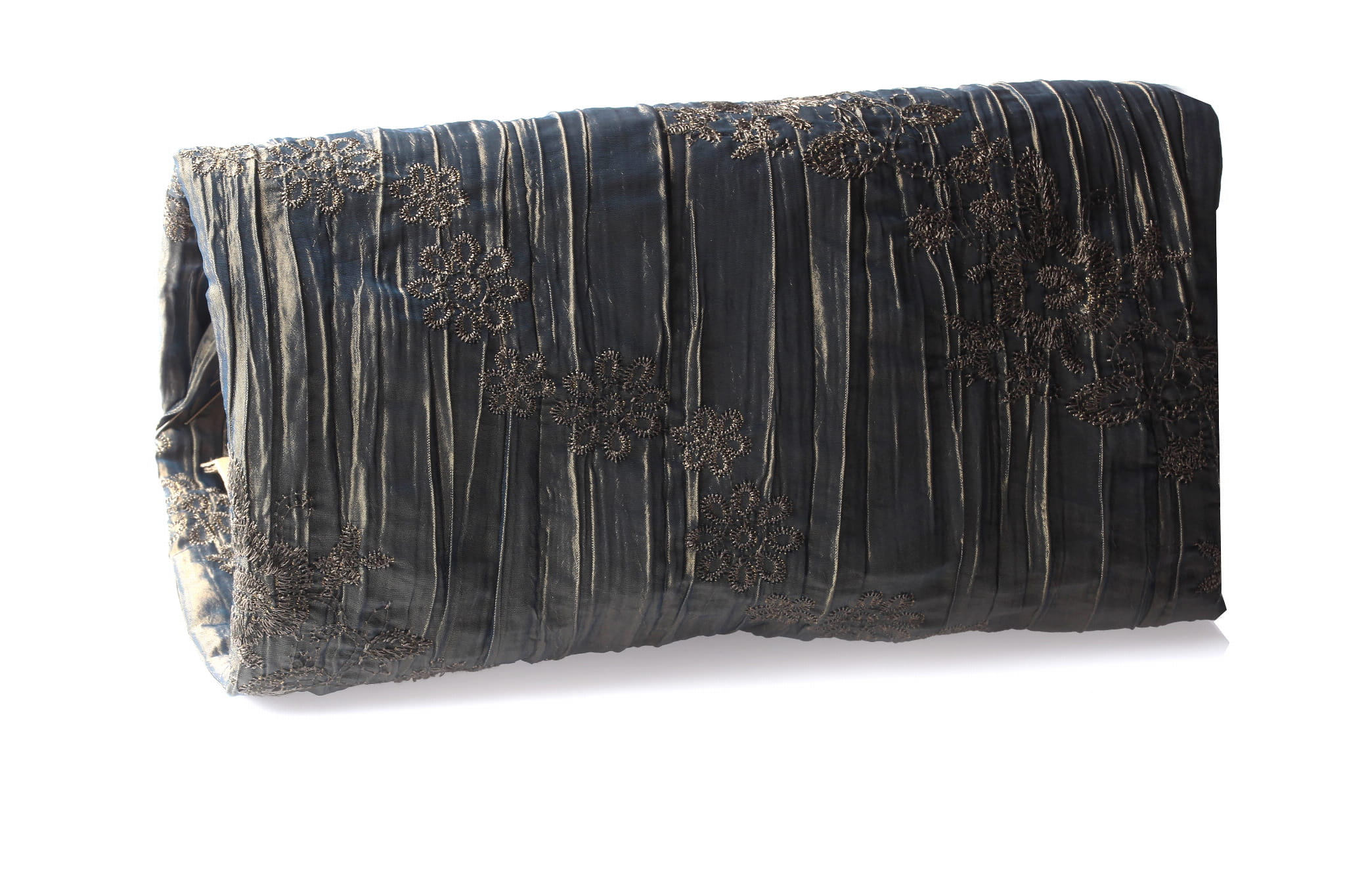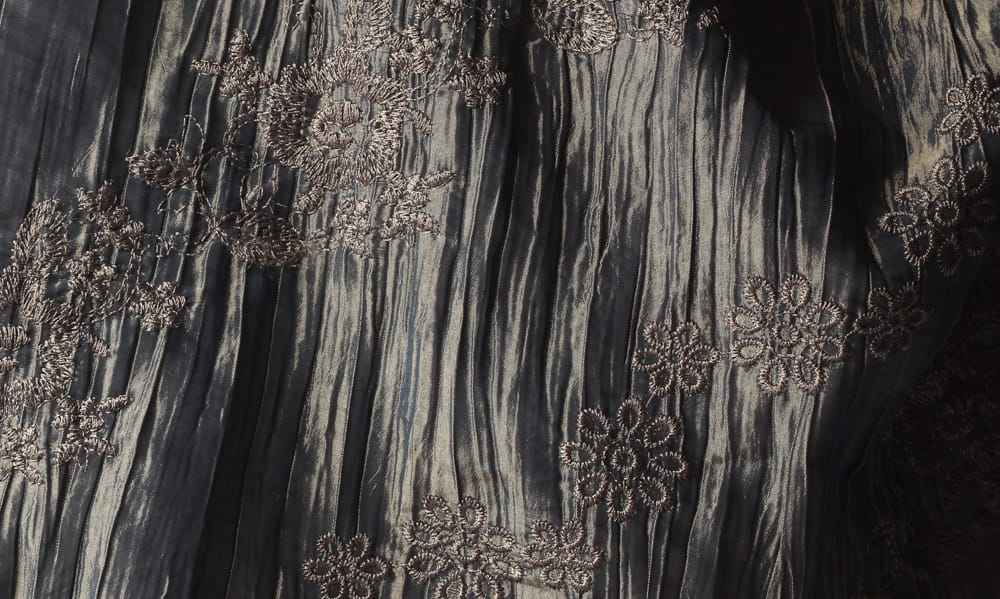 Ein Stoff mit einer steifen und raschelnden Textur und einer glänzenden Oberfläche, die mit Stickereien verziert ist. Taft ist ein sehr einzigartiges und optisch wirksames Material. Das gestickte Muster lässt den Stoff einzigartig und interessant aussehen.