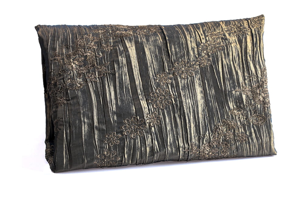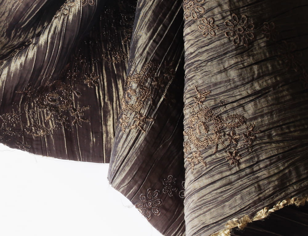 Ein Stoff mit einer steifen und raschelnden Textur und einer glänzenden Oberfläche, die mit Stickereien verziert ist. Taft ist ein sehr einzigartiges und optisch wirksames Material. Das gestickte Muster lässt den Stoff einzigartig und interessant aussehen.