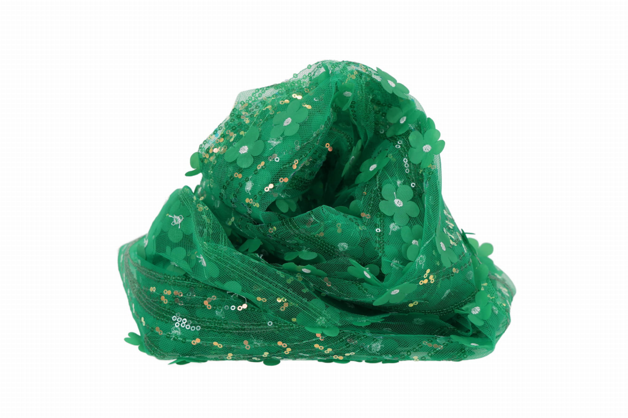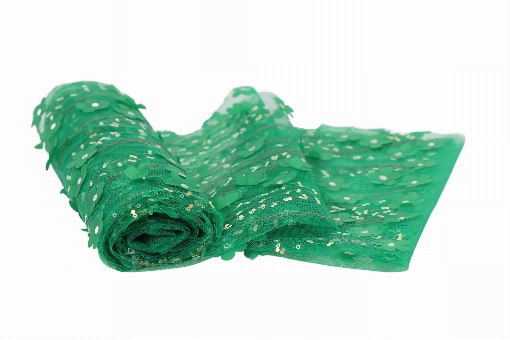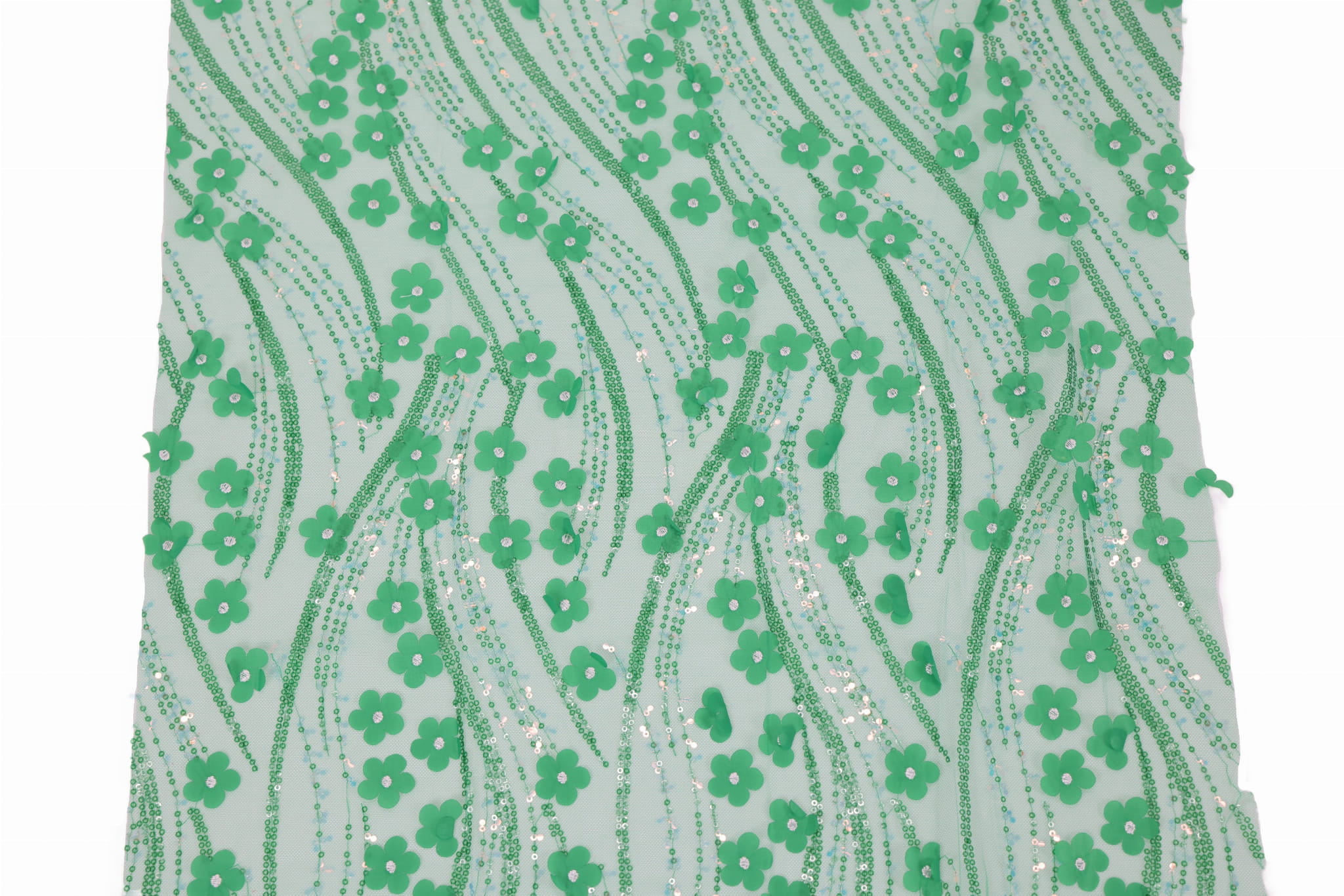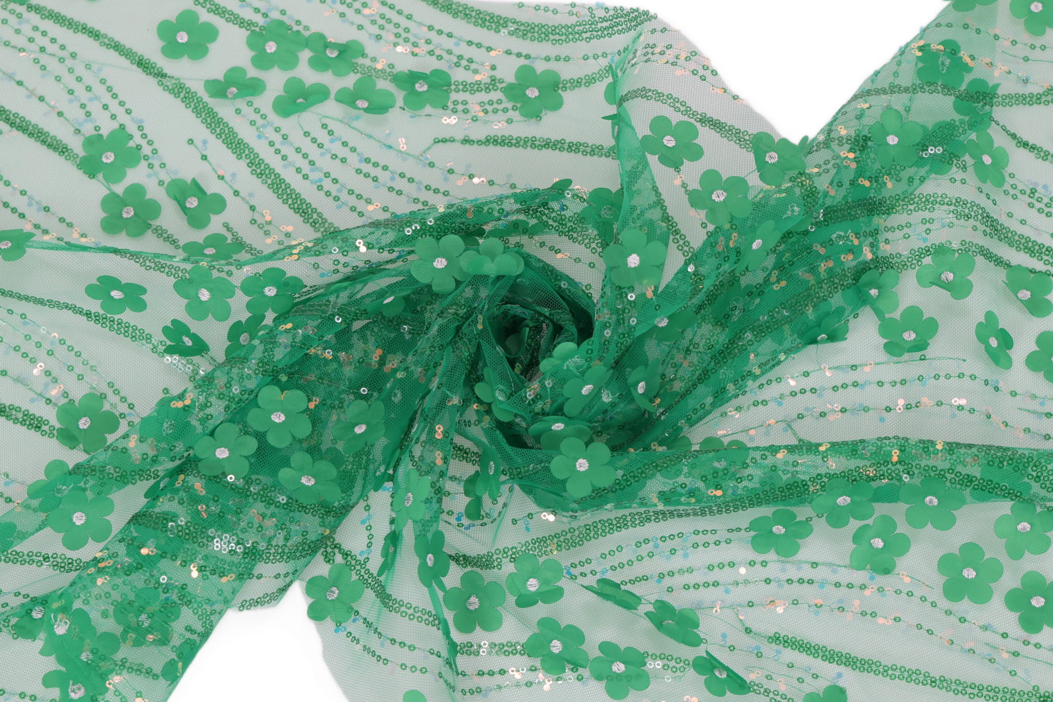 Entdecken Sie unseren Dekorationstüll mit aufgenähten Pailletten und Stoffblumen – ein außergewöhnliches, effektvolles Material mit reicher Struktur, das alle Blicke auf sich zieht und Projekten Eleganz sowie einen räumlichen Charakter verleiht. Ideal geeignet für Mädchenkleider, Abend- und Festkleider sowie für Innendekorationen. Die transparente Tüllbasis in Kombination mit dekorativen Applikationen erzeugt einen luxuriösen 3D-Effekt.