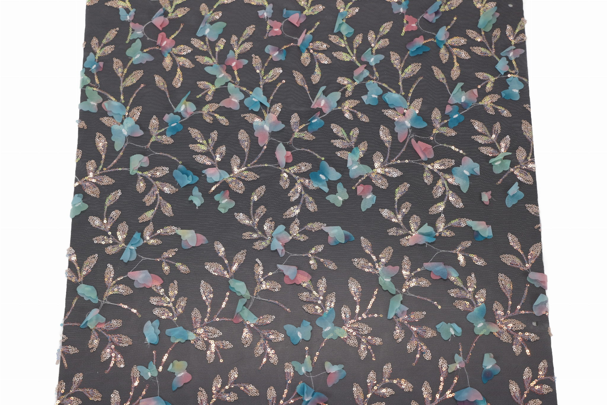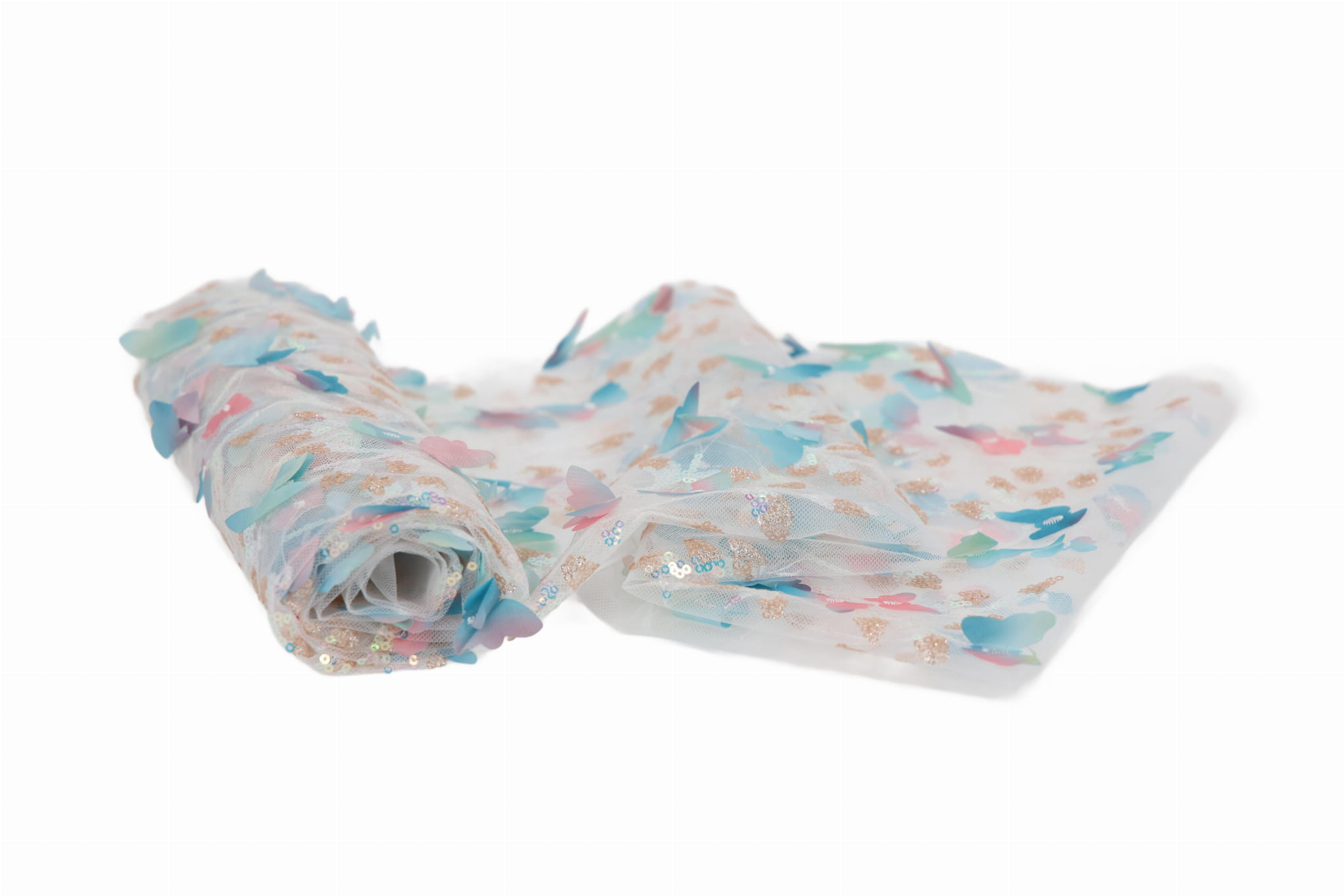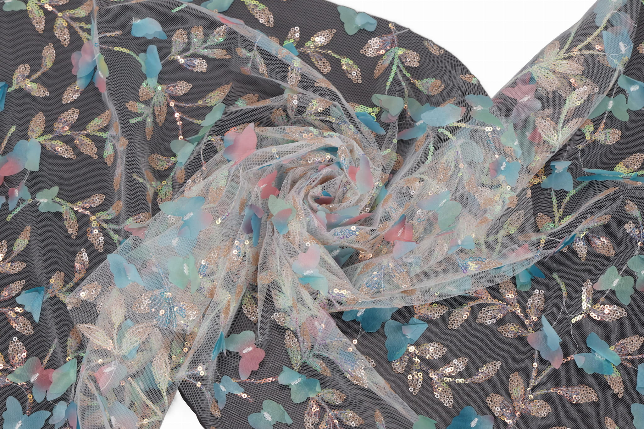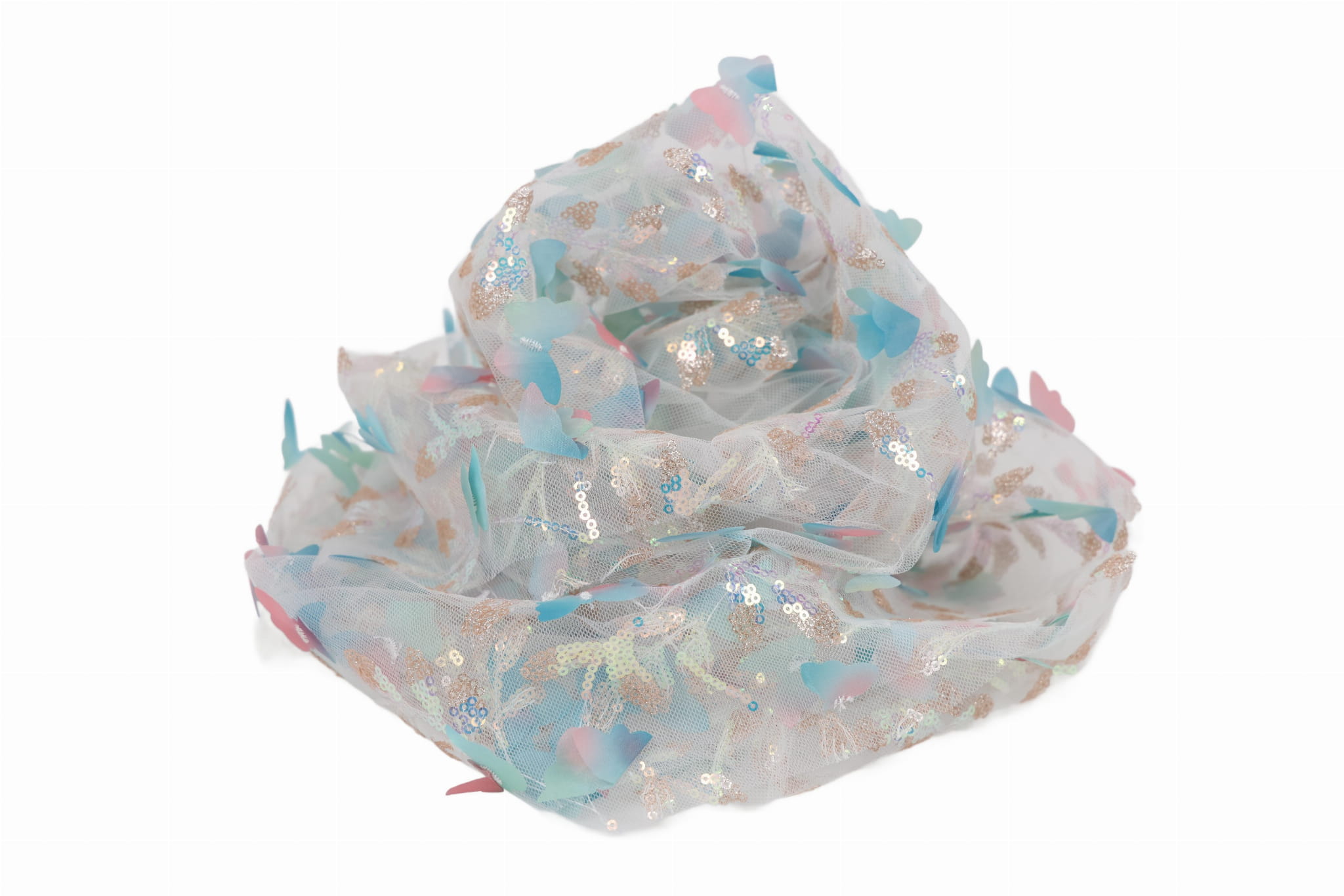 Entdecken Sie unseren Dekorationstüll mit aufgenähten Pailletten und Stoffschmetterlingen – ein außergewöhnliches, effektvolles Material mit reicher Struktur, das alle Blicke auf sich zieht und Projekten Eleganz sowie einen räumlichen, dreidimensionalen Charakter verleiht. Ideal geeignet für Mädchenkleider, Fest- und Abendkleider sowie für Innendekorationen. Die transparente Tüllbasis in Kombination mit dekorativen Applikationen erzeugt einen luxuriösen 3D-Effekt.